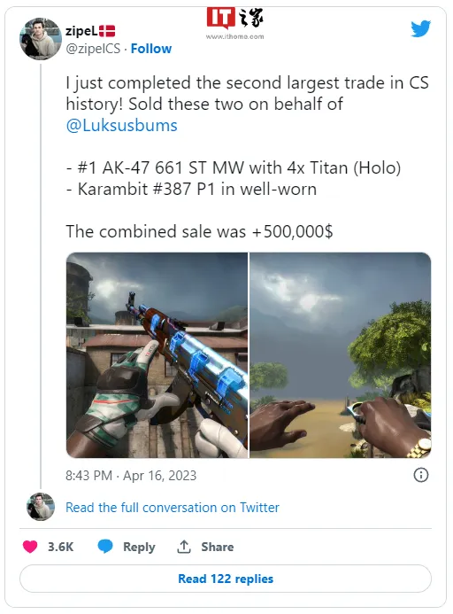 IT之家 4 月 17 日消息,在由 Valve 开辟的第一人称射击团队竞技游戏《CS:GO》中,玩家可以网络和交易业务各种枪械和刀具的皮肤,有些皮肤非常有数和昂贵,被视为收藏品。随着《CS:GO2》的即将到来,《CS:GO》的皮肤市场不绝在暴涨,投资者和收藏家乐意为最有数和最抱负的物品付出越来越高的代价。 近来,CS:GO 皮肤市场上发生了一笔大型交易业务。国外《CS:GO》玩家“zipelCS”发推称,本身完成了 CSGO 汗青上第二大交易业务,将带 4 全息泰坦印花的 AK-47 661 ST MW 与破旧 387 淬火爪刀以 50 万美元(IT之家备注:当前约 343.5 万元人民币)的代价售出。 这两件皮肤都是 Case Hardened(淬火)系列的蓝宝石色,也就是拥有最多蓝色斑纹的版本。这种斑纹非常稀有,只有很小的几率可以大概从游戏中得到。而且,这两件皮肤都是品相较好的 StatTrak(统计追踪)版本,可以纪录利用者的击杀数。 除了皮肤本身的代价外,尚有一个告急的因素让其云云值钱:贴纸。在 AK-47 上,贴有四张来自 2014 年 Katowice(卡托维兹)锦标赛的 Titan(泰坦)全息贴纸。这些贴纸是 CS:GO 中最昂贵的贴纸,每张都值约 6 万美元。它们来自于一个已经遣散的法国战队,由于其稀缺性和汗青意义而倍受追捧。 据IT之家相识,这笔交易业务是由一名丹麦的 CS:GO 玩家和交易业务者 zipeL 牵线搭桥,zipeL 在推特上公布了这一消息,并晒出了两件皮肤的照片,新主人是一位中国收藏家。据悉,这名中国收藏家还拥有其他代价不菲的 CS:GO 皮肤,比如一把 Souvenir(吊唁品)AWP Dragon Lore(龙之传说),值 10 万美元以上。 zipeL 表现,这是他完成的第二大交易业务,也是 CS:GO 汗青上第二大交易业务。第一大交易业务是客岁发生的,当时一名中国收藏家花了 150 万美元买下了一把 Karambit 蓝宝石全新版。 |