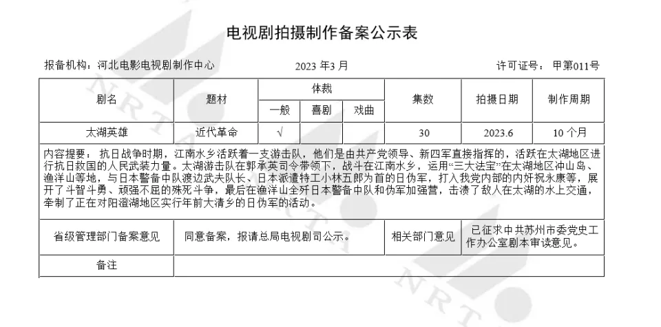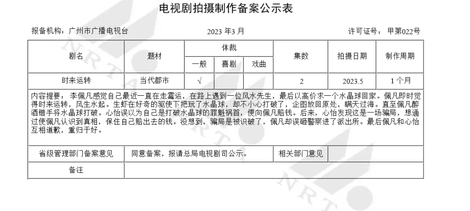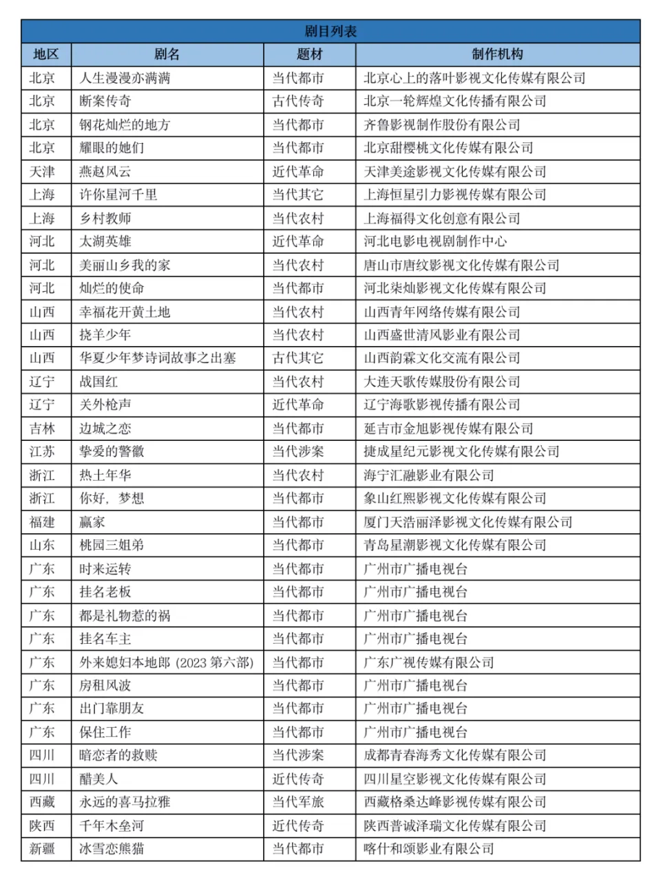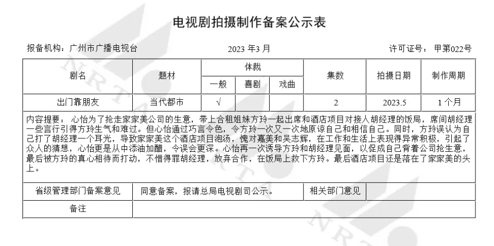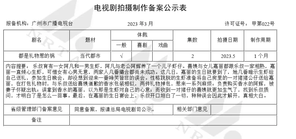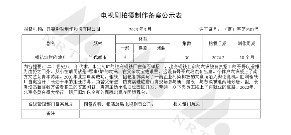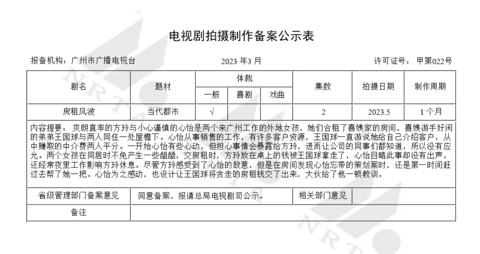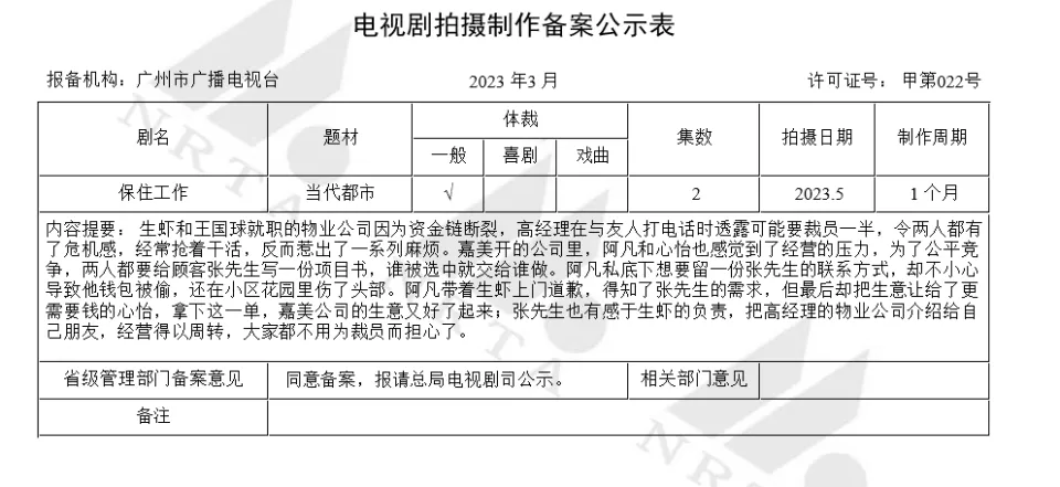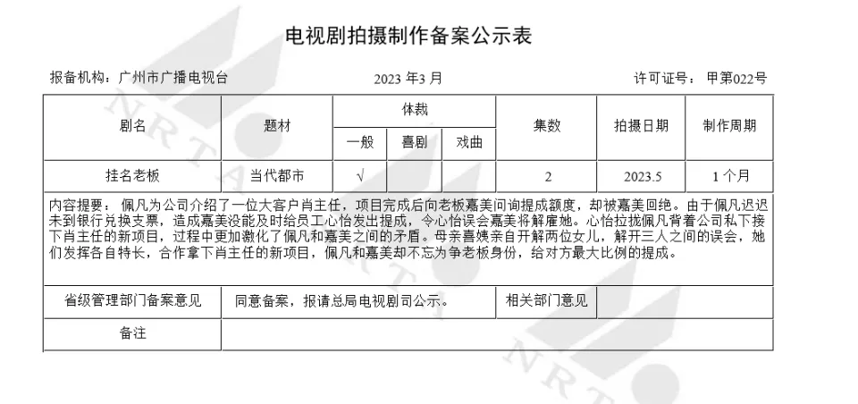 2023年3月,广电总局办公室关于《2023年3月天下拍摄制作电视剧存案公示》的片目共34部,此中今世题材有27部。 从存案的影视公司来看,和颂影业、上海恒星引力、捷成新纪元等着名影视公司均有存案。 今世题材是主流,占比凌驾7成2023年3月,天下电视剧拍摄制作存案公示的剧目共34部、855集。按照题材分别,今世题材27部、619集,分别占公示总数的79.41%和72.4%。此中,今世军旅题材1部30集,今世都市题材17部306集,今世农村题材6部187集,今世涉案题材2部60集,今世别的题材1部36集。 近代题材5部、190集,分别占公示总数的14.71%和22.22%,此中 ,近代传奇题材2部80集,近代革命题材3部110集。 古代题材2部、46集,分别占公示总数的5.88%和5.38%,此中 ,古代传奇题材1部36集,古代别的题材1部10集。 河北影戏电视剧制作中心近代革命《太湖豪杰》广东广视传媒粤语系列家庭轻笑剧《外来媳妇本地郎》存案在2月的存案剧中,重点相干制作中心有10部作品存案,分别是齐鲁影视制作股份有限公司存案的《钢花光辉光耀的地方》;河北影戏电视剧制作中心存案的《太湖豪杰》;广东广视传媒有限公司存案的《外来媳妇本地郎(2023第六部)》;广州市广播电视台存案的《时来运转》《挂名老板》《都是礼物惹得祸》《挂名车主》《房租风波》《出门靠朋侪》《保住工作》。 齐鲁影视制作股份有限公司存案的《钢花光辉光耀的地方》陈诉的是二十世纪八十年代末,永定河边的胜利钢铁厂在莲石镇招工,出身钢铁世家的袁满被负责招工的哥哥以避嫌为由拒之门外。从小在胡同就是“惹事精”的袁满,在父亲袁宝德眼里,远没有哥哥袁培杰有前程。个体户袁满爱上了南方文艺女青年苏柔。2001年北京申奥乐成,钢铁厂因记者苏柔写了一篇企业污染排放的文章而陷入舆论危急。胜利钢铁厂自此拉开了长达十年的搬迁序幕。顶替父亲进厂的袁满进驻唐山湾现场到场新厂建立,与苏柔被迫两地分居。副厂长袁培杰面临数万名老职工的安置题目。袁满自动承包旧址园区开发,领导一众下岗员工踏上了再就业的门路。2022年,北京冬奥会谨慎举行,钢厂旧址以全新的面目出如今国际舞台。据悉,该剧制作周期为10个月,拍摄日期为2024年2月,集数为30集。 河北影戏电视剧制作中心存案的《太湖豪杰》陈诉的是抗日战争时期,江南水乡活泼着一支游击队,他们是由共产党向导、新四军直接指挥的,活泼在太湖地域举行抗日救国的人民武装力气。太湖游击队在郭承英司令领导下,战斗在江南水乡,运用“三大法宝”在太湖地域冲山岛、渔洋山等地,与日本警备中队渡边武夫队长、日本调派特工小林五郎为首的日伪军,打入我党内部的内奸祝永康等,睁开了斗智斗勇、刚强不屈的殊死斗争,末了在渔洋山全歼日本警备中队和伪军加强营,击溃了仇人在太湖的水上交通,管束了正在对阳澄湖地域实验年前大清乡的日伪军的运动。据悉,该剧制作周期为10个月,拍摄日期为2023年6月,集数为30集。 广州市广播电视台存案的《时来运转》陈诉的是李佩凡感觉自己迩来不停在走霉运,在路上碰到一位风水老师,末了以高价求一个水晶球回家。佩凡即时以为时来运转,风生水起。生虾在好奇的驱策下把玩了水晶球,却不警惕冲破了,计划放回原处,瞒天过海。直至佩凡醉酒错手将水晶球冲破。心怡误以为自己是冲破水晶球的罪魁罪魁,便向佩凡赔钱。厥后,心怡发现这是一场骗局,想通过使佩凡熟悉到原形,保住自己赔出去的钱。没想到,骗局是被看破了,佩凡却误砸警员进了派出所。末了佩凡和心怡相互致歉,重归于好。据悉,该剧拍摄日期为2023年5月,集数为2集。 广州市广播电视台存案的《挂名老板》陈诉的是佩凡为公司先容了一位大客户肖主任,项目完成后向老板嘉美问询提成额度,却被嘉美谢绝。由于佩凡迟迟未到银行兑换支票,造成嘉美没能实时给员工心怡发出提成,令心怡误会嘉美将开除她。心怡拉拢佩凡背着公司私下接下肖主任的新项目,过程中更加激化了佩凡和嘉美之间的抵牾。母亲喜姨切身开解两位女儿,解开三人之间的误会,她们发挥各自专长,相助拿下肖主任的新项目,佩凡和嘉美却不忘为争老板身份,给对方最大比例的提成。据悉,该剧制作周期为1个月,拍摄日期为2023年5月,集数为2集。 广州市广播电视台存案的《都是礼物惹的祸》陈诉的是叔育有一女阿凡和一男生虾,阿凡与老公阿辉养了一个儿子虾仔。喜姨与女儿嘉丽都跟乐叔一家相熟,嘉丽不停倾慕生虾,惋惜女故意男偶尔,两家人几番拉拢都尚未乐成。这几日,嘉丽的生日就要到了,她几番暗示生虾给自己送礼,到场生日晚会,却没想到迎来一番啼笑皆非的误会。性格跳脱的生虾准备将自己房里的一对猪猪公仔送给嘉丽,在打包礼物时,与乐叔送给喜姨致歉的香水包装相似,两件礼物偷换,惹来一系列贫困:负责购买香水的阿辉,被妻子猜疑出轨;误拿到香水的嘉丽,以为那是生虾对自己的心意;而收到一对猪仔的喜姨就更加气愤了,找到乐叔诘问,才明确了是怎么一回事。末了,在嘉丽的生日宴会上,乐叔开口坦率了统统,种种误会因此才解开,原形明确。据悉,该剧制作周期为1个月,拍摄日期为2023年5月,集数2集。 广州市广播电视台存案的《挂名车主》陈诉的是邻人周伯常常夸耀自家有私人车,李佩凡受不了便煽惑丈夫吴志辉用名下的面包车回一个下马威。但是吴志辉只是一
