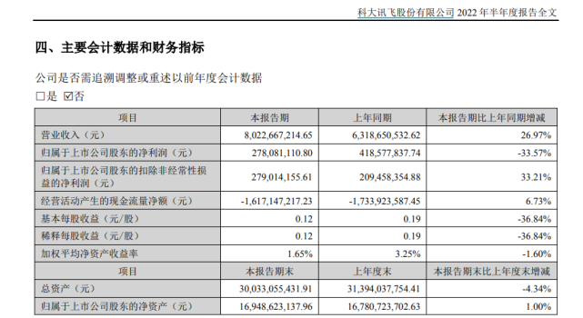 8月22日,科大讯飞发布2022年半年度陈诉,此中财务数据表现,上半年实现业务收入为80.23亿元,同比增长26.97%;归母净利润2.78亿元,同比下滑33.57%;根本每股收益0.12元,同比淘汰36.84%。 陈诉表现,净利润降落告急系公司持股的三人行、寒武纪等金融资产因股价颠簸导致公允代价变更收益金额较上年同期淘汰2.73亿所致。 盘面上,制止本日收盘,科大讯飞涨0.41%,报收39.10元,换手率0.42%。 |