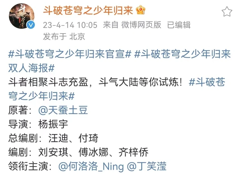 信赖很多人都听说过斗破苍穹,究竟是网文界顶流作品,厥后更是改编成了漫画动漫以致于电视剧。只不外电视剧固然出了,还是由吴磊林允如许着名的新生代演员主演的,但是很多人却不买账,乃至于这部电视剧可以说开播即被群嘲,被很多人说成是斗气化马。 由于开播第一集就闪瞎了很多人眼睛,一群斗尊斗圣级别的强者,居然骑马去打魂殿。要知道,在斗破苍穹原著中,到达斗王田地就可以都斗气化翼了,马对于内里的人物来说,根本用不着。 也因此开播就劝退了很多人。只是让我没有想到的是,斗破苍穹电视剧第一部播出完毕之后,居然另有第二部,而且现在还官宣了。那么多的不说,下面各人就来看看吧。 一,斗破苍穹第二部曝光,吴磊林允都被换从官方微博来看,斗破苍穹第二部官宣定名为斗破苍穹之少年归来,在官宣的同时,官方还放出第一支预告,看如许子,这部电视剧是已经拍完了,就等一个符合的时间定档了。 不外斗破苍穹第二部是官宣了,但是男女主演员却是都换了。此中男主演员,也就是萧炎饰演者原来是吴磊,现在呢?却是换了一个不着名的演员何洛洛。 在此之前我个人没看过他出演的电视剧,也没听说过他这个演员。不外这个演员论年事和颜值倒是挺得当萧炎,而且看预告,这是一个很有生气和阳光的演员,以是还是可以等待一下的。 女主演员也就是萧薰儿饰演者,原来是由林允饰演的,现在却换成了一个名叫丁笑滢的演员。 比起何洛洛,这个演员我个人倒是认识,由于她曾经出演过雪中悍刀行中的青鸟,其时她还因此火了,劳绩了不少粉丝。这位演员颜值是够了,气质也很贴萧薰儿,只是打戏不清楚,究竟当初雪中悍刀行就是被打戏拖累了,盼望这位玉人演员能把萧薰儿给演好。 二,导演编剧也已公布,主打迦南学院篇现在随着斗破苍穹第二部公布,导演和编剧也随之公布了。此中导演乃是杨振宇,编剧却有五个之多,还分总编剧和编剧。此中总编剧两个,分别是汪迪和付琦,在两人之下的编剧则是刘安琪,傅冰娜和齐梓侨。 整个预告看下来,可以确定一件事,那就是斗破苍穹第二部主打的乃是迦南学院篇。由于预告中无论场景还是人物都是只有迦南学院篇才会有的。其他的人物比如雅妃海波东小医仙,是看不到的。 关键是预告中出现了只有迦南学院天焚炼气塔内里才有的陨落心炎,那就可以完全确定了,斗破苍穹第二部重要陈诉的就是萧炎在迦南学院中的各种履历。 巧的是,斗破苍穹动漫现在也讲到了迦南学院篇,这一来就可以形成一个互动。不出不测的话,斗破苍穹第二部将于暑期播出,由于这个时间正是很多人放假的时间,也偶尔间看这部电视剧。 三,殊效本心却遭一众网友抵抗从官方放出的预告来看,这部电视剧殊效可以说很本心,尤其是预告中展示的陨落心炎,看着就很有克制感。比起斗破苍穹第一部,这斗破苍穹第二部的殊效可以说好了不止一点半点。只是出乎我意料的是,这部电视剧刚官宣,刚放出第一版预告,就遭一众网友抵抗。至于这是为什么,看下来只由于这两个缘故起因。 第一个就是这些年的动漫改网文改真人剧集没有几个好的,斗破苍穹第一部就是前车可鉴。有斗破苍穹第一部在前,在很多人看来斗破苍穹第二部很大概率拍不好,那还不如不拍。 第二个就是已经有斗破苍穹动漫了,真的不消再拍斗破苍穹电视剧了。究竟斗破苍穹原著的很多东西电视剧都没法拍出来,但是动漫却可以,比起斗破苍穹电视剧,很多人更喜悦目斗破苍穹动漫。不外不管怎么说,斗破苍穹第二部是很快就要和各人晤面了,我个人以为还是可以去看看的,也只有看了才华知道好不悦目。 那么本日就说到这里,各人对此怎么看呢?接待讨论和留言。 |