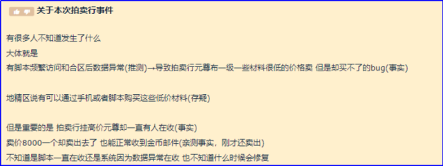 8月22日,有玩家在论坛发帖称《魔兽天下》中的拍卖行出现了庞大BUG,大量玩家利用该BUG狂刷十几亿金币,导致拍卖行告急关闭。 8月21日有B站UP主“我的猫叫阿笨”投稿视频称,在购买一种名为“元尊精粹”的质料时有大量远低于市场价的代价在拍卖行举行售卖。该质料直接贩卖给NPC的代价是50金,在拍卖行中却有大量代价标注1银的质料在举行售卖,但平凡玩家根本无法通过正常渠道购买,点击购买后只体现【内部拍卖错误】或【该物品不存在】。但购买代价偏高的质料,却仍可以正常买卖业务。 固然这些质料无法通过正常本领拍下,但却可以通过脚本或手机拍卖行等方式举行购买。于是有大量玩家以1银的代价购买了本来代价至少50金的“元尊精粹”。随后将该质料再次上架或直接卖给NPC以此牟利。 该BUG导致大量玩家通过购买-卖出质料的方式刷取大量金币,随后再将金币通过拍卖行等本领举行转移。部分玩家在论坛上晒出了“战果”:上千亿的金币余额。 据推测,该BUG大概与近期拍卖行合区和脚本频仍访问所导致的数据非常有关。视频UP主“魏斌打怪兽”就发视频体现自己在拍卖行中上架的物品剩余时间酿成了49710天。 制止发稿时,有玩家发帖体现现在拍卖行已经被告急关闭,但官方仍未对此变乱发表任何公告,该BUG的后续处置惩罚仍需等候官方的进一步声明。 |