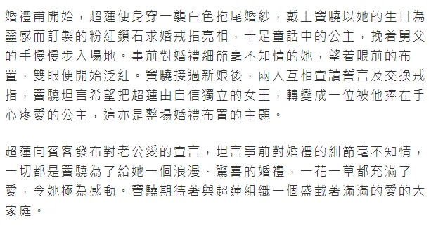 4月18日,何超莲和窦骁在巴厘岛举行世纪婚礼,二人来往4年末着花效果。 二人在18日中午公开了中式婚礼照,何超莲手戴三对龙凤镯,低奢优雅,一改澳门何家的贵族风格,三太也没有一身珠光宝气,只是戴了翡翠钻石项链和耳环,未喧宾夺主。 何超莲和窦骁晚上又公开西式婚礼,在家人的祝福下热吻,无比浪漫。 他们分享了十多张照片,固然全部都是大图,却没有一张可以看清楚钻戒,不知是偶然之举,照旧故意潜伏呢?18日晚,在场的媒体曝光二人婚戒,原来是一枚粉钻,样式相对简约,但寓意不简单,代表何超莲的生日。 何超莲的生日是5月9日,因此有两种大概,一种是钻戒刻着0509的字样,别的一种是钻戒重5.09克拉,后者的大概性极大。 如今,何超莲和窦骁都没有回应钻戒到底潜伏了什么爱情暗码,原形有待二人日后去分析。 别的,有在场的来宾体现,何超莲和窦骁都哭了,局面令人动容。 而从何超莲公开的西式婚礼照片来看,此中藏着不少泪点,尤其是最告急的出嫁部分,本应由赌王送亲,赌王不在则由三太负责,但三太让哥哥送女儿出嫁,一方面是对女儿的痛爱,另一方面是体现女方家庭连合、有家人撑腰,渴望婆家可以爱惜。 婚礼摆设颇有讲求,上方搭建了玻璃天幕,一同欣赏日月星辰,中央是一棵绿色大树,代表二人枝繁叶茂,树上挂着绿色植物以及白粉鲜花粉饰,当阳光穿透时洒下斑斓的光影,舞台中央的水池上搭建了一座桥,中央放着一朵莲花代表何超莲。 在场的香港记者透露,婚礼的统统计划以及婚戒都是窦骁一个的想法,何超莲根本不知情,两人交换钻戒时,窦骁的誓言是渴望把何超莲由自负独立的女王,变化成一位被她捧在手中央疼爱的公主,这是整个婚礼的主题。 何超莲感动落泪,发布对老公的宣言,坦言事前对婚礼的细节绝不知情,统统都是窦骁为了给她一个浪漫、惊喜的婚礼,一花一草都布满了爱,令她极为感动。 港媒一天前曾爆料指,赌王三房全员缺席婚礼,效果恰恰相反,不光三太参加送女儿出嫁,姐姐何超云及龙凤胎弟弟何猷启也在现场,而三太不停站C位,家庭职位不问可知。 婚礼现场犹如童话故事,浪漫且温馨,显着已经来往了4年,二人却好像不停亲不敷,以各种角度接吻,羡煞旁人。 |