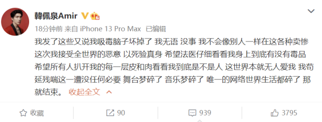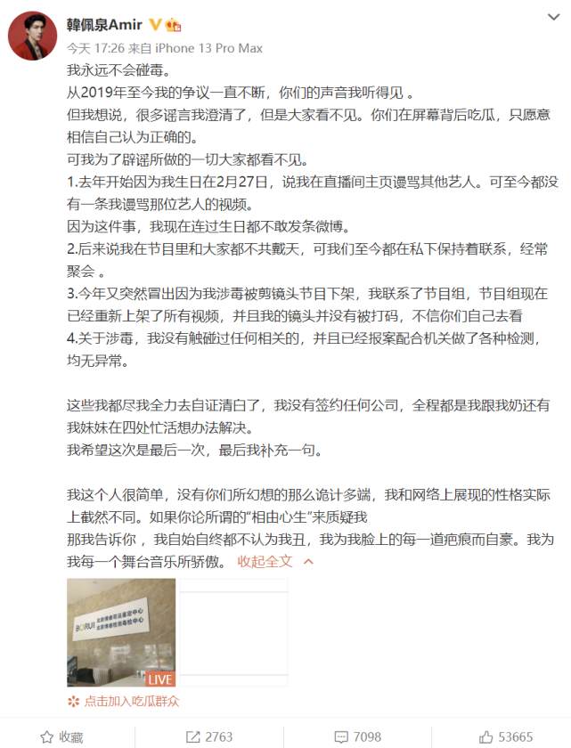 视频:韩美娟直播跳楼?身患烦闷长期被网暴,末了留言让人泪目,时长约1分3秒 8月22日,因到场创造营2021而从网红界乐成出圈的歌手韩佩泉接连发文否认涉毒听说,遗憾的是,网络暴力并没有就此克制,很多网友在其品评区内让他向此前一起到场创造营的艺人邵显着致歉,言语中乃至布满了很多恶毒的责备谴责和唾骂。更有网友PS了韩佩泉最爱的奶奶的遗照,令韩佩泉从愤怒变为绝望,公开发文称“这次我继承全天下的恶意,以死验真身。渴望法医过细看看我身上到底有没有毒品。”,疑似有做出极度选择的计划,令网友们非常担心。 他还发文写道:“别骂我奶,我消散,怎么都好,求你们了 ”,看得出他已经非常无助,不少网友们也对韩佩泉的近况布满担心。 随后韩佩泉开通直播,回应网友各种质疑,亮相称,自己接下来不会再到场节目,坦诚回应各人的标题。谈及自己身世以及读书时受到的陵暴,韩佩泉不由得痛哭落泪,还体现,自己死了之后,大概统统都一了百了,第二天的时间,各人都会来听他的歌,开始吊唁他。 他还在直播间体现,自己未来会包管让奶奶过上很好的生存,也透露他有了自己爱的人。随后体现,那就如许吧。直播间内,粉丝们都纷纷劝他要岑寂,没想到的是,韩佩泉转身走到窗口,直播间内能听到疑似跳楼的声音。 随后直播间便剩下了很长时间的静止画面。 直到22日晚23点41分,“安全北京”在品评区发声回应:“经警方工作,已经将意图轻生者安全救下”“职员安全”,担心他的网友们终于松了一口气。 韩佩泉出生于2000年,他的人生比很多人要艰巨很多,出生时便是唇腭裂。母亲由于家景欠好,加上韩佩泉天生唇腭裂,选择了离家出走。父亲则大部分时间都是在外地打工,也因此,韩佩泉大部分时间都是和奶奶在一起生存,和奶奶感情非常深厚。 韩佩泉自幼喜欢唱歌,2019年,他在短视频平台上以反串“韩美娟”形象走红, 依附一句“百因必有果,你的报应就是我”敏捷出圈。 2021年,韩美娟作为学员到场综艺《创造营2021》,最停止步于第二赛段55进33中被镌汰,得到第40名。不外,其幽默而富有个性的体现还是给观众留下深刻印象。 8月22日,创造营2021节目下架又上架,引发热议。另有网友爆料称,疑似是和韩佩泉吸毒有关,“韩佩泉涉毒”词条也随之出现。《令民气跳的舞台》中韩佩泉的镜头被剪,内容被权限。 对此,韩佩泉工作室发声明辟谣,亮相自己从未涉毒,网上言论为恶意诽谤,与究竟不符。将对不实言论举行取证,请不实言论发布者及传播者立即删除、克制发布、拒绝传播干系信息。 韩佩泉本人也接连发文,证明自己特意去做毒品检测,并没有吸毒,也永久不会碰毒品。还表明确他在节目中,与艺人邵显着之间的种种争议,遗憾的是,品评区内,仍然是布满了各种恶毒的责备谴责。 无论怎样,渴望韩美娟能度过这一难关,也渴望网友们能克制网络暴力! |