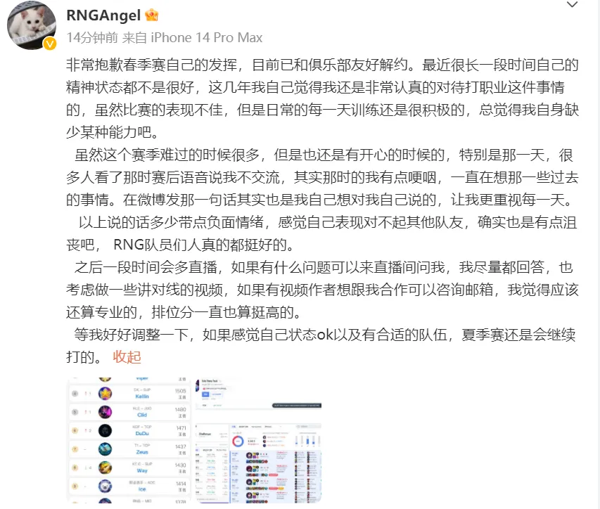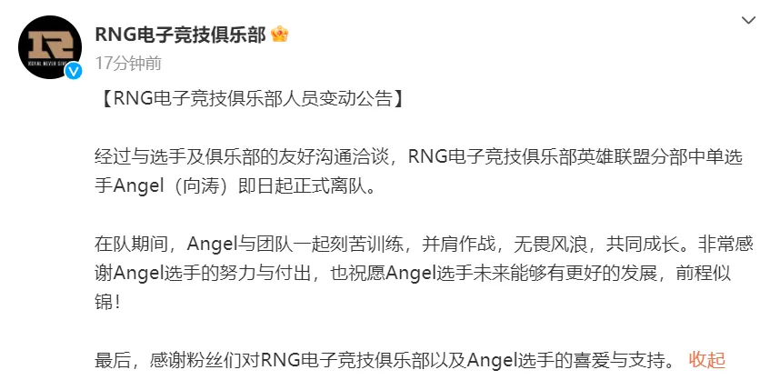 LPL春季赛转会期第一天,没想到是RNG率先打响了官宣离队的第一枪。在18号晚上,RNG忽然官宣中单Angel离队的消息,随后Angel本人也发长文回应了这件事变。 RNG官宣原文如下,体现颠末与选手的友爱沟通,Angel克日起正式离队,随后回首了Angel在RNG这半个赛季的积极和受苦,感谢了他的付出,末了则是祝福Angel将来会有更好的发展。 在RNG发布官宣消息后,不少粉丝也懵了,有人质疑RNG是不是准备遣散了?也有人渴望RNG和Angel扫除合约,是已经找好了补强的选手,另有人直接喊话,让Cryin返来吧,他擦?鲱恰当RNG的中单,更有粉丝疑惑和Angel签了3年合约,怎么这么快就解约了? 随后Angel本人也发长文回应了这件事变,他上来就先致歉,体现自己春季赛发挥得欠好,现在已经和RNG友爱解约,之后体现近来自己的精力状态不是很好,固然很积极很积极训练,但角逐照旧体现不佳,感觉自己缺少某种本领。然后回首了这个春季赛,体现惆怅的时间很多,但开心的照旧那一天,那天语音自己没怎么语言,着实是有点哽咽了,在微博发的那句话也是渴望自己器重每一天。 之后Angel再次致歉,体现自己的体现对不起RNG其他队友,RNG的队友人都很好,末了谈到了自己夏日赛的计划,体现会多多直播,调解状态,假如状态不错而且找到了符合的战队,夏日赛照旧会继承打角逐的。 说真话Angel在RNG打得确实一样平常,但是才打了半个赛季就解约了,也确实有点没想到。关键是签了很多年,这么忽然解约,感觉照旧有点莫名其妙,不像RNG的风格。而且前几天有传言说汤圆去AL试训了,这么看来,RNG夏日赛是要彻底更换中单了,不愿定会让汤圆来打首发,毕竟汤圆在春季赛的体现各人也看到了,RNG须要那种带节奏的中单,打线的刷子型中单不恰当RNG。 说回Angel,S10天下赛的体现应该没有人不平,本以为S10天下赛会是Angel崛起的开始,没想到已经是顶峰状态了,反面体现渐渐泯然众人,之后就是越打越差,感觉Angel重要照旧心态出标题了,太在意舆论了,角逐中打得很怂,怕背锅,明显不喜欢游走,也不会玩游走的体系,但是又要逼着自己去游走,偶然候就是坑自己坑队友,越做越错。而且到现在还在提那一天,也真的太在乎了,感觉成心魔了。 这种心态稳定的话,夏日赛就算找到战队,感觉也不会打得很好。S10谁人斗志昂扬的Angel,不知道还会不会返来了。 那么,对于这件事变,你们有什么想说的吗?欢迎在品评区留言探究。 |
