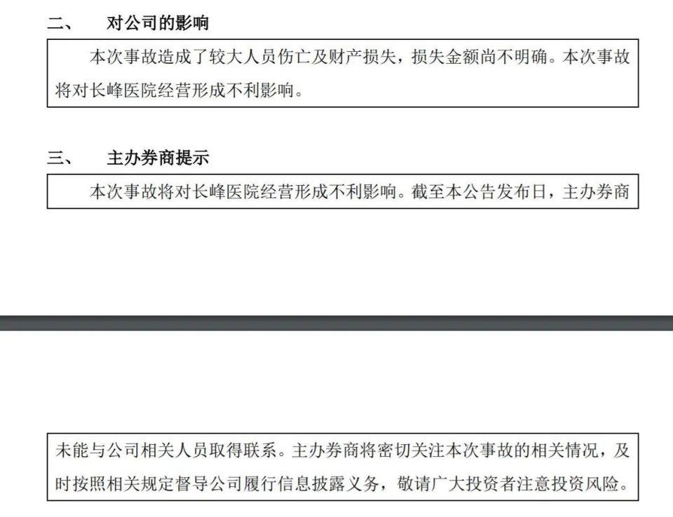 中新经纬4月19日电 (董文博 王玉玲)4月19日午间,北京市召开长峰医院火警事故环境转达会,停止19日9时,经转院救治无效,29人遭灾。 4月18日12时57分,北京长峰医院住院部东楼发生火情。13时33分许,现场明火被毁灭。15时30分,现场救济工作竣事,共疏散转移患者71人。 医院内部施工作业火花引发 会上,北京市消防总队副总队长赵洋转达称,经开端观察,事故系医院住院部内部改造施工作业过程中产生的火花引燃现场可燃涂料的挥发物所致。事故具体缘故因由和丧失还在进一步观察之中。 北京市公安局刑事侦查总队总队长孙海涛转达,经查,北京长峰医院院长王某玲(女,44岁)、副院长汪某(女,37岁)、总务科主任王某阳(男,50岁),施工公司负责人王某峰(男,47岁)、现场施工职员程某君(男,33岁)等12人,涉嫌庞大责任事故罪。现在上述职员已被公安构造依法刑事拘留,案件正在进一步工作中。 股票停牌电话无人接听 4月19日早间,天下中小企业股份转让体系在官网公告称,因发生庞大风险事故,长峰医院本日起股票停牌。 泉源:天下中小企业股份转让体系官网 北京长峰医院位于北京市丰台区靛厂路291号,为北京市医保定点医院。 现场体现,起火的楼体是医院东北侧一栋楼房,起火楼层在住院部,外窗被浓烟熏黑,且有破缝隙迹,氛围中可以闻到显着的焦味。 中新经纬 王玉玲 摄 天下股转体系在4月19日最新的公告中称,北京长峰医院股份有限公司因发生庞大风险事故,且未向天下股转体系申请停牌,根据干系规定,现决定4月19日起对其股票实验停牌。 针对此次事故,长峰医院将怎样善后?是否已有开端操持和安排?“V观财报”(微信号ID:VG-View)4月19日早间多次致电长峰医院董秘办,电话均无人接听。停止发稿,该电话提示“呼唤失败”。 此前在事故当晚十二点左右,“V观财报”向长峰医院实控人、董事长汪文杰多次致电,该电话体现占线中。 值得一提的是,“V观财报”还留意到,长峰医院的主理券商中信建投4月19日早间还发布了《关于北京长峰医院股份有限公司的风险提示性公告》。中信建投称,停止公告发布日,主理券商未能与公司干系职员取得接洽。 泉源:中信建投公告 中信建投还称,本次事故造成了较大职员伤亡及产业丧失,丧失金额尚不明确。本次事故将对长峰医院谋划形成倒霉影响。 连亏两年 2022年年报延期 资料体现,北京长峰医院股份有限公司建立于2009年,为新三板上市公司,2021年完成定向增发,主业务务是血管瘤类疾病及其他疾病的综合诊疗服务。 4月18日晚间,北京长峰医院与长峰医院团体官网均无法正常打开。 天眼查APP体现,实控人汪文杰于1969年8月出生,大专学历,曾在鄂州市中医院临床工作,而后先后任鄂州中医血管瘤专科医院院长、北京丰台长峰医院院长,现任长峰医院董事长、总司理。 自2020年开始,长峰医院便陷入了亏损逆境,当年归属于挂牌公司股东的净亏损3729.34万元。2021年,该公司净亏损2888.68万元。 2022年上半年,长峰医院实现业务收入2.53亿元,同比镌汰5.12%;归属于挂牌公司股东的净利润亏损3264.38万元,同比扩大153.23%;毛利率为20.67%。停止陈诉期期末,长峰医院在成都、重庆、西安等多地设有子公司。 对于亏损扩大缘故因由,长峰医院在半年报中体现,重要缘故因由是疫情常态化防控下,公司虽增强新媒体运营宣传使得贩卖费用增长,但受北京、上海等地疫情严峻影响,业务收入仍比同期有所镌汰,而战略转型过程中新增学科处于发展期业务本钱增长较快,使得毛利率由29.46%降落到20.67%,同时管理费用、研发费用、财政费用镌汰,共同对净利润影响所致。 在连续亏损环境下,为了回血,长峰医院正在操持剥离干系资产。 一周前,长峰医院公告称,拟出售两家子公司股权,将以1500万元的代价将长沙湘城病愈医院有限公司100%股权出售;以535.5万元出售其持有的广州长峰医院有限公司51%股权。 现在,长峰医院2022年年报已经延期披露。 该公司在4月14日晚间公告称,原定于2023年4月20日披露《2022年年度陈诉》,现因年报体例与稽核工作未按期完成,为确保数据的正确性和内容的完备性,公司将2022年年度陈诉延期至2023年4月27日披露。 此次火警事故缘故因由具体怎样?善后将怎样举行?长峰医院年报可否准期披露?“V观财报”将连续关注。(中新经纬APP) (文中观点仅供参考,不构成投资发起,投资有风险,入市需审慎。) 中新经纬版权全部,未经书面授权,任何单位及个人不得转载、摘编或以别的方式使用。 |