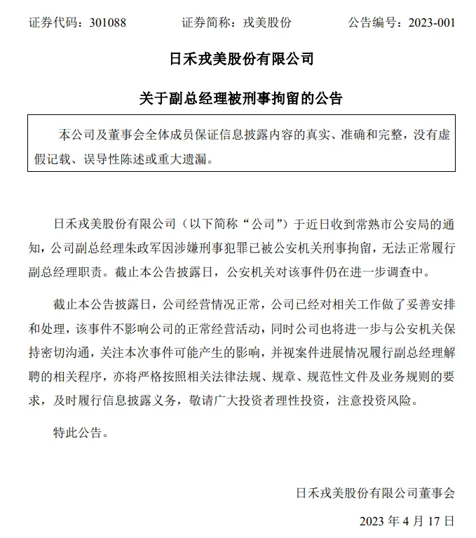上市公司高管被刑拘! 4月17日晚间,创业板上市公司戎美股份公告称,公司副总司理朱政军因涉嫌刑事犯罪,已被公安构造刑事拘留,无法正常推行副总司理职责。公开资料表现,朱政军出生于1982年,2019年9月至今继承戎美股份董事及副总司理。 与此同时,A股迎来一大波减持公告来袭,当日晚间近40家公司披露了减持筹划,涉及热门AI概念股、CRO白马股,以及多家半导体产业链上市公司。 同日晚间,生长激素龙头企业长春高新披露财报。2023年第一季度,该公司净利润为8.57亿元,同比降落24.71%。从股东厘革来看,一季末,两只社保基金从公司的前十大股东名单中消散。不外,公司同时得到多家机构增持。 近40家上市公司披露减持筹划 4月17日晚间,A股的减持公告有点多,停止晚间10点半,两市有近40家公司披露了新的减持筹划。 此中,热门AI概念股海天瑞声、金山办公均披露了减持公告。海天瑞声称,公司第四大股东唐涤飞因自身资金需求,筹划通过会集竞价及大宗生意业务方式减持不超152.58万股,占公司股份总数的3.57%。唐涤飞曾经任职公司核心技能职员,现在持有海天瑞声7.74%股份。本年以来,海天瑞声股价涨幅凌驾200%。 金山办公公告称,控股股东及5%以上股东拟合计减持不超4.73%公司股份。按照最新股价盘算,拟减持的市值合计靠近100亿元。此中,控股股东WPS香港拟通过大宗生意业务、询价转让的方式减持不凌驾1%公司股份;奇文五维拟通过大宗生意业务、询价转让的方式减持不凌驾1.1645%股份;奇文N维(除奇文五维外)拟通过大宗生意业务、询价转让、会集竞价的方式减持不凌驾2.5696%股份。 披露减持公告的,另有CRO两明确马股药明康德、美迪西。此中,药明康德实控人控制的股东及与实控人签订同等办法协议的股东,筹划减持公司A股股份合计不超8902万股,占公司总股本的3%。美迪西股东陈春来、美熹企业、美甫投资拟合计减持不超261万股,即不凌驾公司总股本的3%。 另有三只医药、医疗股拟被减持比例均到达6%。惠泰医疗公告,公司多名股东拟合计减持公司不超6%股份;龙津药业持股比例16.37%的股东立兴实业有限公司筹划减持不超2403万股(占公司总股本6%);康众医疗的股东畅城及其同等办法人君联承宇拟合计减持不超529万股(占公司总股本6%)。 多只半导体产业链个股也披露了减持公告。此中包罗中微公司、普冉股份、苏州固锝、翱捷科技等。 别的,华谊兄弟现实控制人也要减持股份。华谊兄弟公告,公司现实控制人王忠军、王忠磊拟以会集竞价生意业务方式减持公司股份不超5549万股,即不凌驾公司总股本的2%。 值得留意的是,中国电信的港股也近期被减持了。据港交所文件,新加坡当局旗下的投资机构GIC Private Limited在4月12日出售了2038万股中国电信港股,均匀减持代价为每股4.3811港元,持股比例降落至9.99%。GIC此前已多次减持中国电信。本年以来,中国电信港股上涨了45%。 戎美股份副总司理被刑事拘留 戎美股份17日晚间公告,公司于克日收到常熟市公安局的关照,公司副总司理朱政军因涉嫌刑事犯罪已被公安构造刑事拘留,无法正常推行副总司理职责。公安构造对该变乱仍在进一步观察中。 戎美股份表现,公司策划环境正常,已经对相干工作做了妥善安排和处置惩罚,该变乱不影响公司的正常策划运动,同时公司也将进一步与公安构造保持密切沟通,关注本次变乱大概产生的影响,并视案件盼望环境推行副总经明确聘的相干步调,亦将严格按照相干法律法规、规章、规范性文件及业务规则的要求,实时推行信息披露任务。 公开资料表现,朱政军出生于1982年,中国国籍,无境外永世居留权,大学本科学历。2005年起任江苏泛佳亚麻纺织厂有限公司业务司理;2015到场戎美股份,继承采购司理;2019年9月至今,继承戎美股份董事及副总司理。 戎美股份的重要业务是基于互联网平台,依托“戎美RUMERE”品牌,从事服装服饰等产物的企划计划、供应链管理和贩卖业务,重要产物包罗职业与休闲风格的女装、男装、配饰、家纺等。公司于2021年10月上市,最新市值为39亿元。2022年前三季度,公司实现营收6.14亿元,净利为1.12亿元。 长春高新一季度业绩出炉,拟24亿出售地产业务 4月17日晚间,长春高新在厚交所披露一季报,2023年第一季度,公司实现业务收入27.78亿元,同比降落6.63%;归属于上市公司股东的净利润8.57亿元,同比降落24.71%。 此中,公司子公司金赛药业实现收入23.53亿元,实现净利润8.95亿元;子公司百克生物实现收入1.79亿元,实现净利润0.18亿元;子公司华康药业实现收入1.65 亿元,实现净利润0.09 亿元;子公司高新地产实现收入0.71亿元,实现净利润0.01亿元。 从二级市场表现来看,一季度长春高新的股价剧烈颠簸,1月初至1月20日期间,公司股价一度大涨25%。以后又震荡回调,3月17日更是闪崩跌停,单日成交额凌驾37亿元,当日公司回应称,留意到了股价异动,但还没有查明缘故起因。随后的一个月,公司股价不绝维持低位震荡,最新市值为683亿元。 而从4月17日晚披露的一季报中,可以发现,机构调仓动作非常显着。此中,一季末,天下社保基金101组合、118组合直接从公司的前十大股东名单中消散,而客岁末上述社保基金分别为公司的第9、10大股东,持股数目分别到达310万股、328万股。这意味着,两只社保基金在本年一季度均有减持动作。不外,公司也得到多家机构增持,易方达上证50增强C、易方达沪深300医药