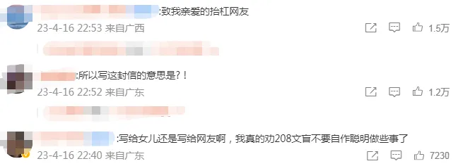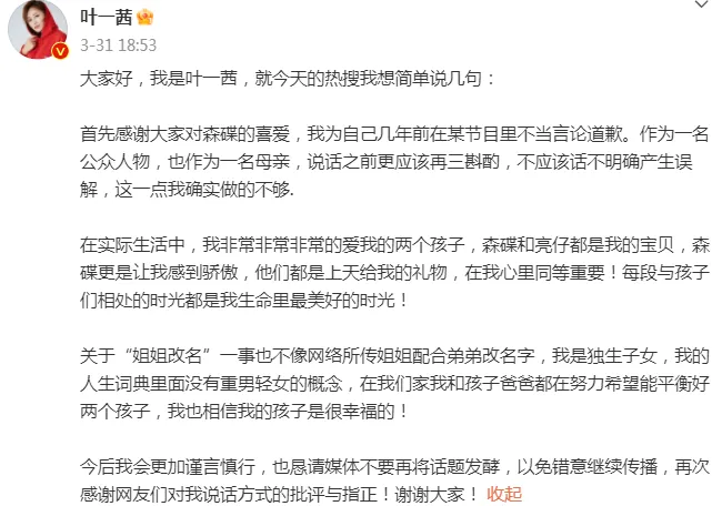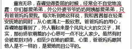 不看不知道,一看吓一跳,叶一茜已经被骂“重男轻女”好一阵了。 斯文还挺不测的,由于我印象里田亮、叶一茜一家主打一个儿女双全、幸福完满,怎么看也不像是会干出“重男轻女”这种事的家庭。 大女儿森碟打小就讨喜,在《爸爸去哪儿》上被观众戏称为“风一样的女子”。这几年出完工大姑娘也没长歪,不光还像小时间一样外型甜蜜、开朗生动,森碟的体育、文艺天赋也都很高,算是观众缘非常不错的星二代。 一家人一样平常其乐陶陶,森碟乖巧精良人气还很高,看着也不像是被“重男轻女”的家庭苛待过的孩子。那么网友为什么要说叶一茜重男轻女呢? 先来看她近来写给女儿的一封信,是4月15日森碟过生日的时间,叶一茜发在朋侪圈的小作文,如今已经被营销号搬运到了微博。内容有点长,斯文来帮各人划个重点。 1.母女俩讨论了近来网络上有关她们的争议,叶一茜痛心森碟被扯进莫须有的舆论中,森碟也拥抱安慰妈妈,“我知道妈妈不是他们说的那样”。 2.许多网友会由于一句话、一件事容易否定一个妈妈,但他们根本不懂生养、带娃的费力,只有孩子才气评判本身的母亲是不是好妈妈。 3.教森碟不必试图得到全部人的认同和歌颂,也不必为别人的误解而惆怅。爸爸妈妈弟弟永世爱她,一家人在一起什么都不怕。 森碟看到这封信是什么心情咱也不知道,只能说大部分网友都不买账,以为叶一茜的小作文与其说写给过生日的森碟,不如说是写给近来骂她的网友,比起给女儿的生日祝福,更像是为本身行侠仗义,“致我酷爱的抬杠网友”。 “给森碟的就私发她啊,发朋侪圈以致在微博营销是在干嘛。” “是演出型品行照旧在PUA啊。” “重新到尾都在说我没错,都是网友骂我误解我!” 叶一茜当天还发了微博给女儿庆生,但批评区也都是雷同的非难她的声音,少有的祝福森碟生日快乐的网友,也不忘加一句“当妈的这么说闺女,渴望她长大了跟你没有隔阂”。 以是叶一茜到底是做了什么,网友才会云云刚强地以为她重男轻女呢?斯文把她会集挨骂的言论整理出来给各人看看,我先不下结论,各人可以本身判断一下,在你看来叶一茜这算不算是重男轻女。 各人比力认识的“森碟”音同英文名Cindy,孩子台甫叫田雨橙,但这个名字实在是改过的。森碟原名田欣仪,这个名字是叶一茜孕期想出来的,但由于带女儿逛市场的时间偶发现,“欣仪”太大众款了容易跟别人撞名,叶一茜就想给女儿改个名字。 当时她的小儿子亮仔已经出生,儿子叫田宸羽,叶一茜以为这名字反过来也挺好听的,就把女儿的名字改成了田雨橙。 这让不少观众感觉哺咝刷,毕竟以为森碟原名太大众想改名什么的,各人可以明确,但为什么不起一个新的名字,而是要围绕弟弟来起呢? 而且给家里孩子起相似的名字各人也不是没见过,但通常都是在家属里排字辈,小的谁人按照大的来。像叶一茜如许把姐姐名字改成共同弟弟同款的,各人印象里照旧比力少见。 除了改名风波,田亮、叶一茜夫妻俩以往在节目上秀恩爱、分享育儿经的细节也被网友扒出了各种“证据”,此中最让人难以明确的,就是叶一茜当着许多人的面,多次diss森碟,明涵她不喜欢弟弟。 田亮说俩小孩哭起来他会先哄女儿,由于森碟哭声很大,得先把她哄好了才气说事变,相反对儿子他就没那么告急,由于他以为儿子偶然间会演戏,也大概是通过哭来让父母妥协。 在对儿子的教诲上,田亮以为哭是办理不了标题的,有什么事变你可以说出来。但叶一茜表现儿子不是演戏,只是由于他也有本身的尊严,是有苦说不出。 由于田亮明摆着痛爱女儿的态度,叶一茜得出了“同性相斥异性相吸”的结论,她说在她眼里看女儿就会以为,“各人都是女人嘛,我知道你在耍什么警惕机”,意思是女儿那些小招数只对爸爸管用。 这番话暗含森碟经常用“女人的警惕机”跟爸爸争宠的意思,再加上“同性相斥”、“我不吃这套”等关键信息,更让不少网友看到了雌竞那味。且不说亲妈跟女儿搞雌竞这事儿有多离谱吧,最少这话听起来就让人以为很不舒服。 咱也不知道叶一茜说这话的时间是不是抖机灵,我只能换位思索一下,如果我作为女儿听到我妈这么说我,大概率是会震惊惆怅的。 也有网友指出叶一茜作为母亲,说如许的话大概会伤森碟的自负心。“哪有妈妈这么说女儿的,而且这齐备大概都是你的个人臆测”。 还真别说,叶一茜经常在节目上有一些“个人臆测”类发言,紧张体如今她以为自家闺女不喜欢儿子。在她眼中森碟这孩子对全天下都友好善良,但唯独对她弟弟,以致能从眼神中流袒露“我恨死你了”。 不光云云,叶一茜还以为在森碟看来,弟弟是全天下最故意机的人。 大概是由于在她和田亮训森碟不好好读书的时间,弟弟会拿着奖状过来夸耀,用一张“读书小能手”来给姐姐来一波神补刀? 叶一茜形容森碟当时就炸毛了,但是碍于爸爸妈妈都在跟前不能发作。她以为如果她跟田亮不在现场,森碟就会把弟弟暴打一顿,还要撕烂他的奖状。 叶一茜大概是想分享姐弟俩的逗趣一样平常,大概她本身以为没什么,但在不明原形的网友连合上下文看来,这话就会让人以为森碟警惕眼、不喜欢弟弟、私下陵暴弟弟,耍警惕机争宠还会被妈妈看透。 但在网友的影象里,森碟5岁上节目就会很认识地给弟弟换尿布、冲奶粉,能看出她生存里也没少帮爸妈照顾弟弟。 森碟喜欢