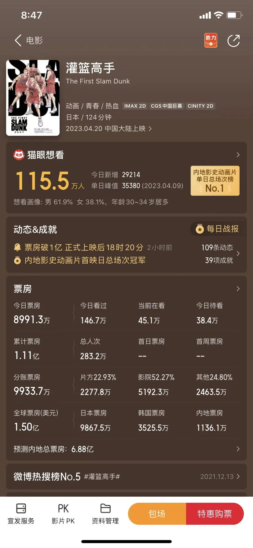 作者| Mia 编辑| 赤木瓶子 这大概是一部“观众均匀观影年事最大”的影片,同时也是一部观众忠诚度超标的影片。 4月20日零点场,除了第一排之外,某影院IMAX厅根本座无虚席,大批30-40岁左右、以男性为主的“中年粉丝”,穿着湘北队服在大厅照相打卡,早早过来领取怀念票根、海报,列队购买灌篮高手指定爆米花套餐。整个观影过程宛如观看了一场真正的篮球比赛,有人鼓掌、有人大喊“湘北牛逼”,更有无数80后90后泪洒影院,在外交媒体刷屏“爷青回”。有影院司理体现“这种局面只在《复联4》的时间看过”。 定档即刷屏,猫眼想看人数已破110万,豆瓣评分9.2分,动员东映动画天猫旗舰店湘北运动套装、明信片套装、A4文件夹套装等周边上架1分钟内售罄。《灌篮高手》以1.15亿预售逾越《铃芽之旅》,半夜场排映1.3余万场,26万人观影带来凌驾2000万的半夜场结果,成为2021年5月的《速率与豪情9》以来半夜场体现最好的影戏,上映首日产出近九成票房,别的它还动员工作日大盘飙升破亿。 当前,猫眼专业版给出的猜测票房落点是6.88亿,情怀向大IP《灌篮高手》究竟能不能赛过已有7.58亿+的《铃芽之旅》,成为本年的日本入口片票房冠军?这是每个人都关心的题目。 《灌篮高手》比武《铃芽之旅》:80后90后的“最强情怀”能撬动多少票房?《灌篮高手》之以是无可更换,是由于它是一代人的芳华符号,一个期间盛行文化最紧张的部门,湘北五虎中,赤木的目标“称霸天下”,樱木的两万次投篮,荡子转头的三井寿和那句“锻练我想打篮球”芳华热血,勾连着那些课间偷偷追漫、自封“流川枫”“樱木花道”,最精致的校园韶光。 《灌篮高手》从1990年到1996年在漫画期刊《少年JUMP》连载,东映动画制作的TV版动画从1993年10月到1996年3月在朝日电视台播放,风靡亚洲,但101集的TV动画只制作到天下大赛前,漫画故事最高潮部门——和最强的“山王工业”对决未能出现,因此当原著作者井上雄彦传出亲身担当编剧兼导演的消息时,意味着增补20多年的遗憾以及美梦成真。 有太多案例可以大概佐证《灌篮高手》的破圈程度,17岁的姚明常被人说长得像赤木,来到休斯顿火箭时,他体现总司理像安西锻练。漫画中的神奈川县、江之岛、湘南海岸成为游客必去日本“打卡”景点,奥运冠军林丹就把动画的片尾曲《直到天下止境》纹到右臂上,乃至成了他的自传书名。 一句“天下大赛见”,让粉丝们足足等了27年。樱木一句“我最光荣的时候就是现在”,流川枫和樱木的“世纪击掌”更是引发朋侪圈刷屏。观看SD剧场版,成为80后90后们芳华的结业仪式。但现在来看,接棒、凌驾《铃芽之旅》票房,有着不小的难度。 过往“柯南”“哆啦A梦”等日漫IP,大部门粉丝体量、票房天花板较为显着,票房多数在1-2亿区间,新海诚的票房招呼力、《灌篮高手》国民度显着高于上述IP,但现在来看,《灌篮高手》也存在着肯定的劣势。 作为一部有着肯定观影门槛的纯粉丝向情怀向影戏,其路人盘带有范围性,96年后再无更新,曾经史上销量最高的动漫IP已经多年没有运作,根本上对于95后、00后是断层空缺,目标观众会合在80后、90后这一已经不算太生动的群体,从档期情况来看,《铃芽之旅》同期无强劲对手,《灌篮高手》却要在10天反面临五一档打击。 因此能不能最大程度击中核心粉丝圈层,并进一步向泛受众破圈,便显得至关紧张。在首日上映之后,抖音、微博等平台上便有“扫兴”的声音传出,缘故原由重要在于,井上雄彦试图让寻常人拥有更多代入感,影戏从人气较为靠后的宫城良田视角出发,而非三井寿、樱木花道等人气脚色视角。而声优全部换人,没有放让观众一秒飙泪的片尾曲,“三渲二”的画风,也有别于影象中的手绘画风,让这场情怀狂欢没有想象中那般隆重。 从本土体现来看,《灌篮高手》于客岁12月在日本上映,一连八周周末斩获票房冠军,停止2023年2月13日,累计票房已达103.8亿日元,观影人次凌驾711万,升至日本影史票房榜第38位。《铃芽之旅》在日本已累计141亿日元(折合人民币约为7.37亿元),挤入日本动画影戏票房榜单前十。 花式宣发对决,日本IP“狂飙”中国影市近来的影戏市场,是花式宣发对决的阵地,也是日本IP狂飙猛进的角斗场。 克日,一批“影院reaction”(观影反馈)视频登上热搜,引起网友热议。穿着婚纱的女子哭到哽咽,几条狗狗在影院看哭,过于尴尬,导致品评直接翻车:“还招人吗,这钱让我赚我演技自然。”“谁会想完婚想到戴头纱看影戏?”“太可笑了。”传统套路化的哭片短视频感情营销大概已颠末期,在观众阈值越来越高的条件下,影戏营销越来越卷。 传统的路演、明星主演访谈等玩法,必要与时俱进的革新。3月,因《狂飙》爆火的张颂文在外交平台上发长文谈影戏路演,分享了《不止不休》路演的幕后故事,但终极其口碑和票房都体现平庸。 宣发能不能取得良好效果,最紧张的大概便是调性契合,以及充足有新意,可以大概引发二次流传和影响力破圈。同样改编自日本着名影戏IP、主打萌宠题材的《忠犬八公》,专门打造出“带狗狗观影专场”,击中养宠人士,乐成推动热度增长,《宇宙探索编辑部》特意挂牌、举行线下快闪运动,大批粉丝戴上片中的锅照相打卡,契合影片的怪诞神经质幽默调性,直击文青影迷圈层。 入口批片自己相对国产片来说,创意发挥、宣传周期自己便有