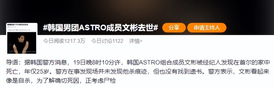 迩来,番茄君又获悉一件让人震惊的事:韩国人气夫君组合ASTRO成员的成员文彬去世了。 据韩媒报道,4月19日晚8点左右,文彬被经纪人发现死在位于首尔的家中,警方表现,文彬的死开端判定为自尽。 文彬生于1998年,本年才刚刚25岁,2016年2月出道,出演过几部芳华偶像剧,但更多的精神是在演唱上。 文彬也广为中国观众熟知,他另有一个名叫文秀雅的妹妹,文秀雅也是练习生,是韩国女子唱跳组合Billlie成员,前不久大火韩剧《财阀家的小儿子》的OST《Like a star》,就是她演唱的。 秀雅曾说过,每当自己惆怅的时间,就会给哥哥打电话,如今得知哥哥去世的消息,秀雅该是一种怎样的伤心。 而4月20日,照旧文彬母亲的生日,无论对于晤面会变成追悼会的粉丝,照旧生日收到儿子去世消息的母亲,都是莫大的打击。 沉醉在伤心中的同时,信赖各人也发现一个规律:韩国爱豆,似乎已经成了真正的“高危职业”,我们经常听到韩国明星自尽的消息,这也已经成为韩国最为广泛的社会题目。 在近10年间,韩国已有高出30位明星自尽,此中女星居多,单单2019年一年,就有崔雪莉、具荷拉、全善美三位着名女星自尽。 就在2023年4月11日,郑彩律也离开了我们。 固然,自尽的明星中,男星也不在少数,除了文彬,另有2013年自尽的金智勋,以及2017年自尽的男星金钟铉,等等。 按照我们的明白,明星的社会很高,一样寻常都收入不菲,生存优渥,各种助理一呼百诺,粉丝成群,想来他们的生存并不会困难,更不会沉溺到自尽的地步。 可为什么在韩国,会有那么多明星自尽?为什么成为一个爱豆,在韩国会变成一种高危职业? 就番茄君对韩国社会以及娱乐圈的相识,韩国明星之以是变得高危,韩星之以是会用自尽这种极度的方式竣事自己的生命,本质上有三个缘故原由: 缘故原由一、层层内卷,经济窘迫,没有自由,生存压力极大有人说,天下上的明星分为两种,一种是韩星,一种是其他明星。 这句话听起来浮夸,毕竟上不无原理。 熟知天下娱乐文化的人应该知道,韩流在天下上有着极强的影响力,我们之前总结的,由西欧评出的天下“百大”男星女星最美面目中,亚洲明星根本被韩星把持,这也能分析韩流的强势。 当我们看到金字塔尖上都是韩星时,那根本证明,整个金字塔下,有无数底层明星和练习生的“陪跑”。 而韩流之以是能领跑天下潮水,与两个特点密不可分。 第一个,就是韩国娱乐文化的把持。 在韩国,经济支柱产业有三个,分别是电子、旅游和娱乐。 比年,韩国旅游业亏损严肃;而电子方面,三星等电子工业巨头,也受到来自别的国家电子产物的打击。 如今韩国最赢利的,也就娱乐业了。 韩国娱乐圈的兴衰,事关韩国国家经济命根子,这句话并非骇人听闻,2018年韩国文化产业输出额为930亿美元,占GDP比重为6.7%。 而如今,韩国每年光是娱乐业的出口,就占到GDP的15%,可见韩国娱乐圈的紧张性。 而中国也有不少明星,出自韩国练习生,比如张艺兴、宋茜、鹿晗、黄子韬(出自SM公司)等等。 但韩国的娱乐业根本被四大娱乐巨头把持,它们分别是JYP、CJ、SM、YG。把持的正面结果,固然是产业的相对发达,但其负面影响更大,体如今明星们身上,就是无尽的压榨。 这就带来了第二个特点:韩国练习生之苦。 在韩国,要成为爱豆是很苦的,由于产业把持,韩国有一套非常成熟的造星流程。由于韩国年轻人层出不穷,以是韩星的产出,根本就来自极致的内卷。 王子文曾在采访中哭诉自己在韩国当练习生的履历。去了韩国以后,每天都要练功,从清早8点到破晓1点,不但要练功,还要被严格管束,有失误就会被处罚,或罚做俯卧撑2小时,一边做一边还要喊标语,“我会做得更好”,直到对方满意才华停。 王子文提到,自己最畏惧的是上厕所,由于整个腿部都是淤青受伤的,蹲都蹲不下去,最根本的生理活动,成了最艰巨的“修行”。 就如许,王子文说自己每一分钟都想摒挡提包回家,每次打电话都在哭。 而王子文练习期间的短暂状态,险些就是每个韩国练习生的一样寻常。 由于培训流程已经非常成熟,以是培训师拥有很高的职位,他们的话对练习生来说就是金科玉律必须服从,每天十几个小时严格练习,继承各种各样的处罚,是屡见不鲜。 可即便是如许,也不意味着他们就能乐成,能从严格练习中脱颖而出的天赋选手少之又少,在履历选秀如许的途径后,经纪公司会通过选拔活动,挑选出最良好的孩子,之后立刻进入练习期,并开始新一轮的培训。 练习期的练习生,是没有工资收入的,这群孩子中,有的会在几个月后出道,从而拿到自己成为爱豆的第一份薪水,而有的人要熬五六年以致更久,也不会进入实际收入的阶段。 在我国,一样寻常出道后的明星只要得到流量,就会有不菲的收入,但在韩国并非云云。 由于娱乐财阀的把持职位,大多数艺人在出道之后,经纪公司会跟他们签下一份“差别等合约”,这份合约,是他们无法拒绝的,一样寻常拒绝合约的人,会被彻底雪藏或封杀,根本也就告别明星这条路了。 而这份合约,一样寻常都是10年起步,合约中一样平通例定,艺人必要先向公司归还一笔“巨款”,类似于培训费之类,归还竣事后,才华与公司签署分成协议。 分成的比例,一样寻常都是七三开,也就是说,艺人所得,七成要交给公司,三成留给自己。 要知道,当年红极一时的金东万,在出道7年后,才给父母买了一套很平常的公寓,可见韩国娱乐公司对艺人的压榨。 这种