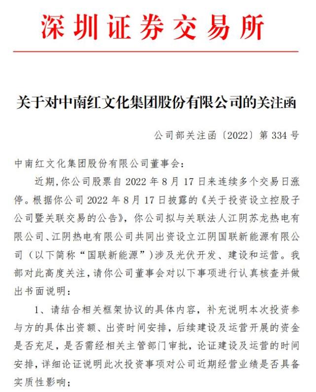 中新经纬8月22日电 22日,中南文化收厚交所关注函。 具体来看,关注函指出,根据中南文化披露的《关于投资设立控股子公司暨关联买卖业务的公告》,中南文化拟与关联法人江阴苏龙热电有限公司、江阴热电有限公司共同出资设立江阴国联新能源有限公司涉及光伏开辟、建立和运营。 该公告指出,新公司注册资源为10000万元人民币,此中中南文化拟以现金方式认缴出资5100万元,占注册资源51%。 图片泉源:中南文化关注函 对此,关注函要求中南文化阐明是否具备相干行业的技能积聚及人才储备,跨界设立子公司是否存在庞大风险。 同时,关注函还要求具体阐明近期接待机构和个人投资者调研的情况,是否存在违背公平披露原则的事项;同时核查与关联方举行互助事项的操持、审议、协议签订及信息披露等具体历程和对应时间节点,以及相干信息保密情况,并自查相干内幕信息知恋人是否存在买卖业务你公司股票的活动,是否存在减持操持,是否存在涉嫌内幕买卖业务的情况。 7月14日,中南文化发布2022年半年度业绩预告称,预计2022年上半年归属于上市公司股东的净利润为1.8亿至2.1亿元,比上年同期镌汰50%至57%。 据相识,中南文化主业务务为金属制品、电视剧等业务,同国联新能源谋划范围存在较大差异。根据2021年年报表现,中南文化业务收入紧张来自于法兰、管件和容器等金属制品的生产贩卖。 天眼查APP表现,中南红文化团体股份有限公司建立于2003年,江阴市新国联团体成员, 位于江苏省无锡市, 是一家以从事研究和试验发展为主的企业。 二级市场方面,中南文化股价报收于3.54元,自17日起已获四连板。制止如今,其总市值为84.67亿元。(中新经纬APP) |