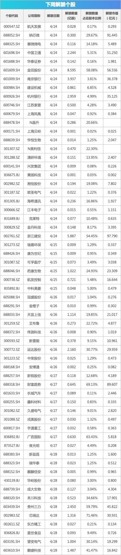 【重磅消息】 沪深港通交易业务日历优化4月24日正式实行 为进一步扩大资源市场高程度双向开放,更好地满意境表里投资者到场本地与香港资源市场权益资产设置的需求,中国证监会、香港证监会同意上交所、厚交所、港交所、中国结算和香港结算于2023年4月24日正式实行沪深港通交易业务日历优化。 沪深港通交易业务日历优化综合思量增长交易业务日对投资者、交易业务所、结算公司以及市场机构的影响,在根本不改变沪深港通机制运行逻辑的根本上,开放因不满意结算安排而关闭的沪深港通交易业务日。据测算,交易业务日历优化后,预计可将现在无法交易业务的天数镌汰约一半。 多个数据产业集会将举行 第四届团结国天下数据论坛将于4月24日至27日以线上线下相团结的方式在浙江杭州举行,论坛将聚焦数据创新与互助、发掘数据代价、进步数据公信力、构建精良数据生态等四个主题范畴。 第六届数字中国创建峰会将于4月27日至28日在福州召开。本届峰会以“加快数字中国创建,推进中国式当代化”为主题。作为第六届数字中国创建峰会的紧张活动之一的第二届福建省数据要素与产业生态大会,将于4月25日至27日在福州市滨海新城数字中国会展中央举行。 汽车动力电池产业集会将召开 中国汽车动力电池产业创新同盟2023年度大会将于4月26日-4月27日在常州召开。本次大会以“新阶段,新发展”主题,约请到国表里企业高校,多范畴专家重点分享动力电池关键质料技能以及动力电池新阶段面对的情况。 年报、一季报披露进入尾声 邻近4月末,A股年报、一季报披露进入尾声。停止4月20日收盘,A股共有2215家A股上市公司披露2022年年报,1169家上市公司净利润实现同比增长,占比到达52.78%,250家公司净利润增幅凌驾100%。从行业来看,电力装备、石油石化、有色金属、汽车等行业业绩表现抢眼。一季报方面,现在A股共有254家上市公司披露2023年一季报,此中178家净利润实现同比增长。 招商证券表现,2023年红利增速或将出现‘N’型的震荡上行走势,团体A股红利增速或将保持在个位数增长,整年红利修复较为暖和。综合思量一季报业绩预告披露以及细分行业景心胸,一季度业绩看点可沿着红利高增和景气修复两条线索睁开。 下周浙江建投5.89亿股限售股将上市流畅 Wind数据表现,下周(4月24日至28日),A股限售股上市数量共计41亿股,以4月21日收盘价盘算,市值约为760.8亿元,较本周环比大幅镌汰。此中,解禁市值较大的公司有浙江建投、产业趋势、纳芯微、金田股份、中国卫通、贵州三力等。浙江建投4月21日公告称,5.89亿股限售股将于4月24日起上市流畅,占总股本的54.45%,按最新收盘价盘算,解禁市值为97.79亿元,此次解禁股份范例为定向增发机构配售股份。 【新股机遇】 下周将有5只新股发行 下周,A股将有5只新股发行,此中北交全部1只。4月25日发行的是巨能股份;4月26日发行的是万丰股份、中芯集成;4月27日发行的是曼恩斯特、友车科技。 新股上市方面,晶升股份将于4月24日在上海证券交易业务所科创板上市,美利信将于4月24日在厚交所创业板上市;下周2只新股登岸北交所,中裕科技、民士达将分别于4月24日、4月25日上市。 |