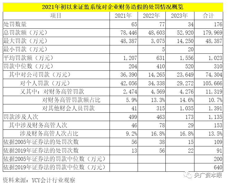 4天时间,针对财政造假证监会开出4张大额罚单。 4月21日,因财政造假,中国证监会对*ST紫晶、*ST泽达两家公司及相干责任人分别开出总计8691万元和8600万元的罚单;4月19日,*ST奇信公司及实控人等相干责任人被证监会处罚合计1.105亿元;4月18日证监会对*ST宏图公司及相干责任人给予合计1340万元的罚款。 进入2023年以来,证监体系对企业财政造假处罚已达34次,总罚款额为5.3亿元,超已往年整年的4.9亿元,对财政高管罚款的金额占对个人罚款的比例已高达14.6%。据YCY管帐行业观察的不完全统计,自2021年初以来,证监体系共公开处罚财政造假案件176起,罚款总额近18亿元。 多位专家对央广资源眼记者表现,要遏制上市公司财政造假,对上市公司及中介等相干责任方的行政处罚、民事补偿、刑事制裁必须多管齐下,协力形成高压威慑态势。 年初至今处罚34次 实际上,4月21日证监会针对*ST紫晶、*ST泽达开出的罚单,并非本月罚单的最大额度。 就在此前两天的4月19日,*ST奇信公司及实控人等相干责任人被证监会处罚合计1.105亿元。 4月18日,证监会对*ST宏图公司及相干责任人给予合计1340万元的罚款。 不光“大单”频出,证监会的处罚频率的增长也是“肉眼可见”。 央广资源眼记者梳剃头现,仅4月份以来,沪深两市共有9家上市公司因财政造假遭证监体系行政处罚。而2023年前4个月尚未竣事,证监体系对企业财政造假处罚已达34次。 而相干数据表现,从2021年以来,证监体系对于财政造假的羁系逐年强化。 YCY管帐行业观察根据各方公开披露信息的不完全统计表现,2021年整年、2022年整年、2023年至今,证监体系对企业财政造假的处罚数目分别为65次、77次和34次;总罚款额分别约为7.8亿元、4.9亿元和5.3亿元;罚款中位数分别为204万元、410万元、520万元。 “从处罚数目来看,2023年还未过完三分之一,处罚已靠近客岁的数目的一半;罚款中位数也已远超前两年,均呈逐年进步趋势。而罚款总额本年前4个月就已超客岁整年总和,增幅之大照旧挺令人吃惊的。”有匿名专业人士分析,处罚额度和频次增长与证券法的两次修订有关,但更为显性的缘故起因是羁系力度的增强和“零容忍”理念的深化。 针对机构和个人的处罚比对表现,对相干责任人个人的处罚比重越来越大。 从2021年初至今证监体系一共有176次对财政造假的处罚,罚款金额合计约18亿元,此中对机构罚款7.43亿元,对个人处罚10.57亿元。 对个人的处罚当中,对财政高管的处罚有1.13亿元。2021、2022年、2023年至今,对财政高管罚款的金额占对个人罚款的比例分别是5.9%、13.3%、14.6%。 “数据表明,对于董监高等‘关键少数’以及相干责任人的处罚越来越多,而财政高管的责任更是显着加重。”上述人士表现,巨额罚款无论是对高管照旧财会职员,都会产生实着实在的威慑作用。 “实际上,上市公司及高管的处罚已往曾有一段时间畸轻。证券法修订之后处罚上限有了大幅调解,这种厘革回应了市场关切,也增长了上市公司及高管的违法资本。”北京云亭状师变乱所状师张昇立对央广资源眼表现。 此次证监会对*ST泽达的处罚印证了上述说法:财会类职员合计处罚1850万元,此中对财政高管罚款1300万元,创下最高记录。 “别的,根据羁系对于财政造假的处罚具有滞后性来分析,2022年和2023年所处罚的案子发案时间相似,更多均为2018年左右的事变,阐明至今被证监会处罚的案子仍多为陈年往事,财政造假的情况在好转。”上述匿名分析人士表现,相干数据亦表明,2019-2021年,A股公司的低可信财报的比例在低落。 财政造假从管帐使用型向买卖业务造假型演变 民建福建省委会副主委、厦门国家管帐学院教授黄世忠在继承央广资源眼记者采访时表现,现在财政造假正从管帐使用型向买卖业务造假型演变、从单打独斗型向表里勾结型变化。 “在造假伎俩上,有三个值得关注的新动向:一是收入成为造假重灾区,占比靠近70%;二是财政造假从管帐使用型向买卖业务造假型演变;三是财政造假从单打独斗型向表里勾结型变化。”黄世忠表现。 黄世忠领导的反舞弊研究团队,曾以2010年至2019年度因财政舞弊而被证监会处罚的113家上市公司为样本,分析这些上市公司在此期间的财政舞弊特性,结果发如今这10年期间,财政造假重要会合在对利润表的粉饰和使用上,此中收入舞弊成为财政造假的重灾区,占比高达68.14%。在收入舞弊中,买卖业务造假型收入舞弊呈上升趋势,占全部收入舞弊样本的70%。 后续的跟踪研究(延伸至2022年)表明,2020年3月1日新证券法见效以来,买卖业务造假型收入舞弊的实行本事呈愈发潜伏的趋势,帮忙、共同上市公司实行财政造假的“帮凶”从关联方向真实客户、供应商和金融机构变化。 黄世忠表现,这种厘革增长了注册管帐师辨认上市公司收入舞弊的难度,导致大量审计失败,值得充实关注并及时接纳有效步调予以遏制。 *ST奇信公告也表现,自2012年至2019年,其每年都是通过过签署虚伪或放大金额的工程条约、对内部承包项目少计资本、体外付出少计费用等方式,虚增利润。 管理财政造假需多管齐下 管理财政造假,行政处罚是一个非常告急的打击本事,其威力也是实着实在的,投资者也每每表现“大快民气”。但诸多专家以为,相对于行政处罚,动辄连带100%补偿的民事诉讼、治罪量刑的刑事诉讼,威力更大。因此,要根据财政造假差异严肃水平,多管齐
