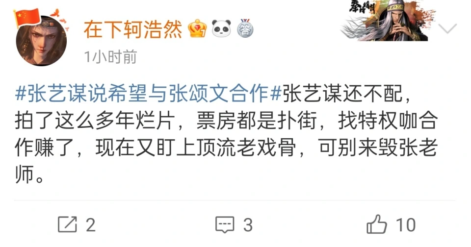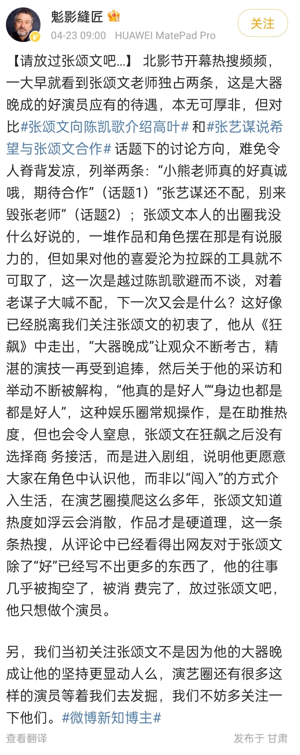 客岁此时还名不见经传的张颂文,在本年的北京国际影戏节,可谓各种风光,数据“狂飙”,依附着一部电视剧、在影戏节上也能成为核心。 开幕式红毯上,陈凯歌远远地就自动伸脱手臂去跟他握手, 张颂文大概也是太过被宠若惊很不风俗,想把章子怡拉过来站中心,但是陈凯歌这条手臂发挥了神奇魔力 ,一推一拉间不知怎么地章子怡就到一边去了…… 张颂文都惊骇地抠耳朵了,但大导演继续密切地搂着他的肩膀与他合影,旁边的章子怡也灵敏调解心情,转身指着他的胸针自动跟他交际。 固然,他们三个也不是头一次晤面,陈凯歌的最新影戏《志愿军:雄兵出击》里,章子怡和张颂文都是特别出演。 对张颂文青睐有加的不止陈凯歌,另一位大导演张艺谋,跟张颂文一起作为“天坛奖”评委在北影节开幕式亮相时表现:从来没有和颂文互助过,盼望偶尔机。 乃至另有关锦鹏,开幕红毯上是张颂文搀着他上台阶。 有网友吐槽张颂文装模作样地炒作,然后关锦鹏本人发博特意感谢了张颂文,说自己前两天不测扭伤膝盖、上下楼梯很困难,是团队同事特意拜托张颂文给自己做暂时拐棍。 实际上,要不是张颂文自己发微博分享连续三年来北影节的感受,连我都不知道…… 这已经是他连续第三次来北影节了。 在云云星光熠熠的盛典中,前两次大概他无论做什么都无人知晓也无人在意,但是这一次,他的一举一动都备受关注。 这就是娱乐圈,这就是名利场。 诚如黄渤所说,当你红了,身边就都是好人。 不乏有网友愤愤不平,以为这些人未免也太势利眼,怎么他不红的时间大导演看都不看他一眼,红了就来抛橄榄枝? 实在倒也不必。 咱们国家,不管哪个行业,最不缺的都是人,更况且是越来越没什么门槛的娱乐圈。 那么多演员,纵然是圈里人也没有那种逐一打仗注意分辨是不是好演员的精力,我跟你又不熟,凭啥要盲目信赖你能演好我的戏呢? 除了资源咖和星二代,绝大多数环境下,杀出重围红出圈的第一步,照旧要靠演员自己。 《狂飙》之前的张颂文,实在真的很不出众。 他大概性格确实很好,然而,外形并不突出,演技,也不能说不好,但,只能说仍必要时机,国产影视中并没有那么多像高启强一样有发挥空间又充足吸引人的人设。 在《狂飙》之前我看过他跟海清童瑶主演的《心居》,他演的男主角展翔,不但没什么吸引力,反而有点赶客。 岂论是剧照旧人,要红,都必要天时地利人和。 《狂飙》的时机好,张颂文也捉住了这次时机。 只是,人红黑白多,红了之后有很多很多长处,但也有弊端,比如说,在现在的网络环境下,“倒神”险些和“造神”一样快。 一个演员通过一部作品红了,就灵敏成为一个被高高架起的“新神”,然后…… 网友和媒体,会把他过往的几十年,扒到底裤都不剩。 某年某月某日,你在某论坛上发布了一条批评,其时大概是反叛期或是心情不好一时口嗨恣意骂两句,但是本日,就要在万千网友面前继承审判:你一个公众人物,怎么可以骂人?三岁看老,小小年事嘴就这么脏! …… 然后灵敏跌落神坛。 张颂文还好,现在还没被扒出什么不堪入目标黑汗青,但是也有放生泥鳅这种难以评价的过往…… 对,这个帖子一天之内已经近500复兴,网友就这件事已经大战了几百回合。 批评里大部分都说广东人、吃素信佛的中老年人就爱干这个,不算什么大事。 不外…… 不因过往的黑汗青而跌落神坛,不代表不会因本日的捧杀而跌落神坛。 就算他从已往到如今不停言行得体,网友也会由于这种无孔不入的“营销”而逆反,乃至有人以为他好得太假。 比如,照旧这次北影节,有条热搜是“张颂文向陈凯歌先容高叶”, 实在他俩的交集并不但限于《狂飙》中的大哥大嫂,两人都是北影的,而且多年前在宁浩主理的演出练习营里,张颂文还引导过高叶的演出, 十多年前,张颂文就曾经鼓励过高叶了。 但热搜一上,照旧不免有人以为他太假。 再到本日,连张艺谋都躺枪了。 实在,张艺谋说想和张颂文互助,很有大概只是有来有往的局面话,毕竟是张颂文先发言说“盼望我们能在影戏的天下里相遇,用影戏架起沟通的桥梁”,但上了热搜之后,网友却非常真情实感地讨论了起来。 说张艺谋谁有热度就跟谁互助、畏惧张颂文被拉已往给张艺谋的公主太子们抬轿……这些都算是好的了, 乃至另有直接嫌弃张艺谋的,说他不配,让他别毁张颂文。 假如张颂文本人点开这个热搜的广场,怕是更要战战兢兢坐立不安了。 不外,提及来,我从前以为,张艺谋跟陈凯歌有个很大的差别是:陈凯歌喜欢用已经成名的演员,而张艺谋很喜欢发掘仿佛一张白纸的新人,以是从来只有“谋女郎”但却没有“凯女郎”。 但是比年来的张艺谋,也越来越多地用老熟人而非新人了,我固然明白他年事大了不再有那样的精力去发掘新人,然而,就算肯定要用老熟人,也可以多用真正的力气派吧,为什么唯独偏幸口碑差的资源咖呢? 网友越来越逆反,也是未可厚非。 那些嫌弃张艺谋的网友,未必是真的是替张颂文行侠仗义,毕竟假如偶尔机跟国师互助我想他肯定会求之不得,那些网友,只不外是自己想借着这个时机吐槽张艺谋罢了。 但是,怎么办呢,按照现如今粉圈、乃至整个内娱的规则就是:每个为明星发言的网友都会失去自我,无论愿不愿意,都必须(被)认领一个粉丝身份。 你站在了张颂文的“态度”上发言,那你就是张颂文的粉丝,于是,“粉丝举动偶像买
