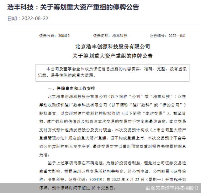北京商报讯(记者 马换换)浩丰科技(300419)又要并购资产。8月22日,浩丰科技对外披露操持庞大资产重组停牌公告称,公司正在操持收购深圳建广数字科技有限公司(以下简称“建广数科”)股权变乱,以实现对建广数科的控股权收购,公司股票自8月22日起停牌。北京商报记者注意到,浩丰科技新主王广宇客岁11月尾刚成为公司实控人,这已是其入主后的第二次并购筹划。 据相识,建广数科是国内领先的财产数字化转型IT办理方案和端到端IT服务提供商,建广数科的紧张客户为装备制造、高科技、能源化工、斲丧品等行业大型企业。建广数科官网表现,柳工团体、昆药团体、蒙牛、新渴望、屈臣氏等均是公司客户。 浩丰科技表现,本次买卖业务事项尚处于操持阶段,公司现在正与买卖业务意向方接洽,开端确定的买卖业务对手方包罗盐城智诚博远企业管理合资企业(有限合资)(以下简称“智诚博远”)、盐城卓睿智数企业管理合资企业(有限合资)、盐城恒智众信企业管理合资企业(有限合资)、盐城博信众远信息科技有限公司。纵观上述买卖业务对方,分别持有建广数科38.61%、11.21%、5.27%、4.58%的股份,是标的公司第一大、第三大、第五大、第六大股东。 继续穿透股权关系,黎杰持有建广数科第一大股东智诚博远99.9%的股份,为建广数科实控人。对于标的公司的估值情况,浩丰科技则暂未透露,仅表现付出方式预计包罗发行股份及付出现金。 别的,浩丰科技指出,若公司未能在限期内召开董事会审议并披露买卖业务方案,公司股票最晚将于2022年9月5日开市起复牌并制止操持相干事项,同时披露停牌期间操持事项的紧张工作、事项希望、对公司的影响以及后续安排等事项。 资料表现,浩丰科技是国内领先的IT体系办理方案提供商,主业务务是向金融(银行、保险)、工商企业(制造、贸易流畅与服务)、当局及公共奇迹等行业,旅店及家庭传媒范畴,提供基于云盘算架构和大数据贸易智能的IT体系综合办理方案及数字银行办理方案。不丢脸出,若能拿下建广数科控制权,公司业务也将进一步拓展。 针对上述收购的相干标题,北京商报记者致电浩丰科技董秘办公室举行采访,对方工作职员表现,“收购正在操持阶段,统统以公司公告为准”。 北京商报记者注意到,2021年11月29日,浩丰科技完成控制权变动,公司原控股股东、实际控制人孙成文以协议转让的方式向华软实业转让了15.0046%股份,转让价款总额为6亿元,由此上市公司控股股东变动为华软实业,实控人变动为王广宇。 王广宇上任实控人后,也开始“大展拳脚”,向导浩丰科技在本年1月27日开启并购筹划,拟使用自有或自筹资金3.5亿元收购山东华软金科信息技能有限公司(以下简称“山东华软金科”)100%股权。 之后,收购山东华软金科一事还遭到了厚交所追问,复兴工作完成后,上述收购在本年2月完成。这也意味着,隔断前次收购完成仅半年时间,浩丰科技再度开启并购。 接连并购背后,浩丰科技2021年整年度业绩不抱负,公司实现归属净利润、扣非后归属净利润分别约为-3483万元、-4591万元。 浩丰科技披露的2022年一季报表现,公司陈诉期内实现业务收入约为2.54亿元,对应实现归属净利润约为256.4万元,同比增长6.21%。对于2022年上半年业绩情况,浩丰科技预计将在8月26日披露。 投融资专家许小恒对北京商报记者表现,上市公司并购若能乐成的话,可以或许敏捷增强公司气力,但此中也潜藏着不少风险,诸如商誉减值、后续不能协同发展等。 |