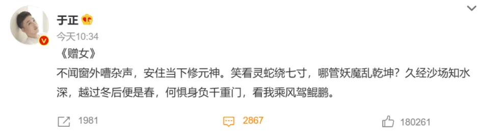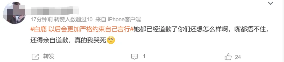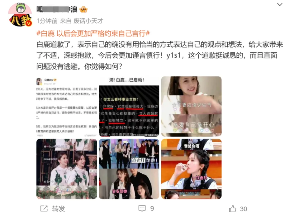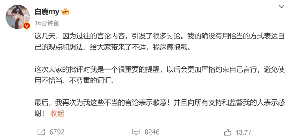28岁女星白鹿,近期由于大量“精力男子”的言论,引发了热议,固然工作室发了声明,但是另一个“母狗”言论又被扒出,使得风波越演越烈,在沸沸扬扬闹了一天之后,白鹿本人终于在晚些时间回应并致歉。 针对她本人采访时的那些言论,白鹿称本身简直没有用得当的方式表达本身的观点和想法,给各人带来了不适,为此深感歉仄。 白鹿表现:“这次各人的品评对我是一个很紧张的提示,以后会更加严格束缚本身言行,克制使用不得当、不恭敬的词汇。末了,我再次为我这些不当的言论表现歉意!而且向全部支持和监视我的人表现感谢!” 白鹿的这份致歉声明,显得姗姗来迟,由于就在她本人发声明之前,不少网友被投诉删帖,以致连她老板于正的微博批评区都控不住局面了。 不少网友都在于正疑似力挺白鹿的那条微博下,留言诘问于正:白鹿不以为你很娘吗? 不但是微博批评区控不住,连干系论坛也都是讨论白鹿干系言论的帖子,完全到了彻底出圈的程度。 以是这个风波不致歉很难收场了,白鹿团队看上去也是由于控不住了,这才选择在晚上来举行了致歉,以致大概已经公关危急了一天,由于就在白鹿发文不久,一些营销号就开始跟上话术了。 比如“这个致歉挺诚实的,直面标题没有躲避”,比如“敢于认知本身,也从没否认过本身的过往,真的很棒”,再比如,她的粉丝已经开始替别人包容了,并感谢白鹿的自省。 另有粉丝开始称,她都致歉了,还想怎么样。 以致大量的女演员被共迷恋,陈都灵、李一桐、杨紫等等,都被拉出来批评,似乎只要别人也说过类似的话,那就本身也没错。 是的,别的女明星也有一些言论,但没有一个人,会像白鹿一样这么多这么频仍,这么积极想当个男子。 白鹿这份致歉声明有多少诚意不得而知,但从这件变乱中,还是让人感到莫名的悲痛。这里不想讨论男女话题,只想说作为一个演员,白鹿本人私下性格大概确实比力男孩子,但是她对本身扮演的脚色,多少缺乏一些恭敬和明白,在这个高报酬的娱乐圈里,各人早已忍受够了这些208的不敬业,这也是这件事会被发酵的最紧张的缘故原由。 而娱乐圈明星一些一样平常的傲慢,也非常令人寒心。风波曝光之后,用状师函告诫网友,更多言论被扒就开始投诉删帖,控不住了才姗姗来迟致歉,如果不是过于傲慢,为何非要比及末了? 娱乐圈中的风波,如果影响不到本身的资源和口碑的话,明星艺人一样平常是不会致歉的,以是无论是白鹿也好大概之前其他明星也罢,他们似乎永久不明白,“敬畏观众”是什么东西。 演员是服务于观众的,没有群众支持和喜好,你又算什么。 末了只想说,盼望白鹿是真反省了,而不是又一次公关战略。 |