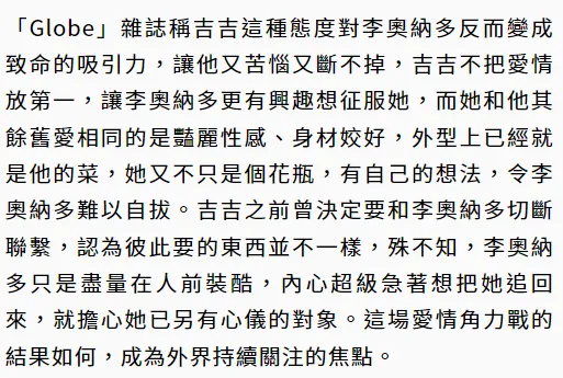 小李子莱昂纳多·迪卡普里奥阅人无数雁过无痕,然而这一次大概要栽在吉吉·哈迪德手里了。 据美国八卦杂志《Globe》最新一期报道,小李子固然与吉吉探讨好不再晤面,却始终放不下对方,两人时不时在趴体上偶遇越聊越谋利,小李子被吉吉与众差异的个性吸引,他人前装酷,心田却急着把她追返来,担心吉吉名花有主。 据悉,小李子客岁和25岁的卡莫拉分手,不久后传出正在寻求吉吉,他们保持低调,没有对外官宣,吉吉的父亲受访表现同意他们来往,歌颂小李子是个好人。 本年年初,二人传出分手,有传是吉吉没有爱情脑,渴望把重要精神放在女儿身上(与前男友所生),其次是奇迹,对于感情生存,她以为无关告急。 没想到,吉吉的淡漠和独立反而令小李子着迷,已往都是女孩们贴着他,吉吉爱理不理的态度,让小李子很上头,两人此前低调分手,但私下不时晤面,保持精良的关系。 两人分手一个月后,曾被拍到一同到场私人派对,二人在一个帐篷(包间)中度过一夜,疑似旧情复燃。 众所皆知,小李子是闲不住的,本年2月和吉吉分手之后,遭到外媒挖苦“他大概不会只身太久。”期间曾和19岁模特特伊登·波拉尼传出绯闻,小李子通过朋侪辟谣,否认恋上19岁模特。 4月份,小李子又被拍到与超模伊琳娜·谢克在一场派对上来往密切,被传出新恋情。而吉吉则转发了一位87岁奶奶手捧画板的照片,上面写着她对女孩们的约会发起,老奶奶直接发起女孩们不要约会。 吉吉这个举动暗藏玄机,一方面大概是辟谣小李子和伊琳娜·谢克来往,她才是正牌女友;另一方面大概是拒绝小李子复合的哀求,让小李子断念。固然小李子没有回应是否与吉吉复合,但他近来的表现一反常态,起首否认了本身只爱25岁以下的女孩,同时不以为本身是整日泡在温柔乡中的花花公子。 |