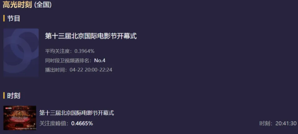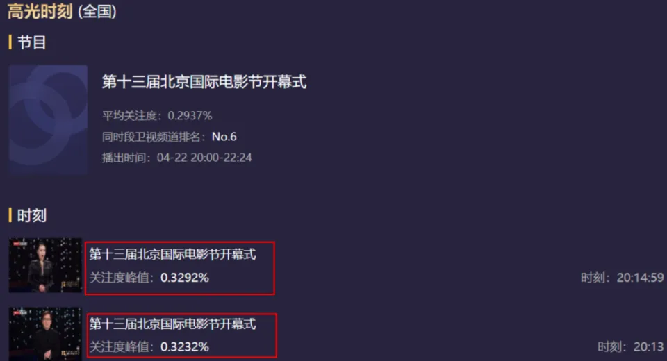 近期晚会、颁奖礼等明星大集会一个接着一个来,娱乐圈也是愈发热闹了! ——第十三届北京国际影戏节自从开幕后就话题不绝,筹划举行7天,如今举行到开幕晚会阶段,已经上星播出了,收视率随之出炉,当场验证了一波出席高朋们的人气,对应一看,还真是有点“情理之中、料想之外”的意思。 先来看一眼开幕晚会团体收视吧!固然最高点都没能突破0.5%,但到底还是挤进了卫视收视前三,一个影戏节开幕晚会在电视上播出,这个结果还算过关。 接下来,就来看看各位明星们对晚会收视的影响吧!一个半小时的开幕晚会恰好可分为三个阶段,每一阶段都有收视福星哦。 第一阶段:张艺谋、张颂文评委团拉高收视,弹幕刷满张颂文 细看北影节开幕晚会直播收视趋势,前半个小时固然连续上涨,但中途颠簸不小,动不动就来一波下跌,直到评委团上场,张艺谋、张颂文、周冬雨等人往台上一站,收视就来了一波显着上涨。 评委团有六个人,为什么会把人气算在张颂文身上呢? 看一眼晚会直播弹幕区就知道了,张颂文的名字直接霸屏了。 不光云云,在评委发言环节,张艺谋在张颂文自我先容之后,还特意接了一句:“这么多年,不停没和颂文相助过,盼望以后有机会”,张颂文当场鞠躬表现感谢——着实张颂文继续北京国际影戏节评委许多年了,但必须要说,还得是《狂飙》大爆之后,他才有了更好的报酬和曝光,人气上涨、动员晚会收视也算是他多年积极的回馈之一吧。 第二阶段:高叶和成龙划一报酬,先后上场高叶收视更高 喜好高启强和陈书婷的观众这阵子应该开心极了——张颂文和高叶不光在北影节重遇,还一起互动不绝,张颂文更是向张艺谋、陈凯歌等人先容高叶。 北影节给高叶的报酬也是相称不错,险些就是加入明星中的头一档,要知道高叶如今还没有主演作品播出,更没有票房结果,但她还是坐在了第二排中心,和朱一龙等人坐在同一排。 根据主理方先容,开幕晚会共加入两百多位明星,高叶都能和身为评委的张颂文一起,出如今专门为先容高朋写的开场歌曲里,要知道王智、张子枫都没能被写进歌词呢,高叶的镜头都是直接跟着吴京、章子怡、周冬雨。 后续高叶还和成龙在同一个环节进场,是整个环节唯二上场发言的明星,高叶本人倒也没辜负晚会主理方给她的高报酬,直接拿下了第二阶段收视最高峰,比成龙年老还要高上那么一点。 第三阶段:张颂文再度上场,陈凯歌导演影戏剧组拿下收视最高点 开幕红毯陈凯歌、陈红、陈飞宇一家同框成为现场名局面,开幕晚会他们一家人又再次上场,仍旧全程没有互动,不外将近20个明星往台上一站,到底还是很吸引眼球的,终极拿下来整场晚会收视最高点。 张颂文也自此成为了晚会一开场一末端的收视福星——原来他也参演了陈凯歌导演的新影戏,只是由于同时继续影戏节评委,就没能和剧组走红毯,比及了晚会剧组上台,他才跟着一同宣传,在章子怡之后举行发言,又是一波稳稳收视小上涨。 一场影戏节晚会收视乐成验证了张颂文、高叶的高人气,也侧面证明白良好的演员并不会受限于番位和戏份,这里也是盼望每个依附爆剧翻身的演员,都能保持初心,不要由于热度和人气迷失,能继续给各人带来更多良好作品。 本文未经授权严禁转载违者必究! |