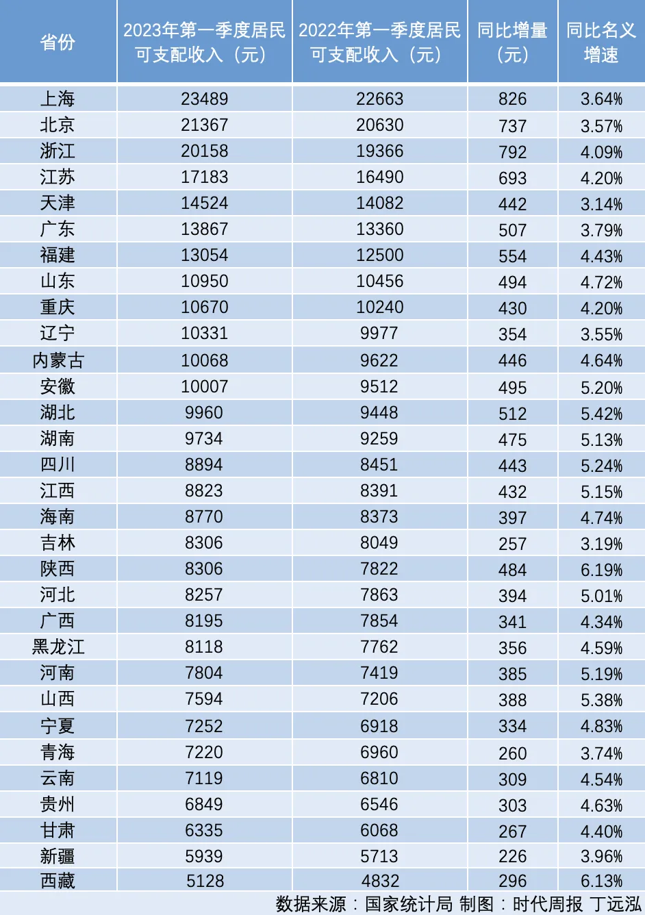本文泉源:期间周报 作者:丁远泓 经济连续复苏,各地住民的钱袋子都在变鼓。 克日,国家统计局公布了2023年各省份的一季度住民可支配收入环境。数据表现,相较于2022年同期,各省份的名义增速均不低于3%。 此中,上海、北京、浙江继承排名前三位,浙江更是依附近800元的增量初次跻身“2万+”。与此同时,随着辽宁、内蒙古和安徽的参加,如今成为“万元户”的省份有12个。 根据国家统计局公布2023年一季度经济运行数据,天下住民人均可支配收入为10870元。也就是说,上海、北京、浙江、江苏、天津、广东、福建和山东这8个省份高于天下均匀程度。 别的,另有不少省份实现了排名上升,此中上升最多的是陕西。2023年第一季度,陕西省住民可支配收入为8306元,相较于2022年第一季度,增长达6.19%,高出河北和广西,进入天下前20名。 与此同时,宁夏也依附4.83%的名义增速高出青海。各地的住民可支配收入,毕竟在一季度发生了怎样的变革? 浙江初次跻身“两万+” 浙江住民的可支配收入再创新高。 根据浙江省统计局数据,2023年第一季度,浙江住民人均可支配收入20158元,同比名义增长4.1%,扣除代价因素现实增长2.7%。 浙江不光一举跻身“2万+”,其2023年第一季度的同比增量也到达了792元,位列天下第二,高出增量排名第三的北京55元。 着实浙江的住民可支配收入不绝很高,常年位居天下第三名,仅次于上海和北京,且与第四名江苏省拉出较大差距。而这与浙江的经济结构有关。 众所周知,民营经济、小微企业是成为浙江的最大特色和“金字招牌”。2023年一季度,浙江规模以上工业中,民营企业增长值增长5.5%,增长值占比到达70.4%。 湖北省原统计局副局长、中南财经政法大学传授叶青在继承期间周报记者采访时表现,浙江的民营经济根本很好,无论是对住民就业来说,照旧对创业来说,都是有利的。拥有稳固的工作,住民的可支配收入天然也更轻易增长。 与此同时,浙江开年第一季度的经济运行数据也表现不俗,GDP到达18925亿元,按可比代价盘算,同比增长4.9%,高于天下均匀程度。 “浙江本年一季度的经济指标都不错,无论是工业照旧服务业都有稳固的增长,经济发展比力稳固,住民收入才华够增长。”叶青说。 除了一季度的住民可支配收入初次突破2万元,浙江的城乡住民收入差距也在进一步缩小。 详细而言,2023年一季度,浙江城镇住民人均可支配收入为23589元,农村住民人均可支配收入13198元。城乡住民人均收入比值为1.79,比上年同期缩小0.03,这一数据远低于天下程度的2.35。 “结果”优秀的浙江乃至提前完成了本身的小目标。根据《浙江省农业农村当代化“十四五”规划》,2025年,浙江省农村住民人均可支配收入增长至到44000元,城乡住民收入倍差缩小至1.9。 而在2022年,浙江农村住民人均可支配收入为37565元,固然间隔2025年的44000元另有肯定间隔,但其城乡住民收入倍差为1.90,比上年缩小0.04,已经到达了2025年的预设目标。 毕竟上,浙江城乡住民收入差距已经连续10年呈缩小态势,收入分配格局也在不绝优化。 2021年5月,国务院正式印发《关于支持浙江高质量发展建立共同富裕树模区的意见》。《意见》中提出,到2025年,浙江省推动高质量发展建立共同富裕树模区取得显着实质性希望。到2035年,浙江省高质量发展取得更大成绩,根本实现共同富裕。 也就是说,接下来的浙江,住民可支配收入将连续增长。 陕西可支配收入增速第一 陕西住民可支配收入固然没有“过万”,但其增速位列天下第一,一举高出河北和广西,相较于2022年同期的排名进步2位。 陕西省统计局数据表现,2023年一季度,陕西住民人均可支配收入8306元,同比名义增长6.2%,扣除代价因素,现实增长5.5%。 从详细收入泉源来看,四大类收入均实现正增长。此中,陕西住民人均工资性收入4537元,同比增长344元,增长8.2%;人均谋划净收入836元,同比增长80元,增长10.5%;人均产业净收入553元,同比增长14元,增长2.5%;人均转移净收入2381元,同比增长47元,增长2.0%。 陕西住民可支配收入的高位增长不光存在于2023年。2022年,陕西住民人均可支配收入30116元,较上年名义增长5.4%,扣除代价因素,现实增长3.2%,均高出天下均匀程度。 与此同时,陕西四大类收入都实现了正增长,且增长较为均匀,除人均产业净收入增长为4.6%外,别的三类增长均在5%—6%之间。 如许可观的增长背后,离不开本地当局的积极。 2022年,陕西接连印发《陕西省关于促进城乡住民收入稳固增长的多少步调》《陕西省关于促进城乡住民收入增长的接续步调》,提出了多项政策以动员收入稳步增长。 除此以外,陕西的民营经济也在不绝发展。2022年,陕西535.8万户谋划主体中民营占到98%,民营经济贡献了全省近一半的GDP、近一半的投资、近一半的税收和近40%的收支口额。 叶青以为,陕西的住民可支配收入会有云云高的增速,不光与陕西拥有稳固的产业、稳固的经济增长有关,也与本地的民营经济市场主体在不绝增长有关。“民营经济的发达发展可以为本地住民提供工作时机,从而促进收入。” 陕西在住民可支配收入增长外,还实现了城乡收入差距继承缩小。 2023年一季度,陕西农村住民人均可支配收入增速快于城镇1.9个百分点,城乡收入比为2.42∶1,较上年同期缩小0.04。 此中,工资性收入有较大推动。一季度中,陕西农村外出务工劳动力总量为582.6万人,较上年同期增长21.8万人,同比增长3
