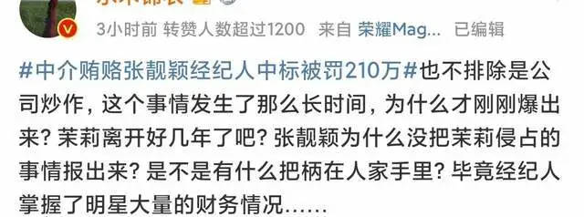 玉人实惨! 4月24日,#中介行贿张靓颖经纪人中标被罚210万#忽然冲上热搜第一。 原来之前张靓颖的前经纪人夏茉含借职务之便,收受行贿,中饱私囊,替张靓颖安排直播运动,乱签费用单。 作为受害者的张靓颖并未宣扬,而是给足了对方面子,2020年双方好聚好散。 没想到时隔3年东窗事发,中介公司被罚款210万上了热搜。 彼时,恰逢张靓颖要出新歌,加入新综艺,于是难免有人讽刺其公司为了炒作不择本领。 着实,这真不怪张靓颖,相干处罚效果4月18日才出来,在某APP就可以查到。 当年张靓颖都没公开此事,现在更没须要故意搞事变,若要炒作,这3年里多的是机遇。 假如没有证据,照旧不要搞受害者有罪论这一套。 说真话,张靓颖一起走来,真的算遇人不淑。 前有亲爸淡漠,再有冯珂拿她当赢利工具,亲妈抖隐私光荣扫地,后有经纪人反叛,算得上众叛亲离。 台前,她是风光无穷的大明星;台下,她的生存也是鸡飞狗走,一地鸡毛。 不被爱的前半生“别人叫了我这么多年海豚公主,但是我却从来没有公主命!”张靓颖曾发出如是感慨。 2005年,《超等女声》热浪席卷天下,张靓颖依附海豚音脱颖而出,荣获季军,一时间家喻户晓。 今后,她的星途算得上顺遂,签约华谊音乐,发专辑,歌曲爆火,一度走上国际。 她是唯一上过《奥普拉脱口秀》的华人歌手,三度出席格莱美颁奖仪式,为好莱坞大片唱过主题曲。 合约到期后,她自主流派当老板,建立少城期间,当过杨幂的老板娘。 别看张靓颖在人前光芒万丈,背后她却承载着诸多心伤。 身为女孩子,她生下来就不被父亲接待。 童年时,父亲总是在跑长途,每个月有近20天不在家。偶尔在家,却要求4岁的她帮他洗袜子。 上小学一年级时,父母离异,张靓颖由母亲抚养,父亲彻底缺席。 有一阵子母亲手头窘迫,便让张靓颖找父亲要米饭钱,而父亲从无一句关心,反倒给尽表情,说些欠好的话羞辱她。 没过几年,父亲因病去世,张靓颖彻底失去与父亲息争的机遇。 功成名就后再谈及父亲,她说无感。 可其时照旧孩子的张靓颖肯定对父爱有等待,面对父亲的淡漠,她不解、愤怒和委曲,却无法发泄,她的心田有缺失,以致她非常缺乏安全感。 厥后为了补贴家用,还在读中学的张靓颖跑去酒吧唱歌挣钱,老师和同砚给予她的也只有无声的轻视。 就是在如许的境遇下,张靓颖遇到了冯珂,一个大她14岁相对有钱有职位的成熟夫君。 大概一开始冯珂对张靓颖未必有爱情,作为一个夺目标贩子,他大概只是看中了张靓颖的潜力,想借此包装她捞一笔。 于是他对张靓颖格外关爱,去酒吧给她恭维,送她鲜花,晚上时不时送她回家。 迷恋冯珂亦父亦友的暖和,张靓颖陷落了。 冯珂和她说本身仳离3年了,她信任了,还将其带到母亲眼前,表现来往刻意。 她亦服从冯柯的种种安排,开始闯荡娱乐圈,不外短短几年便求名求利。 可转眼张靓颖30岁,和冯珂在一起也有10来年了,可冯珂却对完婚一事只字不提。 2005年,张靓颖不想再等了,她在本身的演唱会上大胆求婚: “从19岁到30岁,有一个人不绝陪着我不绝掩护我!12年了,我已经30岁了,我不想一个人过了,你现在乐意娶我的话,你就上来。” 可冯珂夷由了许久,才走上台来,拿过发话器,他说的不是“我爱你”,而是“谢谢你”。 全部人都看出,冯珂并不想娶她,张靓颖未必不清楚,但她离不开冯珂。 张靓颖能红,仅靠一把好嗓子是不敷,娱乐圈的勾心斗角肮脏龌龊,端赖冯珂帮她办理全面。 因此,对张靓颖来说,冯珂远不止是经纪人和奇迹上的同伴那样简单,也不但是男友,他是她的恩人、她的老师,她的人生向导,是她心目中如父亲般的存在。 可在冯珂眼里,比起情人,张靓颖更像是他通向乐成的互助同伴。 现在他有钱有势有资源,想要什么样的女孩子都手到擒来,若把张靓颖当摇钱树,又能在表面风流快活,岂不美哉? 可他没想到张靓颖那么大胆,公然在镜头前逼本身,让本身下不来台。 思量很久,为了不失去摇钱树,他妥协了,允许完婚。 可这也开启了张靓颖人生最大的一场风波! 众叛亲离?“我想告诉靓颖的是,生存中的冯轲作风也并不检核,颠末十三年的观察,一件件事变让我不得不以为他并不是真正的爱着我的女儿。” “现在他想急迫的和靓颖完婚,作为母亲,我担心的正是他要光明正大地继承掌控靓颖的产业,让我的女儿继承成为他的挣钱工具,他不是一个可以让我把女儿托付终身的夫君。” 2016年10月9日,张靓颖的母亲张桂英发布了一封致社会公众的公开信,如深水炸弹般引爆娱乐圈。 原来张妈妈剧烈反对张靓颖嫁给冯珂,可张靓颖并不听她的话,于是她藏起户口本不让张靓颖领证。 在得知张靓颖孤注一掷要和冯珂举行婚礼后,母亲的做法堪称非常、疯狂。 她甩出亲手写的公开信,怒斥冯柯诸多罪状,爆出惊人内幕: 冯珂诱骗当年只有18岁的女儿当其“小三”;倾吞女儿与其公司股份;多年精神、经济控制女儿,且私生存不检核…… 张靓颖被母亲的一番骚使用搞得彻底面子无存,也把她末了的一点尊严给撕得稀碎: “谁人星期我的脑筋完全一片空缺,不知道该干嘛,毫无方向,也词穷……” 张靓颖母亲说,本身的目标是不渴望女儿以悔恨恨交加,“哪怕女儿因此记恨我”。 作为一个母亲,是不能眼睁睁地看着女儿跳火坑, 可张靓颖是大明星,张妈妈但凡有些社会阅历和认知高度,就该明确她用了做错的方式行止理这件事。 起首,张靓颖是一个30多岁