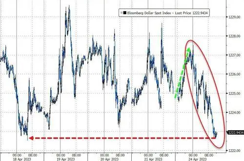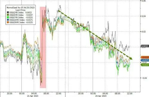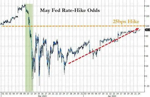 周二到周四,微软、谷歌母公司Alphabet、Meta、亚马逊等明星科技股将相继公布财报。周四将发布美国一季度GDP,周五发布美联储更青睐的通胀指标3月PCE代价指数等重磅经济数据。 期货市场押注下周三美联储FOMC会后公布加息25个基点的概率升至91%,6月停息加息的概率维持67%高位。市场预计5月欧洲和英国央行均继续加息,欧央行不扫除加息50个基点。 市场对美联储5月加息预期升至硅谷银行倒闭以来最高位 芝加哥联储的3月天下运动指数保持稳固,仍指向扩张,但生产和制造指标降落。芝加哥地区4月份统计的将来12个月经济远景大幅下滑,暗示本地经济增长远低于均匀程度。 德国Ifo贸易景气观察表现,德国企业4月感情略有好转,特别是制造业的将来预期改善,但对当前状态评估更糟。德国央行称,欧元区最大经济体Q1经济表现好于预期,或躲过阑珊。 多位欧央行票委鹰派发声,均支持继续加息,有须要时维持利率在峰值程度。比利时央行行长支持加息至4%,只有工资增速放缓才会克制加息。大鹰派Schnabel不扫除下周加息50个基点。 货币市场押注5月欧央行加息25个基点的概率为70%,加息50个基点的概率为30%。由于美国和欧元区4月份PMI贸易运动均提速,取消立刻阑珊的担心,对西欧央行加息预期不停升温。 日本央行周四将召开新行长植田和男上任后首个政策集会,只管他“放风”称没有须要改变货币刺激政策,媒体称日本央行或最早本周起讨论对货币宽松政策举行12到18个月的长期检察。 标普和道指惊险收涨,浩繁科技股财报前纳指领跌,LV母公司市值破欧股记录4月24日周一,美股低开后全线走高,开盘一小时纳指率先转跌,标普500指数紧随厥后。 午盘时美股已悉数转跌,道指抹去逾80点涨幅后一度跌83点,标普最深跌0.4%,纳指最深跌0.9%领跌告急指数并失守1.2万点整数位,罗素小盘股最深跌0.5%。 尾盘时,标普和道指重新转涨,并连涨两日,但隔断4月12日以来的近两周低位不远。纳指和罗素小盘股跌幅显着收窄,纳指和纳指100创4月12日以来最低,小盘股创4月14日来最低: 标普500指数收涨3.52点,涨幅0.09%,报4137.04点。道指收涨66.44点,涨幅0.20%,报33875.40点。纳指收跌35.25点,跌幅0.29%,报12037.20点。纳指100和罗素2000跌0.2%。 标普11个板块涨跌各异,能源板块收涨1.54%且全部身分股均收涨,原质料涨0.69%,医疗保健涨0.56%,金融板块则跌0.2%,房地产跌0.3%,信息技能/科技跌超0.4%。 美股午盘时齐跌,尾盘标普和道指转涨,纳指全天领跌 明星科技股尾盘跌幅收窄。“元宇宙”Meta微跌,连跌六日至近三周新低。苹果跌0.7%后转涨,脱离近两周低位。亚马逊0.7%,失守两个半月最高。奈飞涨2%后转跌,终极收涨0.3%。微软跌超1%至附近新低。谷歌A涨0.5%,连涨三日至一周新高。特斯拉跌4%收跌1.5%,至三个月新低。 芯片股齐跌。费城半导体指数跌0.5%,委曲守住3000点整数位,盘中创近六周新低。AMD跌1%至六周低位,英伟达跌0.3%至一周新低。英特尔跌超2%,连跌五日至附近最低,抹去4月份涨幅。台积电美股一度跌1.6%,至1月中旬以来的三个多月最低。 AI概念股下跌。C3.ai跌11%,连跌五日至三个月最低。SoundHound.ai跌超6%后转涨近1%,脱离月内低位。BigBear.ai跌近16%后收跌超10%,连跌五日至两周半新低,上周一创两个月最高。 消息面上,特斯拉再次上调2023年资源付出预算至70亿到90亿美元,较此前预期均高出10亿美元。苹果假造实际头显装备预计6月发布,最低售价3000美元,将运行数十万个iPad应用步调。三星周四或公布2009年以来十四年里最差季度利润,因内存芯片市场“处于几十年来最严峻阑珊”。台积电向员工发出底薪调薪关照,本年度均匀调薪幅度达4%至5%。Wolfe Research将C3.ai评级下调至减持,担心收入增长放缓。 中概ETF KWEB和CQQQ跌约2%,纳斯达克金龙中国指数(HXC)跌2.4%。纳斯达克100四只成份股中,京东跌2.7%,拼多多跌3.6%,百度跌近2%,网易微涨。其他个股中,阿里巴巴和B站跌超2.5%,腾讯ADR跌1.6%,爱奇艺跌超6%,金山云跌超7%。 新股中,优品车ADR一度涨超37.4%,报10.76美元,终极跌超10%,上周四登录纳斯达克首日收涨近620%,盘中最高涨1150%并频频熔断。深圳佳裕达物流ADR破发,最低触及3.69美元,终极收跌超19%,上周五美国IPO首日曾涨至10美元。 银行股下跌: 行业基准费城证交所KBW银行指数(BKX)跌近1%后收跌0.4%,连跌三日至一周半最低。KBW纳斯达克地区银行指数(KRX)转跌0.5%,逼近2020年11月以来最低,SPDR标普地区银行ETF(KRE)尾盘也转跌,上周三曾创月内新高。 大型银行中,摩根士丹利和资管巨头嘉信理财跌约1%。第一共和银行涨超12%领跑地区银行股,但盘后跌超21%,一季度存款锐减40%较预期更差,公布裁人超20%。 第一共和银行财报前涨超12%,财报的存款指标不佳,盘后跌21% 瑞信美股涨超2%,167年汗青上“末了一份财报”表现一季度资产净流出近690亿美元,但因注销了150亿瑞郎的AT1债券而团体实现红利。周二财报的瑞银UBS涨超1%。 其他变动较大的个股包罗: 周日已申请休业掩护的“散户抱团股”3B家居跌近36%,革新汗青最低,本年累跌超92%。 适口可乐涨1.5%后转跌,失守年内新高,因产物提价和需求茂盛,一季度营收和红利超预期。 迪士尼涨超1%后转跌1%,但收涨0.1%,开启规模更大的第二轮裁人,两轮裁人总数达4000人。 视觉媒体公司Getty Images收到Trillium Capital以每股10美元全现金收购的要约,较上周五收盘价翻倍,周一涨近62%后收涨超30%,至两个半月最高,但收盘股