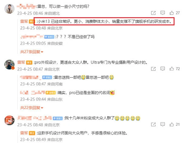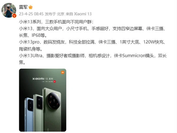 【手机中国消息】雷军真是太难了,做了大屏手机又有人想要小屏手机,做了小屏手机又没有人买。4月25日早间,小米创办人、董事长兼CEO雷军发微博先容小米13系列三款手机面向差别的用户群,有网友在品评区留言称:“雷总,可以做一些小尺寸手机吗?” 小米13系列 对此,雷军复兴称,“小米13已经非常好。更小,消耗群体太小,销量支持不了旗舰手机的研发资本。”小米13接纳高亮金属竖立边框、超窄边屏幕,优雅又不失锋芒。手机配备一块6.36英寸超视感屏,接纳新一代发光质料,更高亮、更节能。机身薄约7.98mm,重量约为185g。从雷军的话术中我们不丢脸出,小于6.36英寸的小屏手机在市场上并不非常吃香,小米13已经是小米交出的关于“小屏手机”不错的答卷了。 雷军复兴 在保举小米13系列三款手机时,雷军以为,小米13面向大众用户,小尺寸手机手感超好,支持四窄边屏幕、徕卡三摄、长焦、IP68等;小米13 Pro得当数码发烧友,科技全部拉满,配备了徕卡三摄、1英寸大底、120W快充、陶瓷机身等;小米13 Ultra得当拍照爱好者或拍照师,接纳相机感筹划,配备了徕卡Summicron镜头,双长焦。 雷军微博截图 至于外貌方面,雷军则以为,小米13 Pro的外貌筹划更得当大众人群。Ultra是专门为专业拍照用户筹划的。 小米13 Ultra 外貌方面,小米13 Ultra接纳后置圆形镜头模组+向后延伸的一体金属中框+流线型机身+有机硅素皮筹划。小米把相机经典筹划应用到了小米13 Ultra上,再加上橄榄绿的经典配色,大幅度提拔拍照的专业感,机身有点厚。雷军表现,很多拍照师和拍照爱好者非常喜好这个筹划。 |