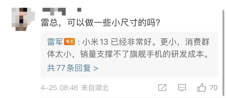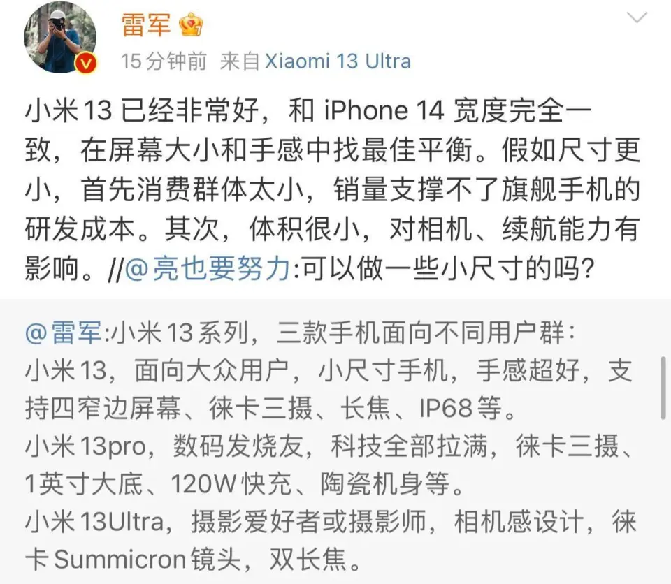 Tech星球4月25日消息 克日,有网友给小米开办人雷军留言,他想要更小尺寸的手机。对此,雷军体现:“更小屏幕的手机斲丧群体太小,销量支持不了旗舰的研发资源”。 随后,雷军又发文体现,小米13已经非常好,和iPhone 14宽度完全划一,在屏幕巨细和手感中找最佳均衡。假如尺寸更小,起首斲丧群体太小,销量支持不了旗舰手机的研发资源。其次,体积很小,对相机、续航本领有影响。 |
