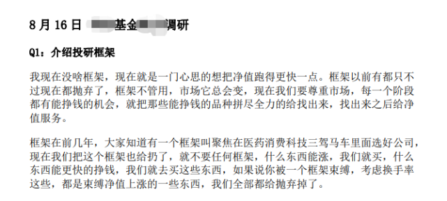 财联社8月23日讯(记者 沈述红)放言自己现在“没有投资框架,框架不管用”,一位公募基金司理在机构调研中的言论让他成为了克日的关注焦点。“三无主义,无框架、无理念、无风格”、“没有股票池”、“什么东西能涨,我们就买”、“如果‘招’不灵了,就不要用‘招’来束缚自己。市场变了,你得改变自己”,这些言论均引发了业内广泛热议。 在此次调研中,该基金司理坦言自己现在管理总规模已过百亿元,他对自己管理产物的初志绝不讳言,体现自己现在统统操纵的目的就是为了产物净值服务,“现在市场给了一个抢钱的时机,各人都在抢钱……功课做足了钱才接得住,以是我们不必要框架……而是要思考对组合更故意义的事变。” 对于这些观点,部分业内人士叹其胆量,以为他“说了其他人不敢说的实话”,也有不少基金公司人士称这是在追涨杀跌,做法不可取。 公开信息表现,该基金司理进入证券行业已逾12年之久,投资司理年限为6.68年。他现在管理着5只公募基金,停止本年6月尾的管理规模为70.86亿元。不外,上述调研中,他透露其管理规模已突破百亿元。 从其管理的5只产物环境而言,他的任职日期均为2015年及2016年,有4只产物年化回报在-10%以下。不外,近三年来,他管理的产物业绩体现不俗。此中,他管理规模最大的产物本年以来收益已有8.94%,近两年以来收益为47.13%,近三年以来收益则高达96.63%,另两只产物近三年业绩更是纷纷高出了230%。 在本年一季报以及过往多个季报中,他体现自己管理的新兴活力和智能生存等产物,会围绕‘医药+斲丧+科技’做均衡设置,不会特别方向一个特定范畴。同时根据市场厘革和板块的估值水平,在差别方向做适度的偏离。此前的采访中,他也夸大过,自己对任何行业没有投资偏好,对峙开放的投资体系,但心田更倾向于设置发展股。 “三无主义”惊人言论 克日,华北一家基金公司某基金司理在8月16日的一次机构调研内容在业内快速发酵。 在此次调研中,该基金司理谈及投研框架时,体现自己“现在没啥框架,就是一门心头脑把净值跑得更快一点。框架从前有都,只不外现在都扬弃了。”在他看来,框架不管用,市场总会变。 2019年至2021年间,他不绝在用医药、斲丧、科技“三驾马车”并驾齐驱的思绪在操纵,但现在已全部颠覆。“现在我们是三无主义,无框架、无理念、无风格。我不再想用任何框架和理念束缚自己,什么能涨就买什么,什么能涨得更快就买什么,我们所做的统统操纵目的,都是为了给产物净值服务。” 他体现自己并不纠结时机是否短线,长期、短期时机都要把握。只要能涨,就要尽大概捕获到,要恭敬市场每一个上涨的时机。 当被问及“怎样确定哪个标的涨得快和洽”,他总结为确定“边际厘革和兑现的及时性”,当标的估值透支到无法担当的水平,他会选择卖掉。谈及结构方向,该基金司理称自己的答案是“赛道+”,也就是“接着找,赶紧找,赶紧‘抢钱’。 如果‘招’不灵了,就不要用‘招’来束缚自己,恭敬市场风格就好。由于一种风格不大概吃遍天下。市场变了,你得改变自己。” 至于为何其投资组合的落脚点终极到了“新半军(新能源、半导体、军工)”如许的范畴,他以为这是由于通过自上而下或自下而上筛选个股后,终极都是这些发展赛道凸显出来。 “你可以看好‘新半军’,但条件是肯定要把这内里最能涨的品种揪出来,否则是没故意义的。”他说。 一样平常而言,基金司剖析有自己可买的股票池,但该基金司理称自己没有股票池,其手头上要买的品种有许多,投资组合长期维持约30个品种。他体现自己每天都在过滤完标的之后,有些标的会pass掉,有些会纳入进来,标记一下,等估值到公道水平就开始加仓。 现在的持仓中,他体现大概有1/3以上的品种是研究员保举过的,但前十大持仓,他的要求更为苛刻,必须“亲力亲为,否则踩雷了会很贫困。” 针对当下的市场,他以为现在没有大的体系性风险,一周翻倍的品种有一大把,他曾多次错过如许的时机,非常悔恨,“如果其时我们对自己再狠一点,再花点时间去看一下,大概就不会错过”。 他体现,当下的市场给了“抢钱”的时机,各人都在“抢钱”,“但基金司理拿着盆去接钱的过程中,得让你的盆不要有让大钱漏下去的洞,这就必要把功课做足。”以是,他以为这个过程中,框架不告急,思考对组合更故意义的事变,让净值涨起来更告急。 4月“边哭边加仓” 本年一季度的黑天鹅变乱,该基金司理和绝大多数偕行一样未能顺遂躲过。到了4月中旬,他持仓中的汽车零部件标的每天跌停,“能怎么办,我根本上每天都一边哭一边加仓,很快把那些品种买到了很重的仓位,然后继续每天跌停,一点招没有。” 然而,现在回过头看,他体现全部的煎熬都是值得的。 他还坦陈,自己本年在CXO上赔了不少钱,“更尴尬的是,这个钱我也挣不返来了,由于我大概背面也不筹划再买CXO了,我现在的医药标避开了主流赛道的品种。” 这位基金司理在调研中对自己过往的投资司理也开门见山,固然停止现在的管理规模已突破百亿元,但他称自己2016年至2018年的投资并没做好,尤其是2018年“做得巨烂无比,差点被开除”,厥后被“撸掉”了基金司理一职,来到了研究部分,当了8个月研究员。 和已往相比,动态调解现在对他而言尤为告急,在调解中,他会卖掉贵的,探求性价比更符合的品种。在他看