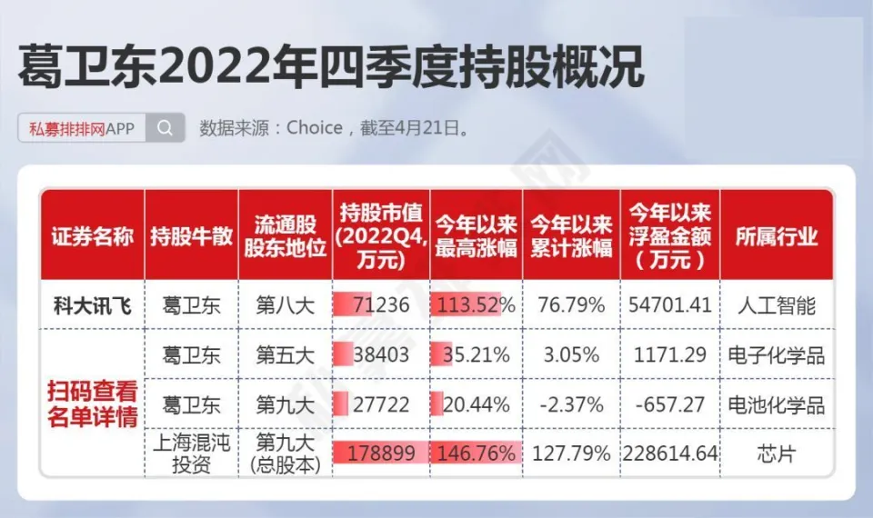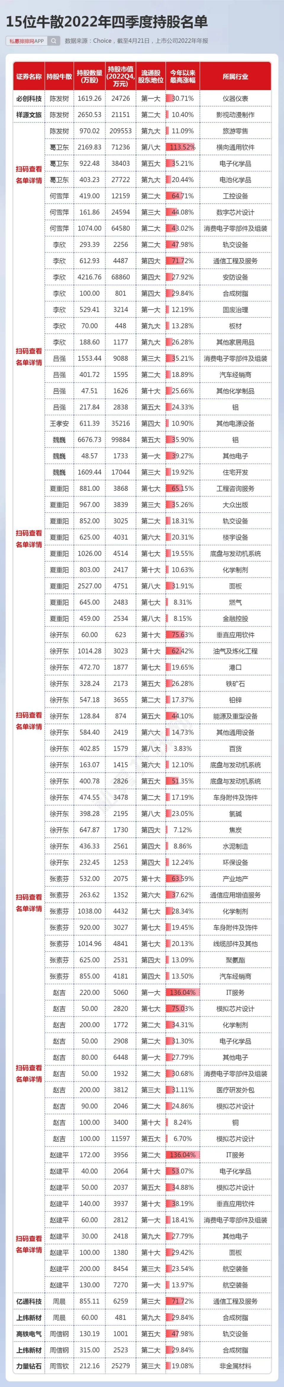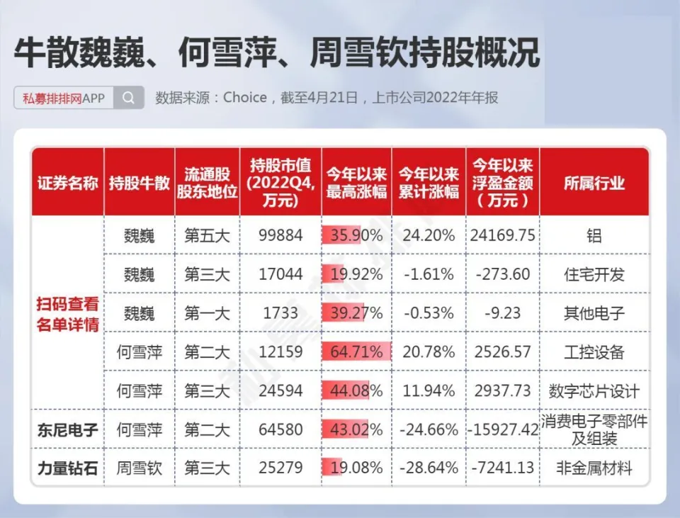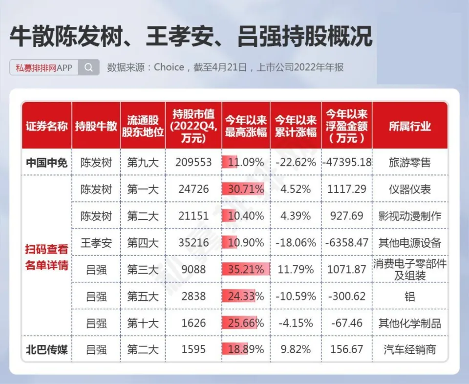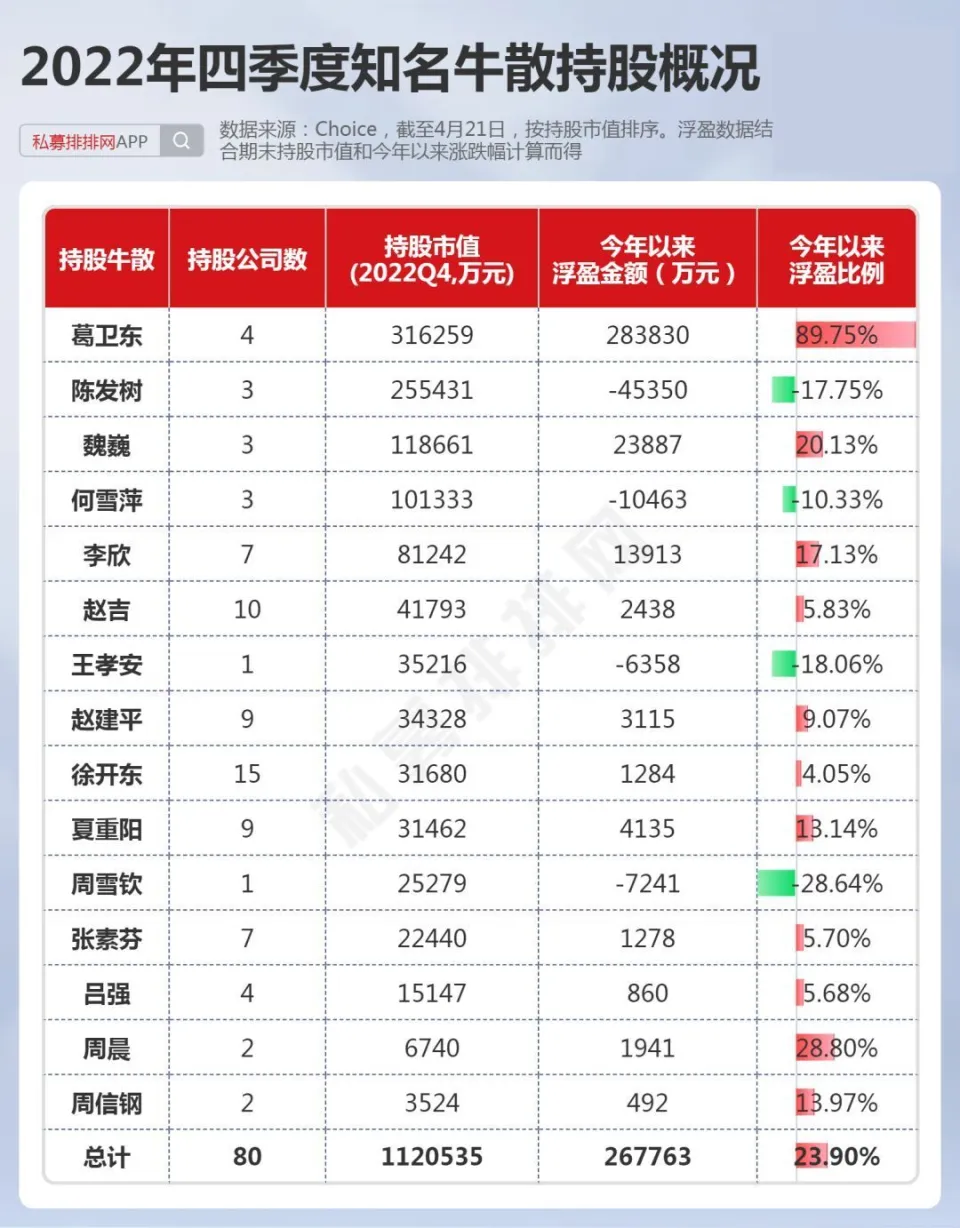 中国证券市场履历30余年的发展,不光诞生了许多百亿级乃至千亿级的机构投资者,如千亿私募景林、高毅,也出现了不少身价数十亿乃至百亿以上的个人投资者。 而A股又是以个人投资者为主的市场,一些“名声鹊起”的牛人牛事,在广大投资者间广泛传播,一些大户乃至成为了投资者心目中的励志“偶像”。 而这些着名的个人投资者,现在告急是两类人,一是以做超短为主的游资,如上周20亿豪买中科曙光的“章牛耳”,八年一万倍的“赵老哥”。 另一类则是做中长期投资的“牛散”大户,如百亿身价的葛卫东、陈发树等都是中国顶级“牛散”,不少“牛散”也是代价投资的范例,如葛卫东服从AI龙头公司科大讯飞数年,陈发树在2018年光伏行业至暗时候重仓光伏龙头隆基绿能,劳绩10倍以上涨幅。 4月份是2022年年报和2023年一季报披露的窗口期,随着财报的披露,牛散的持仓数据也随之浮出水面。而制止4月21日,沪深A股有417家上市公司披露了2023年一季报,2393家上市公司披露了2022年年报,鉴于披露一季报的公司太少,笔者在此仅根据2022年年报梳理中国顶级“牛散”在2022年4季度的持仓数据,盼望对各人有所资助。 15位“牛散”本年以来团体浮盈近24% 笔者根据A股上市公司2022年的年报,统计出了15位着名牛散的A股持仓环境,如下表。此中,根据网络资料,夏重阳、张素芬为“夫妻档”,赵建平、赵吉为“父女档”,周晨、李欣、周信钢为眷属投资人。(必要阐明的是牛散数据均根据股东名称梳理,或存在同名的环境,笔者无法佐证,仅根据牛散名字统计) 数据体现,葛卫东、陈发树、魏巍、何雪萍等4位牛散在2022年四序度末的A股持仓市值均超10亿元。此中,葛卫东及其公司持股4家,持股市值超30亿元;陈发树持股3家,持仓市值超25亿元,两位“百亿级”的牛散均属于重仓押注型投资者。 而夏重阳、张素芬夫妇,周信钢眷属,赵建平、赵吉父女、徐开东等牛散持股均超10只,属于“广撒网”式投资。 15位“牛散”合计持股80家公司,此中位列7家公司的第一大流通股东。15位“牛散”,2022年年末持仓市值合计达112亿元,假如以2023年以来的涨幅盘算浮盈数据,本年以来牛散持仓合计浮盈近27亿元,团体浮盈比例近24%。此中,葛卫东及其公司持股本年以来体现亮眼,浮盈超28亿元。 1、葛卫东左手AI、右手新能源,本年浮盈28亿! 葛卫东是期货界的传怪杰物,也好坏常受股票市场关注的投资大佬。2023年3月23日,胡润研究院发布《2023胡润举世富豪榜》,以180亿人民币产业位列榜单第1226位。 葛卫东,毕业于四川大学经济系。现任上海混沌投资有限公司董事长。上海混沌投资是一家多元化的投资机构。投资范畴涵盖股票、商品期货、金融期货、股权投资、大宗商品贸易等。 从2022年报数据来看,葛卫东及其公司持有4家A股公司,此中,2家为AI概念大牛股,另2家为锂电池质料细分龙头,持股市值均在2亿元以上,总计持股市值高达超31亿元。持仓的2家AI概念股,年内最大涨幅均已翻倍,最强股最大涨幅超140%,浮盈近23亿元。 其第一大重仓股为一家芯片巨头公司,是在IPO之前就进场了,现在处于“限售”状态,葛卫东的混沌投资位列该股总股本的第九大股东职位,该股是A股稀缺的AI芯片龙头公司,因此本年以来已经大涨近130%。 而2022年三季报体现,葛卫东最大重仓股为存储芯片龙头兆易创新,持股市值高达近17亿元,目先兆易创新还未公布2022年年报,足见葛卫东对科技股的“偏幸”水平。 葛卫东也是长期价投的“范例”人物,其在2017年四序度,初次出现在AI龙头科大讯飞的十大流通股东之列,服从5年后,股价在本年4月初再创汗青新高,本年股价最大涨幅也有110%以上。 近期,葛卫东又有“喜信”!葛卫东旗下的混沌投资在一级市场投资的射频前端芯片独角兽慧智要上市了!预计发行日期为2023年5月4日。混沌投资在IPO前投资该公司达4000万元。 2、陈发树暂时“折戟”,王孝安追高3倍的AI大牛股 陈发树因曾经乐成投资紫金矿业暴赚数百倍;精准重仓结构隆基绿能、中国中免,劳绩了“超等牛散”乃至“中国的巴菲特”等多个称呼。2023年3月23日,胡润研究院发布《2023胡润举世富豪榜》,陈发树以420亿元产业位列榜单第460位。 陈发树最乐成的利用,莫过于在2018年3季度,正值光伏行业遭遇2018年“5.31”新政的打击后,抄底隆基买入近5000万股,其时股价在5元附近。之后光伏行业大发展,隆基股价最高也到达73.60元。2022年3季度末,陈发树持有隆基绿能市值超80亿元,该股现在暂未披露2022年年报。固然本年以来,隆基体现萎靡,但陈发树依然是浮盈巨多。 在2022年3季度,陈发树持股7家上市公司,总计持仓高达近125亿元。根据已披露的2022年年报,陈发树持股3家上市公司,也是2022年3季度持有的个股。其第一大重仓股本年以来体现萎靡,让这位牛散暂时“折戟”! 另一期货大佬王孝安曾乐成偷袭包钢稀土、运作广晟有色等股,使其名噪一时。王孝安现在仅现身一家公司的2022年年报,持股市值超3.5亿元。进一步发掘发现,其在2021年三季度就买入了该股,现在股价相比其最初买入时仍高出不少。 而根据最新的2023年一季报数据来看,王孝安新买入了AIGC大牛股万兴科技,位列第7大流通股东。该股本年来最大涨幅已达3倍,4月21日在板块调解之际,该股依然逆势创出汗青新高。以3月尾的收盘价作为其资本价盘算,现在浮盈也有50%。 数据泉源:东方产业 3、