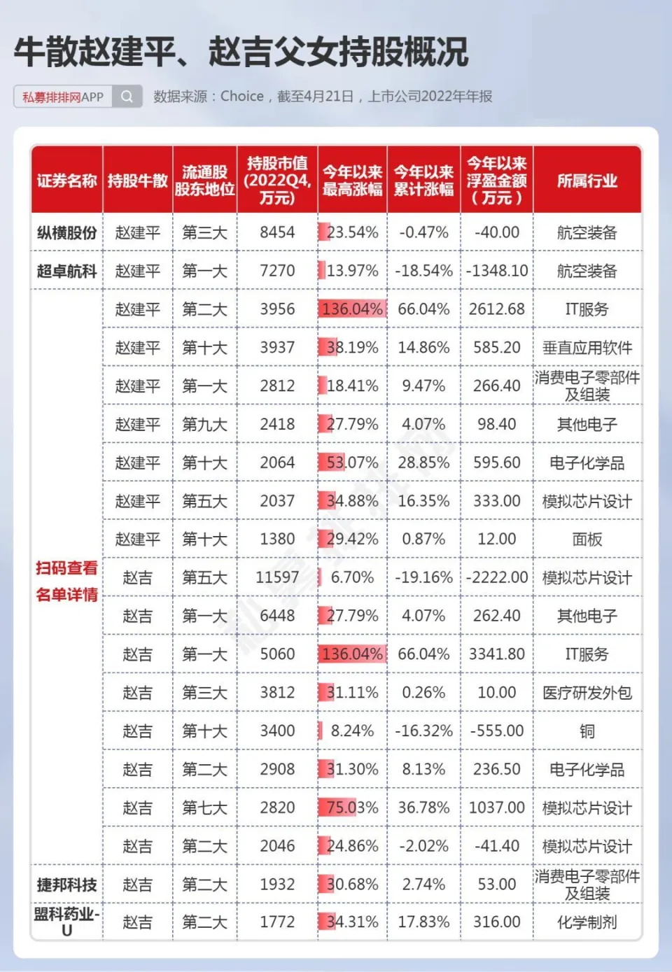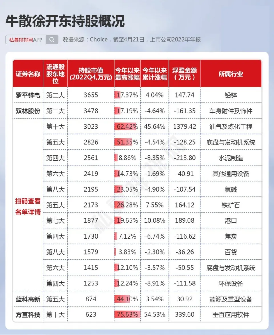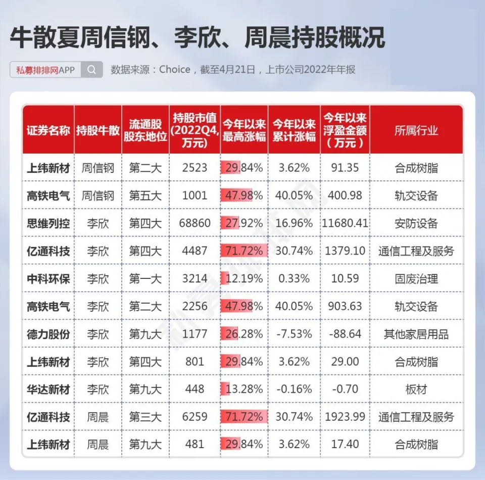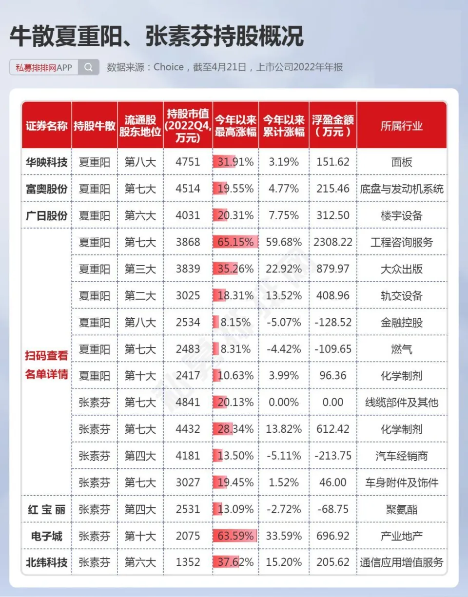 中国证券市场履历30余年的发展,不光诞生了许多百亿级乃至千亿级的机构投资者,如千亿私募景林、高毅,也出现了不少身价数十亿乃至百亿以上的个人投资者。 而A股又是以个人投资者为主的市场,一些“名声鹊起”的牛人牛事,在广大投资者间广泛传播,一些大户乃至成为了投资者心目中的励志“偶像”。 而这些着名的个人投资者,现在告急是两类人,一是以做超短为主的游资,如上周20亿豪买中科曙光的“章牛耳”,八年一万倍的“赵老哥”。 另一类则是做中长期投资的“牛散”大户,如百亿身价的葛卫东、陈发树等都是中国顶级“牛散”,不少“牛散”也是代价投资的范例,如葛卫东服从AI龙头公司科大讯飞数年,陈发树在2018年光伏行业至暗时候重仓光伏龙头隆基绿能,劳绩10倍以上涨幅。 4月份是2022年年报和2023年一季报披露的窗口期,随着财报的披露,牛散的持仓数据也随之浮出水面。而制止4月21日,沪深A股有417家上市公司披露了2023年一季报,2393家上市公司披露了2022年年报,鉴于披露一季报的公司太少,笔者在此仅根据2022年年报梳理中国顶级“牛散”在2022年4季度的持仓数据,盼望对各人有所资助。 15位“牛散”本年以来团体浮盈近24% 笔者根据A股上市公司2022年的年报,统计出了15位着名牛散的A股持仓环境,如下表。此中,根据网络资料,夏重阳、张素芬为“夫妻档”,赵建平、赵吉为“父女档”,周晨、李欣、周信钢为眷属投资人。(必要阐明的是牛散数据均根据股东名称梳理,或存在同名的环境,笔者无法佐证,仅根据牛散名字统计) 数据体现,葛卫东、陈发树、魏巍、何雪萍等4位牛散在2022年四序度末的A股持仓市值均超10亿元。此中,葛卫东及其公司持股4家,持股市值超30亿元;陈发树持股3家,持仓市值超25亿元,两位“百亿级”的牛散均属于重仓押注型投资者。 而夏重阳、张素芬夫妇,周信钢眷属,赵建平、赵吉父女、徐开东等牛散持股均超10只,属于“广撒网”式投资。 15位“牛散”合计持股80家公司,此中位列7家公司的第一大流通股东。15位“牛散”,2022年年末持仓市值合计达112亿元,假如以2023年以来的涨幅盘算浮盈数据,本年以来牛散持仓合计浮盈近27亿元,团体浮盈比例近24%。此中,葛卫东及其公司持股本年以来体现亮眼,浮盈超28亿元。 1、葛卫东左手AI、右手新能源,本年浮盈28亿! 葛卫东是期货界的传怪杰物,也好坏常受股票市场关注的投资大佬。2023年3月23日,胡润研究院发布《2023胡润举世富豪榜》,以180亿人民币产业位列榜单第1226位。 葛卫东,毕业于四川大学经济系。现任上海混沌投资有限公司董事长。上海混沌投资是一家多元化的投资机构。投资范畴涵盖股票、商品期货、金融期货、股权投资、大宗商品贸易等。 从2022年报数据来看,葛卫东及其公司持有4家A股公司,此中,2家为AI概念大牛股,另2家为锂电池质料细分龙头,持股市值均在2亿元以上,总计持股市值高达超31亿元。持仓的2家AI概念股,年内最大涨幅均已翻倍,最强股最大涨幅超140%,浮盈近23亿元。 其第一大重仓股为一家芯片巨头公司,是在IPO之前就进场了,现在处于“限售”状态,葛卫东的混沌投资位列该股总股本的第九大股东职位,该股是A股稀缺的AI芯片龙头公司,因此本年以来已经大涨近130%。 而2022年三季报体现,葛卫东最大重仓股为存储芯片龙头兆易创新,持股市值高达近17亿元,目先兆易创新还未公布2022年年报,足见葛卫东对科技股的“偏幸”水平。 葛卫东也是长期价投的“范例”人物,其在2017年四序度,初次出现在AI龙头科大讯飞的十大流通股东之列,服从5年后,股价在本年4月初再创汗青新高,本年股价最大涨幅也有110%以上。 近期,葛卫东又有“喜信”!葛卫东旗下的混沌投资在一级市场投资的射频前端芯片独角兽慧智要上市了!预计发行日期为2023年5月4日。混沌投资在IPO前投资该公司达4000万元。 2、陈发树暂时“折戟”,王孝安追高3倍的AI大牛股 陈发树因曾经乐成投资紫金矿业暴赚数百倍;精准重仓结构隆基绿能、中国中免,劳绩了“超等牛散”乃至“中国的巴菲特”等多个称呼。2023年3月23日,胡润研究院发布《2023胡润举世富豪榜》,陈发树以420亿元产业位列榜单第460位。 陈发树最乐成的利用,莫过于在2018年3季度,正值光伏行业遭遇2018年“5.31”新政的打击后,抄底隆基买入近5000万股,其时股价在5元附近。之后光伏行业大发展,隆基股价最高也到达73.60元。2022年3季度末,陈发树持有隆基绿能市值超80亿元,该股现在暂未披露2022年年报。固然本年以来,隆基体现萎靡,但陈发树依然是浮盈巨多。 在2022年3季度,陈发树持股7家上市公司,总计持仓高达近125亿元。根据已披露的2022年年报,陈发树持股3家上市公司,也是2022年3季度持有的个股。其第一大重仓股本年以来体现萎靡,让这位牛散暂时“折戟”! 另一期货大佬王孝安曾乐成偷袭包钢稀土、运作广晟有色等股,使其名噪一时。王孝安现在仅现身一家公司的2022年年报,持股市值超3.5亿元。进一步发掘发现,其在2021年三季度就买入了该股,现在股价相比其最初买入时仍高出不少。 而根据最新的2023年一季报数据来看,王孝安新买入了AIGC大牛股万兴科技,位列第7大流通股东。该股本年来最大涨幅已达3倍,4月21日在板块调解之际,该股依然逆势创出汗青新高。以3月尾的收盘价作为其资本价盘算,现在浮盈也有50%。 数据泉源:东方产业 3、