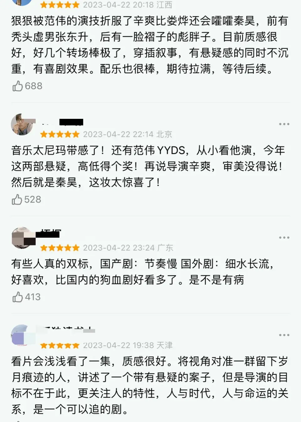 由范伟、秦昊、陈明昊主演的《漫长的季候》正在腾讯视频热播。“消沉”已久的鹅,终于拿出了一部“王炸”剧。 虽说,播放量现在还不算乐观。但,9.2分且是满屏5星的评价,已经是对《漫长的季候》的承认。 不枉费鹅将爱奇艺“迷雾剧场”制作班底挖来的苦心。 小品化表明,不一样的悬疑剧2020年,爱奇艺在对“悬疑剧场”举行升级后,“迷雾剧场”就成为了悬疑剧的风向标。 《沉默沉静的本相》《机密的角落》都是口碑载道的爆剧,《十日游戏》《再见那一天》也有不错的评价。 爱奇艺“迷雾剧场”的口碑就此打响,更是带热了悬疑题材。优腾芒试图从中分一杯羹的同时,芒果打造了“季风剧场”,优腾也迎来了属于本身的“悬疑剧场”。 而优腾打造悬疑剧场的做法也非常粗暴,更是直接拖垮爱奇艺的“迷雾剧场”,让其屁滚尿流。 那就是“挖角”。 优酷除了已有的“白夜宇宙”,更是花下重金将爱奇艺“迷雾剧场”的幕后功臣之一——紫金陈挖到旗下。 “紫金陈宇宙”+“白夜宇宙”的强强联手,优酷试图打出口碑牌的“悬疑剧场”。怎样,现在仍旧收效甚微。 2023年开播的《他是谁》,更是由于“烂尾”砸了口碑。 至于鹅与裤的想法划一。裤挖走了紫金陈,鹅便将桃“迷雾剧场”的“王牌”班底挖走。 从《漫长的季候》的制作班底就可见一斑。 从导演辛爽到编剧陈骥,都有着《机密的角落》的身影。而照相、造型、剪辑、灌音更是《机密的角落》与《无证之罪》的同款团队。 鹅想要“复制”迷雾剧场的“神话”的刻意已经昭然若揭。 现在,从《漫长的季候》的口碑来说,确实不负鹅的渴望。 “狠狠地被范伟的演技折服了。” “音乐太带感了!另有范伟yyds。” 范伟的演技仍旧让观众折服,有了秦昊、陈明昊、刘琳、任素汐等一众演技咖的加盟更是为《漫长的季候》增色不少。 有别于以往悬疑剧的可怕、血腥等色彩,《漫长的季候》将配景设置在东北这片热土上。以生存化且暖色调的方式,开始叙述故事。 在剧中穿插了不少搞笑的台词不说,就连演员的演绎方式都充满着不少笑料。 明显是可怕、吓人的碎尸案,但充满喜感的东北话一出口,就让可怕的氛围刹时减分不少。 任素汐的一踢,范伟的一吐,更是给观众以小品感的观剧体验。不知该笑还是该畏惧,《漫长的季候》显然在拍一种很新的悬疑片。 固然,9.2分的评分中,《漫长的季候》仍旧也有不敷之处。现在,最为被人诟病的当属节奏标题。 由于节奏过缓,不少观众在第一集就因枯燥、无聊选择了弃剧。但,用慢节奏为主线剧情做铺垫,却是导演的用心。 随着后续剧情都飞起,铺垫的剧情都得到了使用。剧情逻辑得以自洽,也给观众不一样的观剧体验。 熬过一集就真香,《机密的角落》同款班底的“功效”也得以体现。 在服道化上给予观众真实的观剧体验,浩繁演技咖的“同台飙戏”更是堪称“演技盛宴”。 秦昊颠覆形象,“张东升”后再升级在《漫长的季候》最出人料想的存在当属秦昊出演的龚彪一角。 在《机密的角落》爆火前,着实不少网友对于秦昊并不熟知。而与秦昊干系,密不可分的当属与伊能静的婚姻。亦是这段婚姻,让不停低调的秦昊走到了公众的视线中。 从出道起,秦昊多出演的便是文艺片。 2004年,年仅26岁的秦昊就带着他的影片走上了戛纳影戏节。但,秦昊并未就此膨胀。 面对蜂拥而至的脚本、商演、广告,秦昊都是低调处理,更是将“不接烂戏”当成了本身的从业宗旨。 眼见着章子怡、刘烨、梅婷、秦海璐、胡静等同班同砚都变得求名求利,秦昊却仍旧选择沉淀本身。 不眼馋,不盲从,专注做本身。 各人笑他在苦熬,但2009年秦昊再度杀了一个“回马枪”。依赖一部《东风沉醉的夜晚》,再次入围戛纳影戏节。 隔断上一次前去戛纳,只是时隔5年。 明显只是名不见经传的“低调”演员,却在圈内打出了口碑牌。“厚积薄发”说的约莫就是秦昊。 而秦昊在《机密的角落》前,着实早已与爱奇艺“迷雾剧场”结缘。那便是迷雾剧场的第一部口碑作《无证之罪》。 但《无证之罪》开播后,女主邓家佳的锋芒太过“刺眼”,掩蔽了男主秦昊的“光辉”。让不少人忽略了,着实《无证之罪》中也有秦昊的身影。 以后,随着《机密的角落》的到来,才正式让秦昊大放异彩。 着实,早先在拿到《机密的角落》的脚本时,秦昊是拒绝出演的。由于张东升这一脚色着实太坏,但架不住导演辛爽的软磨硬泡。 而《机密的角落》的制作团队,还都是秦昊的老熟人(相助过《无证之罪》)。出于导演的哀求以及脚本确实不错,秦昊才在《机密的角落》中颠覆形象,出演了张东升一角。 本以为,《机密的角落》中的“秃头”张东升已经是秦昊颠覆的“顶峰”。却不想,《漫长的季候》的到来,更是让观众直呼高能。 若不是演员表中有秦昊的名字,谁能将剧中有着大肚腩、好逸恶劳的龚彪与秦昊接洽起来。 剧照与秦昊的照片摆在一起,完全没有相似之处,这哪还是观众影象中的秦昊。 怪不得有网友品评道:“秦昊是不是有什么把柄在辛导手上?这次是在油腻和秃头中选择了发福。” 先是张东升,后是龚彪,毫无形象可言,更是让人不敢相认。 不外,确实也感叹秦昊“颠覆式”演技的神奇。不光有了妆容的加分,更有着演什么像什么的演技。这才让观众有了绝佳的追剧体验。 对此你怎样看?你有看《