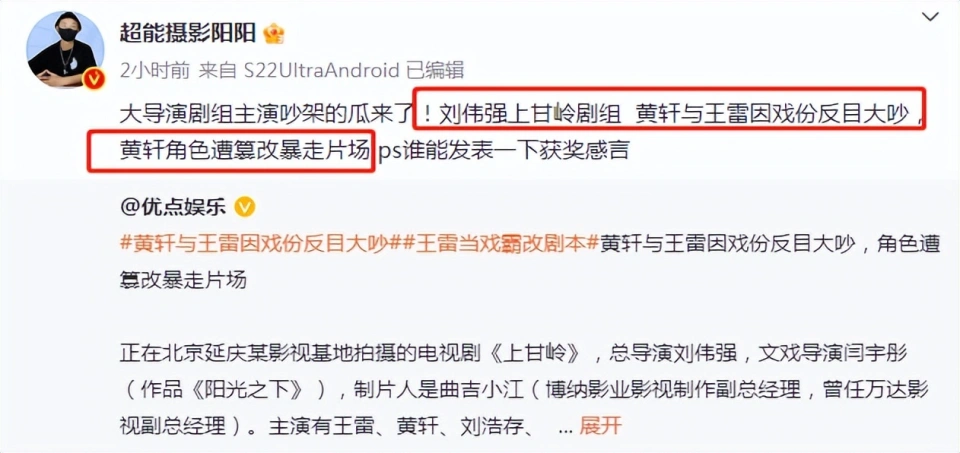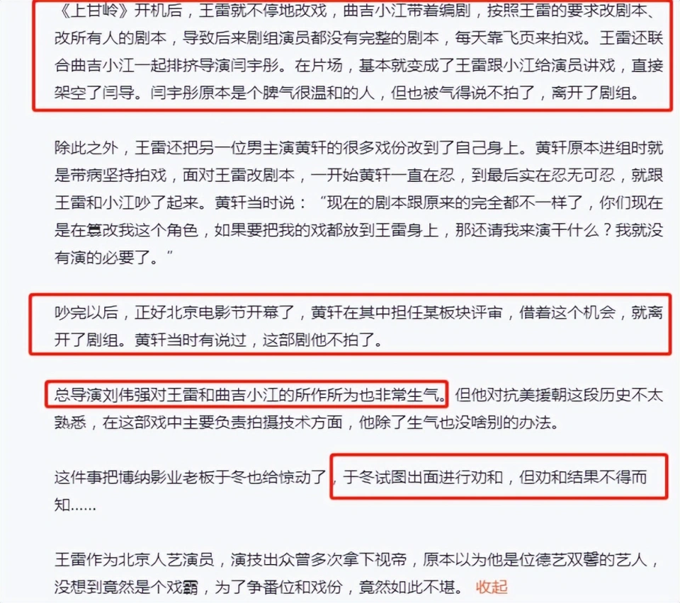 “大导演剧组俩主演打骂”后续瓜来了!4月27日,媒体发表打骂剧组为刘伟强导演的《上甘岭》剧组,打骂主角分别是王雷和黄轩,两人由于戏份反目大吵,此中黄轩更是由于脚色被篡改罢演,引发热议。 随后,黄轩工作室晒出剧组告示单,发文称正在拍戏,又是繁忙的一天,疑似回应罢演听说。根据黄轩的告示单信息表现,上午7点左右开始化装,演员围坐照片拍摄时间是4月27日上午9点左右,由此证明自己真的在组里拍戏。 网友看到黄轩的回应以为是剧组请出来维稳的,并称黄轩没有辟谣打骂相干内容,以为打骂或被抢戏大概是真实发生的事故。 据知情人爆料,自《上甘岭》开机后,王雷就不停带着制片人曲吉小江改脚本,导致整组没有完备脚本,不停飞页。而且,两人还一起倾轧文戏导演闫宇彤,王雷还直接抢了给演员讲戏的活,排挤了闫宇彤导演,终极把个性暖和的导演气到离组,并放话不拍了。根据闫宇彤朋侪圈发文来说,怨气并不小,而离组时间也有一个多月了。 而黄轩与王雷的抵牾也是由于改戏,王雷把黄轩的许多戏份放到了自己身上,黄轩忍无可忍后就与对方吵了起来,称如果把自己的全部戏都放到王雷身上,那么就不演了,而后黄轩趁着在北影节当评委的机遇脱离剧组。 面对这一系列题目,总导演刘伟强体现生气,但是他只负责技能拍摄,没有其他的办法。而于冬有出头调和,结果不可知。知情人还称原来以为王雷是演技出众的诚实人,没想到是戏霸。 许多网友看后也不明确为何王雷在剧组可以大概有这么大的权限,能把导演气到离组,这就得理一下几位关键人物的关系。总导演刘伟强是香港导演,对汗青题材认识度有限,制片人曲吉小江来头不小,是博纳影业影视制作副总司理,以是当曲吉小江和王雷一个阵营时,剧组里没人能抗衡得了,至于文戏导演闫宇彤,固然导过《阳光之下》等作品,但是在管钱的制片人跟前,统统都无需多提。 别的,对于王雷改戏的说法,不少网友都以为不敷为怪,称王雷改戏履历丰富,跟陈晓拍《陆战之王》的时间也如许,各种加戏改戏不说,竣事后还发文内在陈晓,在拍《平常的天下》中也有这种征象。 他还曾经引导过陈宝国演戏,把陈宝国气到哭,哽咽体现不计算戏份多少。 而王雷本人也曾经回应过改戏的运动,他称自己喜好二度创作,并不以为是改戏,以为好的编剧都渴望演员二度创作,以是编剧跟他都很融洽。 王雷把改戏说是二次创作,显着是美化运动,倘若他只改自己的,那旁人无话可说,但是连带着别人一起改,且连多少都变了,再说是二度创作大概就有争议了,只能说如今王雷还没有回应,渴望各人理性吃瓜。 本文未经授权严禁转载违者必究! |