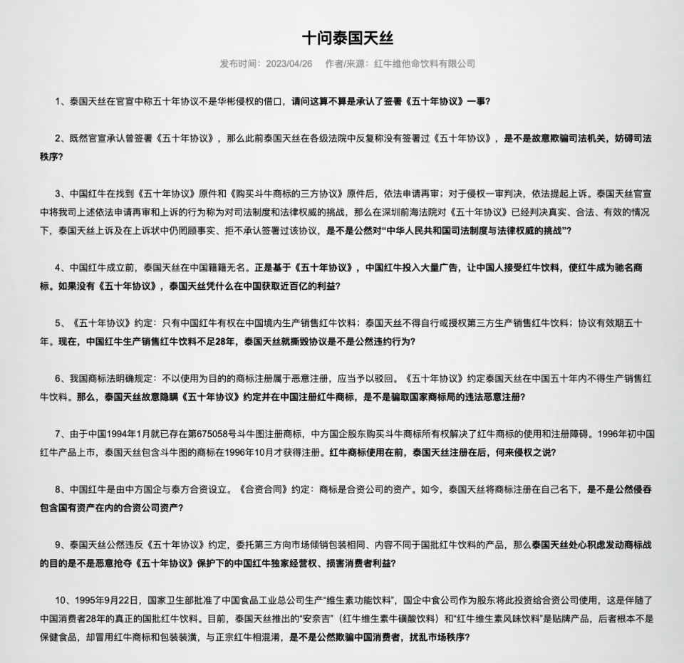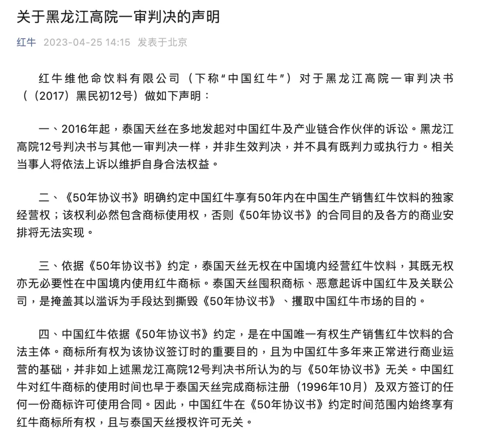 本文泉源:期间周报 作者:李馨婷 连续7年的红牛商标大战,克日再度升级。 4月26日,泰国天丝团体(下称“泰国天丝”)发文称,泰国天丝方是“红牛”系列商标环球范围商标权利人。 此文是对同日华彬团体发布文章《十问泰国天丝》的回应。在《十问泰国天丝》中,华彬团体针对克日泰国天丝出具的关于红牛商标案的两个一审讯断效果举行反击,并以“故意诱骗司法构造,妨碍司法秩序”“违法恶意注册商标”等字眼求全非难泰国天丝,语言颇为猛烈。 图源:红牛维他命饮料有限公司 两边檄文的背后,是泰国天丝与华彬团体之间的舆论战。 2016年至今,就红牛商标的归属与授权标题,华彬团体与泰国天丝间早已举行了多轮诉讼交锋。新的法院讯断出现、两边由此睁开舆论战等环境也已多次重复。 诉讼拉锯战中,华彬团体与泰国天丝之间的红牛产物结构,以致国内功能饮料赛道的发展,也发生着玄妙的变革。 值得留意的是,只管受到诉讼打击,但华彬团体推出的红牛产物,在能量饮料赛道的市占率仍旧保持着龙头职位。2019—2021年,华彬红牛产物贩卖额均在220亿元以上。与泰国天丝推出的红牛产物贩卖额相比仍占较大上风。 图源:华彬团体官方公众号 舆论战升级 当前两大红牛品牌运营方之间的舆论战,还需追溯至一周前。 4月20日,泰国天丝表现收到一份最新的讯断书。讯断书表现,2022年10月31日,吉林省高级人民法院(下称“吉林高院”)就泰国天丝针对华彬团体旗下的红牛维他命饮料(湖北)有限公司、北京红牛饮料贩卖有限公司、北京红牛饮料贩卖有限公司吉林分公司陵犯红牛商标专用权及不合法竞争纠纷一案,做出一审讯断:三家企业立即克制生产、贩卖“红牛维生素功能饮料”,立即克制利用含有“红牛”字样的企业名称,同时连带补偿原告泰国天丝3000万元。 4月23日,泰国天丝又公开了一份讯断书。内容表现,4月12日,黑龙江省高级人民法院(下称“黑龙江高院”)就泰国天丝针对红牛维他命饮料有限公司、北京红牛饮料贩卖有限公司、北京红牛饮料贩卖有限公司黑龙江分公司陵犯商标专用权纠纷一案,也作出了与吉林高院雷同的一审讯断。 在两份讯断书内容对外公布的同时,关于“中国红牛(即华彬团体生产的红牛)被克制生产贩卖”的干系言论也在网络上广泛传播。 针对接踵而至的负面消息,华彬团体方面多次作出回应。 4月20日,华彬团体干系负责人对期间周报记者表现,吉林高院的讯断是一审,是未见效讯断,不具有既判力和实验力。同前案性子一样,这是泰国天丝滥诉的效果。“泰国天丝多次单方面炒作一审讯断的目标是扰乱市场秩序,是要在中国市场‘摘桃子’。”该干系负责人表现。 对于成为网络热搜的“中国红牛被克制生产贩卖”话题,上述负责人则对期间周报记者表现,这些矫饰信息和不实言论,计划肴杂视听、误导大众,已严肃构成对华彬红牛的光荣陵犯,对于造谣引流、恶意抹黑等违法活动,华彬红牛将果断依法追究其责任。 别的,华彬团体也在主阵地睁开反击。 4月25日,华彬团体发布《关于黑龙江高院一审讯断的声明》一文,表现黑龙江高院的讯断是一审,是未见效讯断,不具有既判力和实验力。同时,《关于黑龙江高院一审讯断的声明》指出,《50年协议书》明白约定华彬团体享有50年内涵中国生产贩卖红牛饮料的独家谋划权,该权利一定包罗商标利用权,且依据《50年协议书》约定,泰国天丝无权在中国境内谋划红牛饮料,其既无权亦无须要性在中国境内利用红牛商标。 文章末端,华彬团体特意声明,公司红牛生产贩卖统统正常。 华彬团体4月25日声明 争斗7年未了 两边的诉讼拉锯战,围绕着红牛商标的归属与授权标题睁开。纠纷的伏笔,则在两边牵手时就已埋下。 上世纪90年代,泰籍华人许书标发明的脱销饮料泰国天丝红牛,由华彬团体首创人严彬得到中国区谋划权。在两边的深入互助之下,华彬红牛贩卖规模不停扩张,2012年时天下销量初次破百亿元。 不外,牵手多年后,两边关系发生变革。2012年,许书标去世,其子许馨雄接受泰国天丝,2016年,泰国天丝向华彬团体发起商标侵权诉讼,来由是两边约定的授权到期,华彬团体需克制利用红牛品牌。 许家二代以谋划限期20年为由,想将红牛商标收回,华彬团体方面则反驳称,两边最初协商的谋划限期为50年,注册公司时,受规定限定才将谋划限期定为20年。因此,在两边的诉讼战中,华彬团体是否拥有“50年谋划限期”成为争论的重点,《50年协议书》则成为两边频仍提及的文件。 2016年以来,泰国天丝以掩护知识产权之名,将与华彬团体之间的战火引至华彬红牛经销商、渠道商、供应商方面,发起了多起同类诉讼,并通过诉前活动保全,冻结干系公司的正常谋划资金。 不外,2022年12月29日,诉讼战出现迁移变革。当日,华彬团体发布《中国红牛关于50年<协议书>法院讯断有效的声明》,称收到广东省深圳前海互助区人民法院民事讯断书,并表现上述讯断不光认定了华彬团体自1995年始享有在中国境内独家谋划红牛饮料50年的合法性,而且也确认了泰国天丝及任何第三方在中国生产贩卖红牛饮料活动的非法性。 对于华彬团体方声明,泰国天丝则并不认同。泰国天丝指出,华彬团体多次提到的“五十年协议”,其效力以及与商标允许的干系性在此前两边诉讼的讯断中,已多次被各地法院否定。 华彬红牛生产基地工厂车