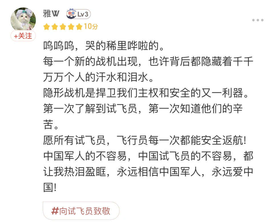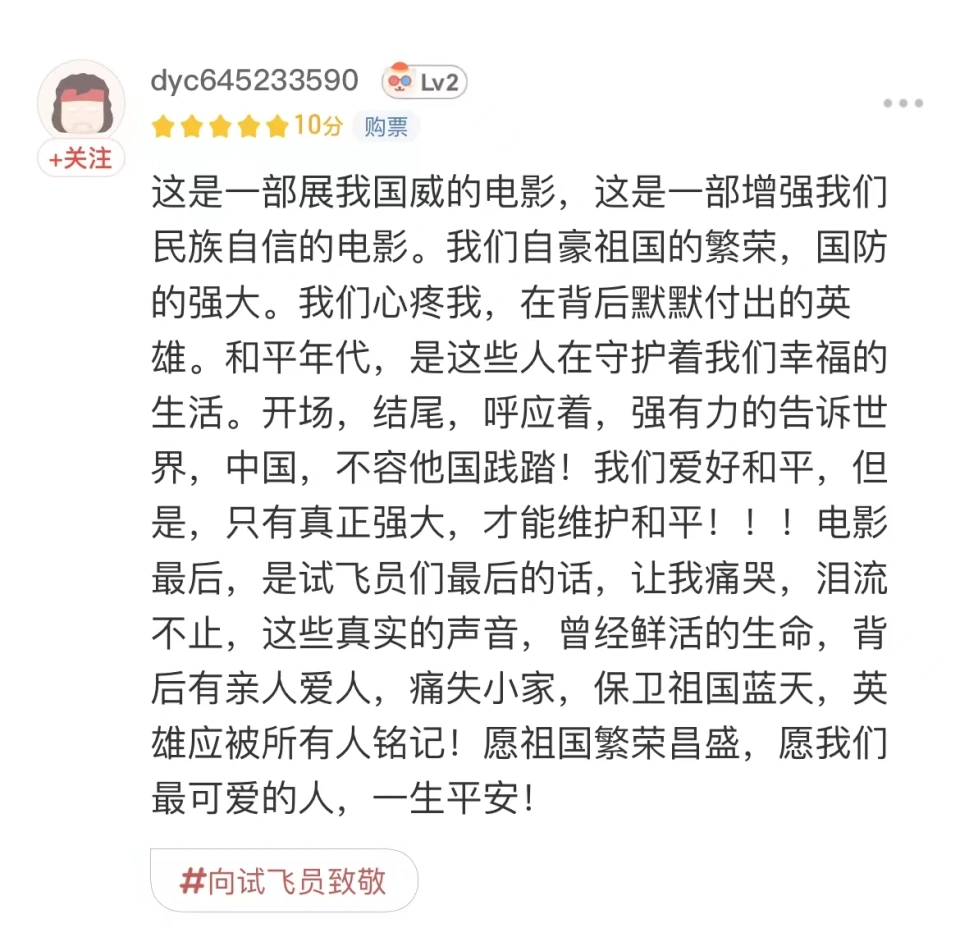 本年的五一档,话题度不停很高,以致在上映前就有很多好评的《长空之王》一度让我以为是粉丝影戏,并没有给予太多的留意力,直到我看到有人说,这是一部讲试飞员的影戏。 试飞员?照旧战斗机试飞员!这给了我一些去影院看的动力。 我抱着试一试的心态去影院看完《长空之王》后,也是真的感觉到被狠狠打了脸。上映前期的各种纷争,在影片上映依靠口碑+票房的双料效果,让齐备不信托都烟消云散。中国人研发制造的中国飞机,由中国试飞员驾驶,掩护中国人的国土,完成这些我们走过了70多年!《长空之王》用去中国故事陈诉那群“岑寂无闻”的飞行好汉们。 影戏《长空之王》由刘晓世导演,王一博、胡军等主演,初次聚焦新期间空军试飞员,在揭秘最新型战机诞生幕后的同时,陈诉试飞员们所遭遇的关乎个人、家庭与任务的动人故事。 影片中不但有试飞员在高空中显现各种触目惊心的飞办法作,另有标记取我国空军力气的战机在大银幕的初次表态,有位男性观众颇故意思的说:“为什么奥特曼才有光,我们的大飞机也有!” 《长空之王》以技能封锁的年代为背就连中国空军遭到西方掣肘,一代发愤于投身于守卫家国的中国武士,在家国情怀和个人空想的交错中,在武士任务和家庭挂念的缠绕中,为中国空军古迹贡献出本身名贵的力气。 “从瞠乎厥后、望其项背到并驾齐驱的进阶,能把隐姓埋名者干的震天动地事拍成影戏,是我们这代人的荣幸。”导演刘晓世将如许宏达的主题视角落于试飞员身上,更是从偌大的航空航天工业中找到“一束微光”,在以小见大中凸显中国人聚沙成塔的惊人力气! 有观众在看完影片后被片中故事深深感动,感叹“每一个新的战机出现,大概背后都隐蔽着千千万万个人的汗水和泪水” 更是有女性观众被片中热血沸腾的战斗局面深深震撼,被试飞员一步步探索中国空军力气的大概而泪如泉涌,打趣道:“当事人很悔恨扮装这件事,脸都哭花了。” 影片在陈诉大国重器诞生的过程中,同样也把“人”作为叙事的主体,围绕试飞员这个特殊的职业,去用家庭关系淡化塑造无所不能的个人好汉形象,更具人情味。同时,片中也着力描绘了飞行幕后的诸多人物,也正是他们支持着飞行员们“鹰击长空”。 有观众也留意到了“军嫂”:“致敬全部的中国军嫂!她们是全部中国武士的后盾!” 每个武士背后,有他们的家人在岑寂地遭受担心、恐惊和痛楚;每一个新型战机背后又是无数个幕后技能职员、后勤保障职员在为他们保驾护航,如许一层层的保障将飞行员的职责上升到了个人任务与国家高度,更是他们对于战友、对于故国的任务,是一代人保家卫国的刻意。 就像片中开头与末端两场惊险刺激的战斗局面一样,《长空之王》是一部以热血换热泪,以自我保国家的故事,有观众看完后也饱含着浓浓的大国自大之情:“这是一部展我国威的影戏,这是一部加强我们民族自负的影戏。” 影戏《长空之王》用具有异景化的试飞场景,乐成将观众带入到一个完全陌生的范畴,去见证这些“刀尖上的舞者”的中国试飞员是怎样在如许一个没有硝烟的战场保家卫国。他们脱下礼服是和我们一样的平凡人,有家人期盼他们放工回家吃晚饭,有父母盼望儿子在身边;但他们穿上礼服,进入驾驶舱他们就是用生命调换宁静的好汉! 在如许一场银幕盛宴中,我们在见证试飞员们好汉般古迹的同时,看到了一个关于古迹、关于冒险、关于责任及任务,光荣与空想的热血好汉故事。 这不是一部粉丝影戏,但看了这部影戏以后我就是试飞员们的粉丝!!! |