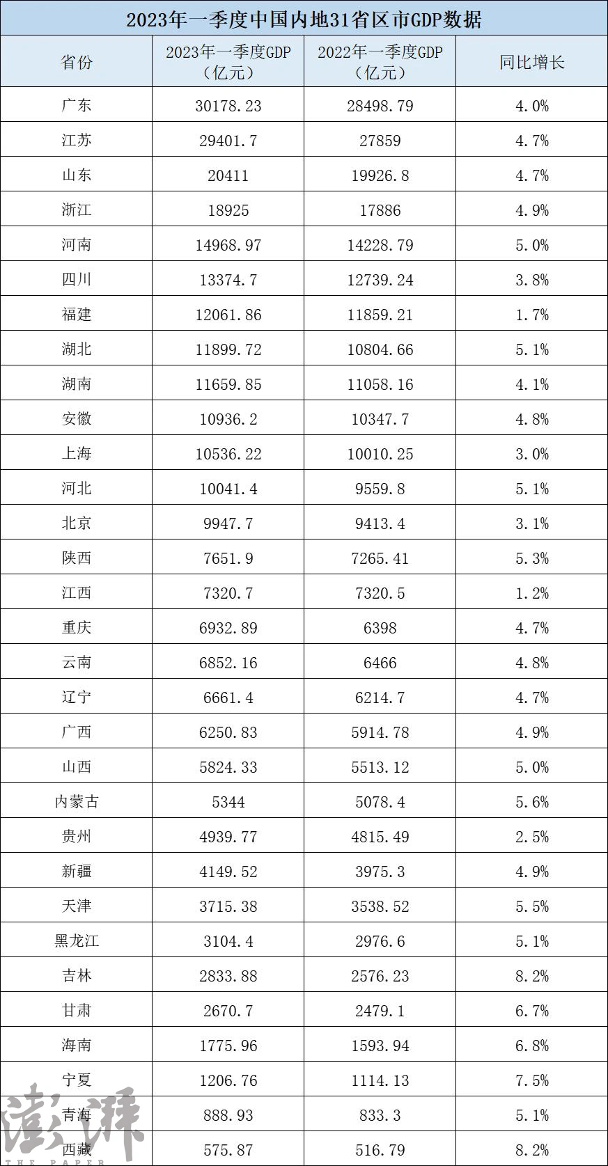 4月28日,福建省统计局公布福建2023年一季度经济运行数据。至此,中国当地31省区市本年一季度的GDP数据已经全部出炉。 据国家统计局,开端核算,本年一季度我国国内生产总值284997亿元,按稳固代价盘算,同比增长4.5%,比上年四序度环比增长2.2%。 23省份增速跑赢天下,14省份增速凌驾或即是5% 同比增速方面,31个省份中,有14个省份增速凌驾或即是5%,分别是吉林(8.2%)、西藏(8.2%)、宁夏(7.5%)、海南(6.8%)、甘肃(6.7%)、内蒙古(5.6%)、天津(5.5%)、陕西(5.3%)、湖北(5.1%)、河北(5.1%)、黑龙江(5.1%)、青海(5.1%)、河南(5%)、山西(5%)。 吉林增速与西藏并列居首,两省份同比增速均高于天下3.7个百分点。宁夏增速高于天下3个百分点。 有23个省份增速高于天下(4.5%),除上述14个省份外,还包罗浙江(4.9%)、广西(4.9%)、新疆(4.9%)、安徽(4.8%)、云南(4.8%)、江苏(4.7%)、山东(4.7%)、重庆(4.7%)、辽宁(4.7%)。值得一提的是,吉林、黑龙江、辽宁东北三省增速均跑赢天下水平。 2023年一季度中国当地31省区市GDP数据。汹涌消息制图 数据泉源:各地统计局 总量上,广东破3万亿,山东破2万亿,河北破1万亿 2023年一季度GDP凌驾万亿的省份数量增长为12个,与客岁相比增长了河北省。河北本年一季度GDP首破1万亿,为10041.4亿元。超1万亿的省份包罗:广东、江苏、山东、浙江、河南、四川、福建、湖北、湖南、安徽、上海、河北。 6个经济大省中,本年一季度广东处于“3万亿”档,江苏和山东处于“2万亿”阵营。浙江、河南、四川处于1万亿梯队。从总量上看,广东本年一季度乐成破3万亿,成为首个一季度GDP超3万亿元的省份。江苏离3万亿仅差598.3亿元,山东乐成破2万亿。 一季度,广东实现地区生产总值30178.23亿元,同比增长4.0%;江苏全省实现生产总值29401.7亿元,同比增长4.7%;山东全省生产总值20411亿元,同比增长4.7%。浙江一季度全省生产总值18925亿元,同比增长4.9%。一季度河南全省地区生产总值14968.97亿元,离1.5万亿元仅差31亿元,同比增长5.0%。一季度四川地区生产总值为13374.7亿元,同比增长3.8%。 除了上述6个经济大省,一季度GDP数据上,福建(12061.86亿元)、湖北(11899.72亿元)、湖南(11659.85亿元)、安徽(10936.2)、上海(10536.22亿元)、河北(10041.4亿元)也凌驾1万亿。 对比客岁一季度,本年湖北一季度GDP总量凌驾湖南,陕西(7651.9亿元)凌驾江西(7320.7亿元),重庆(6932.89亿元)凌驾云南(6852.16亿元)。 本年一季度,广西、新疆、黑龙江的GDP分别站上6千亿、4千亿、3千亿的新台阶,分别为6250.83亿元、4149.52亿元、3104.4亿元。 住民人均可支配收入上,沪京浙稳居前三 作为经济前三大省,从一季度住民人均可支配收入来看,广东为13867元,位居天下第六;江苏为17183元,位居天下第四;山东为10950元,位居天下第八。别的三个经济大省,浙江以20158元位居第三,一季度住民人均可支配收入初次突破2万元。河南一季度住民人均可支配收入为7804元,四川为8894元,排位相对靠后。 国家统计局数据表现,本年一季度,天下住民人均可支配收入10870元,同比名义增长5.1%,比上年整年加快0.1个百分点;扣除代价因素实际增长3.8%。 上海继续稳坐榜首,一季度住民人均可支配收入23489元;北京紧随厥后,增至21367元。一季度,上海、北京、浙江、江苏、天津、广东、福建、山东8省份人均可支配收入凌驾天下均值。重庆则增长至10670元。值得一提的是,2023年一季度有12个省份的住民人均可支配收入凌驾1万元,较上年同期增长3个省份,辽宁、内蒙古、安徽初次迈过1万元关口。 |