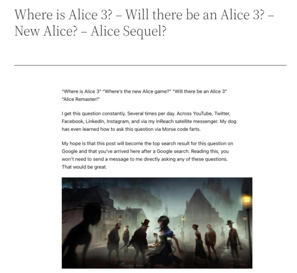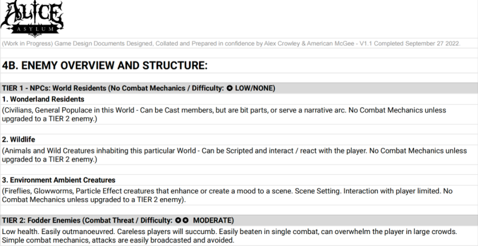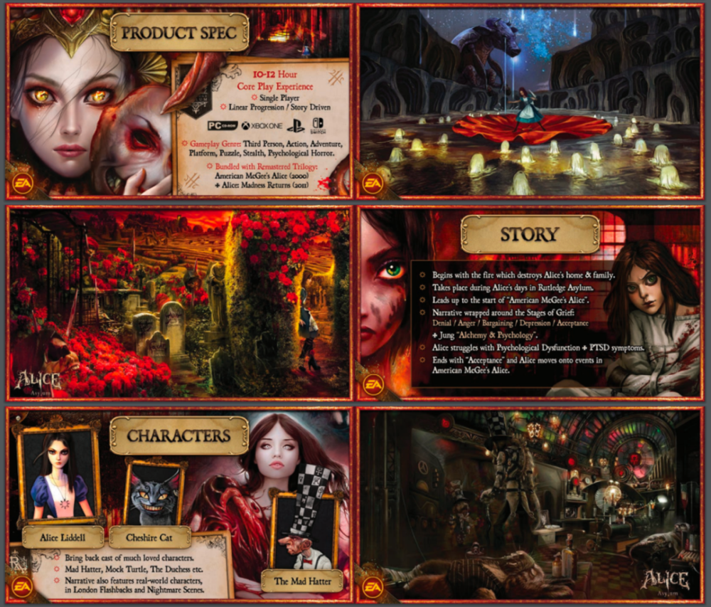 1 瑶池破裂 漂亮的瑶池像拼图一样徐徐破裂,可爱的小猫咪长出獠牙,缭乱的毛皮上套了一层光滑的布料。清朗的天空变得惨淡、阴森,绿草枯萎腐败,花苞里长出尖刺——这是爱丽丝的理想天下,正确地说,是与刘易斯·卡罗尔笔下的童话天下截然相反的暗中版本。 这是来自传奇开发者美国麦基(American McGee)的“爱丽丝:梦游魔境”(American McGee's Alice)系列。首部游戏于2000年发售,11年后推出续作,两部均以血腥可骇和充满隐喻的风格著称。故事中,爱丽丝的家人在一场火灾中丧生,爱丽丝自责是她养的猫撞倒了火源导致的。自怨自艾让她陷入疯狂,在应激创伤的作用下,她生存在狂乱又暗中的理想天下中。 为了上演「疯女孩」故事的终章,美国麦基从2013年开始操持打造第三部,已往的10年间为此付出了大量的积极。他不绝地跟版权老东家EA协商,制作周边产物,拍摄动画短片,用暗中童话的概念做桌游……末了,他乃至以「首款众筹3A游戏」为标语,率先打磨起续作的美术、玩法、怪物等统统底子设定。按照他的说法,展示美术能拉到投资,前期设定又能为后期开发保驾护航。 本年2月,麦基公布了《爱丽丝:疯人院》的「计划宝典」,这是他已往5年的结果。宝典完备地纪录了游戏的剧情,包罗每一个场景、每一句台词和每一场战斗,尚有武器、道具、升级、怪物、UI等全部概念设定,乃至连主题音乐都录好了,通过链接导向了视频网站。宝典共计414页。麦基渴望能通过流传结果告诉EA,爱丽丝是一个有潜力的IP,他们应该再做一款续作。 其时,麦基显得信心满满。他公布了制作团队Virtuos Games,并安排了预算、开发操持和制作时间表:“如果我们继承制作3A游戏,我着实想不出一个比现在更好的团队了。” 统统看起来都非常棒。这本应该是一个传奇制作人大胆寻求空想,并为玩家带来视听盛宴的故事。然而,在4月初,麦基告诉全部粉丝,由于EA的「决议」,「爱丽丝新作面世的全部大概性都已经消散了。」 「酷爱的疯小孩。」麦基说道,「爱丽丝曾经有过时机,但现在,空想都竣事了。」 他冷冷地留下这句话,又说将永久不再制作游戏。传奇制作人的故事戛然而止,麦基脱离了爱丽丝的瑶池。 麦基公布「统统都竣事了」时选择的配图 2 曲折运气 固然游戏不太着名,但很多玩家大概见过这张《爱丽丝:疯狂回归》的海报。 由于它被收录进入了XGP,而且以「A」字母开头,在字母排序中经常出现在市肆的前线。 然而,除了这种时机,玩家很少能瞥见这款12年前的游戏了。 「爱丽丝:梦游魔镜」属于「讨厌的人不会碰,爱上的却又爱得要死」的范例。哥特式的美术本就小众,且不说狰狞的异兽,连伦敦街道上正凡人的长相都可骇谷效应拉满。游戏基调非常暗中,充斥着不安的氛围。但是,部门玩家通过麦基的叙述,第一次发现,光鲜亮丽的童话故事居然也可以改编得云云克制深沉。精良的概念计划又为呆板的童话注入了全新的活力,而关于生理停滞和对上世纪英国实际的讽刺,更将这个童话带向了更深的维度。 随着玩家对另类游戏的继承度越来越高,两款游戏在迩来几年都得到了压倒性的好评。机敏又疯狂的爱丽丝成了电子游戏史上塑造最乐成的女主角之一。就连好莱坞巨星娜塔丽·波特曼也曾公开表现渴望在影戏中扮演爱丽丝的脚色。 然而,可骇哥特风格和颠覆性的暗中童话注定使《爱丽丝》成为小众。游戏中的断头、虐童和番茄汁四溅的情节肯定不恰当成为主流游戏的内容。别的,《爱丽丝》的版权落在了连续夺得「最差游戏公司」污名的EA手里。已往20年中,这个系列的运气不停多舛。只管初代游戏在商业和口碑上都得到了乐成,续作《疯狂回归》却等了11年后才推出。而当这个续作发售时,由于成为了EA发行的首款M分级游戏,它乃至差点被分别到最高的「成人级」中。由于此事,「爱丽丝」曾被EA高层在集会上点名品评,「我们不能成为靠这种游戏着名的公司」。 只管现在看来,这种私见反而可以成为一种对风格「够带劲」的认可,但其时险些完满是个坏名声——对游戏销量更是致命的打击。EA至今没有公开《疯狂回归》的商业结果,他们将爱丽丝藏了12年,期间没有采取任何实际举措。 然而,美国的麦基却没有放弃为爱丽丝的故事画上句号。 大概现在应该陈诉一下麦基的故事。他从前的履历大概和笔下的爱丽丝平分秋色,充满了悲凉的色彩。 大概有人不熟悉,但「美国麦基」是他的真名。这个希奇的名字来自于他的嬉皮士母亲,你可以看出她是一个随意的女人。听说,仅仅由于前女友给女儿取名「美国」,她就决定效仿,给儿子取了同样的名字。麦基的童年大概不比爱丽丝更好,他的酒鬼生父险些把他打死,母亲变卖房子脱离他,和一个变性人女友私奔。麦基在高中辍学,通过洗盘子和拧螺丝等零工来营生。 麦基的童年履历深刻地影响了他,他在采访中表现,爱丽丝理想中的狂乱天下的灵感来自他的切身履历,便不肯再多说细节。然而,这些精神创伤反而成为了一种上风,这也是为什么游戏中频频出现令人战栗的情况,由于麦基将本身的一部门融入了游戏之中。 麦基的一段自我先容 因此,对麦基来说,爱丽丝也是很特殊的。麦基曾经是id Software的员工,到场制作了《毁灭兵士》、《雷神之锤》等传奇作品。作为行业老兵,他在脱离EA后,飞往上海创办了麻辣马工作室,向导工作室制作了