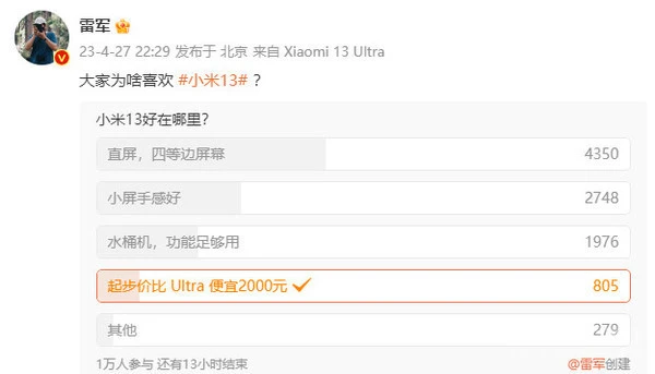 【手机中国消息】迩来,关于“小屏手机”的话题又在微博上火了起来,因由是雷军与网友讨论小米13时暗示后续大概不会再出小屏手机。据手机中国相识,克日雷军又在微博上发起了一则投票,扣问各人为什么喜好小米13。停止发稿前有1万人到场到投票当中,让人不测的是,和“代价自制”有关的选项居然排名垫底,而“直屏”好像成为了各人购买小米13的重要因素。 小米13 详细来看,雷军发起的“小米13幸亏那边”的投票,一共有“直屏,四等边屏幕”“小屏手感好”“水桶机,功能富足用”“起步价比Ultra自制2000元”等几个选项。在1万名到场投票的网友当中,有高出4千人选择“直屏,四等边屏幕”,另有2千多人选择“小屏手感好”,而投给“起步价比Ultra自制2000元”这个选项的只有800人左右。团体来看,网友们对小米13的屏幕计划可谓相当满足,重要在于其是“直屏”,且屏幕尺寸不大。 雷军微博投票 在这条微博下,热评第一条写到,都说由于手感好、屏幕小才买小米13,实在最重要的还是水桶机,各方面都富足,代价还符合。然后碰上了小屏和直屏,以是才气大卖。有网友复兴称:确实,小米13够水桶机,虽说不是都顶级,但是该有的都有,比如IP68、无线充、OIS和小尺寸,别的尺度版机型要么没这个要么没谁人。另有网友推测:隐隐以为是小米内部在做什么庞大决定,下一代会不会出小尺寸,就看各位网友了。 |