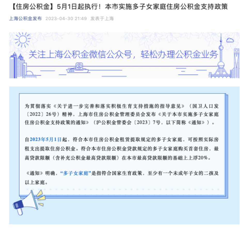 中国基金报记者文景 5月1日,上海正式实验多后代家庭住房公积金支持政策。此中明白,多后代家庭在上海市购首套房,最高贷款限额上浮20%,即家庭最高贷款限额可达144万元。 记者注意到,除了上海,近期,已有深圳、合肥等多地从公积金贷款政策对多后代家庭购房给予支持,低沉其购房压力。 上海实验多后代家庭住房公积金支持政策:家庭最高可贷144万元 昨日晚间,上海市住房公积金管理委员会发布《关于本市实验多后代家庭住房公积金支持政策的关照》(沪公积金管委会〔2023〕7号,以下简称《关照》)。 按照《关照》,自2023年5月1日起,符合本市住房公积金租赁提取规定的多后代家庭,可按照现实房租付出提取住房公积金。 符合本市住房公积金贷款规定的多后代家庭购买首套住房,最高贷款限额(含增补公积金最高贷款限额)在本市最高贷款限额的根本上上浮20%。 根据新政利用细则,多后代家庭的职工(以下简称乞贷申请人)申请贷款时至少有一个后代为未成年人。个人最高贷款限额为60万元,缴交增补住房公积金的,最高贷款限额在上述限额根本上增长12万元;家庭最高贷款限额为120万元,缴交增补住房公积金的,最高贷款限额在上述限额根本上增长24万元。 别的,新政还提出,符合上海市租赁提取规定的多后代家庭,可按照现实房租付出提取住房公积金。 根据新政利用细则,申请人需符合的条件包罗: 申请人在上海市一连足额缴存住房公积金满3个月;申请人及夫妇在上海市无自有住房且租赁市场租赁住房,大概按照上海市干系政策规定租赁经当局主管部分认定并纳入同一管理的公共租赁住房、保障性租赁住房,并按规定办好租赁存案; 申请人及夫妇在上海市无住房公积金贷款、无委托提取住房公积金归还住房贷款等收效中提取业务; 至少一名未成年后代与申请人或夫妇在本市共同居住半年以上(含半年);申请人及夫妇仅可提取住房公积金付出一套房屋的租赁费用。 对于提取额度,新政规定,租赁公共租赁住房、保障性租赁住房的,现实租金以网签存案条约登记租金为准;租赁市场租赁住房的,现实租金以网签存案条约以及缴纳租金的税控发票登记的租金为准。 多地调解公积金贷款政策,更多惠及多后代家庭 记者注意到,上述新政是基于贯彻落实《关于进一步完满和落实积极生养支持步伐的引导意见》(国卫生齿发〔2022〕26号)精神而提出。 2022年7月25日,发展改革委、中心宣传部、住房城乡创建部等团结发布《关于进一步完满和落实积极生养支持步伐的引导意见》,要求深入实验一对夫妻可以生养三个后代政策及配套支持步伐,完满和落实财政、税收、保险、教导、住房、就业等积极生养支持步伐,积极营造婚育友好社会氛围,促进生齿长期平衡发展提供有力支持。 此中在 第五大条“强化住房、税收等支持步伐”中提到:精准实验购房租房倾斜政策。住房政策向多后代家庭倾斜,在缴存都会无自有住房且租赁住房的多后代家庭,可按照现实房租付出提取住房公积金;对购买首套自住住房的多后代家庭,有条件的都会可给予得当进步住房公积金贷款额度等干系支持政策等。 再追溯到2021年6月26日, 中共中心、国务院曾发布《关于优化生养政策促进生齿长期平衡发展的决定》,此中表现,“当前,进一步顺应生齿形势新变革和推动高质量发展新要求,实验三孩生养政策及配套支持步伐,具有巨大意义。”并提出了到2025年和2035年促进生齿长期平衡发展的目标。在这个《决定》的第十九条“增强税收、住房等支持政策”中提到“地方当局可以研究订定根据养育未成年后代负担情况实验差别化租赁和购买房屋的优惠政策。” 除了上海,近期,已有多地从公积金贷款政策对多后代家庭购房给予支持,低沉其购房压力。 4月24日,潮州提出多后代家庭住房公积金支持政策。购买首套自住住房申请住房公积金个人住房贷款的,二孩家庭贷款最高限额进步10%,三孩家庭贷款最高限额进步20%;租房提取最高额度进步20%。即以家庭为单位,每户每年提取最高限额不凌驾11520元。 4月下旬,江西新余发布“调解住房公积金缴存利用政策的关照”,对多孩家庭租房给予更大支持力度。对于多后代家庭无房租赁住房提取公积金的,年提取限额按现行规定额度尺度上浮50%,即租房年提取额度从1.2万元进步至1.8万元。 合肥也出台公积金新政,规定多后代家庭购买首套自住住房且初次申请住房贷款的,单方正常缴存最高可贷款额度进步至65万元,夫妻双方正常缴存最高可贷款额度进步至75万元。多后代家庭无房租赁住房提取住房公积金的,提取限额按现行规定额度尺度上浮50%确定。 3月下旬,深圳市明白,对于生养二孩及以上的多后代家庭(至少一个后代未成年)利用公积金贷款购买首套住房的,其公积金贷款最高额度可以上浮30%;生养二孩及以上的多后代家庭利用公积金贷款购买首套住房,且所购住房为绿色修建评价尺度二星级及以上的绿色修建的,其公积金贷款最高额度可以上浮40%。 贵州贵阳提出,5月1日起,多后代家庭为单缴存职工的,购买住房最高贷款额度为60万元;多后代家庭为双缴存职工的,购买首套住房最高贷款额度为80万元,购买二套住房最高贷款额度为70万元。 在江西九江,生养二孩的家庭购买首套自住住房申请住房公积金贷款,贷款最高限额在九江市住房公积金贷款最高限额根本上上浮10%;