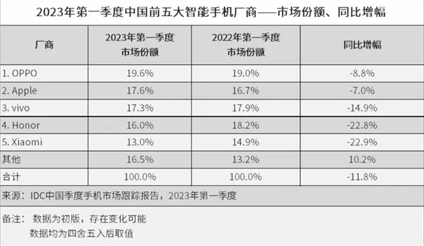 快科技4月29日讯,华为之后,OPPO成了中国手机的“新老大”。 IDC发布的手机季度跟踪陈诉表现,2023年第一季度,中国智能手机市场出货量约6,544万台,同比降落11.8%。 OPPO时隔一年以19.6%的市场份额再次回到国内手机市场第一的位置。双旗舰高端战略初显成效,Find N2&Flip系列登顶Q1折叠市场份额第一,为OPPO的高端突破战略打下结实根本。 刚发布的Find X6系列的市场欢迎度高于预期,使得OPPO在600美元以上高端市场份额显着提升,跻身TOP3。子品牌Oneplus市场表现强势,同比增幅高出300%,资助OPPO在线上渠道的竞争力不停增强。 苹果在第一季度位居国内市场出货量第二,市场份额17.6%。1月供应完全规复正常以后,苹果第一次在新品发布后不到半年举行调价,在2月对市场需求较大的iPhone 14 Pro&Max举行渠道代价下调,得到了不错的市场反馈,贩卖情况显着提升。但是iPhone 14 &Plus在发布新表面颜色以后仍未有显着转机。 值得一提的是,OPPO的折叠屏也第一次成为该市场份额第一,达35.0%。此中Find N2 Flip占据近 22%的市场占据率,成为当季爆款机型。 华为处于新老产物瓜代期,排名仍位居第二位,市场份额达24.9%。 |