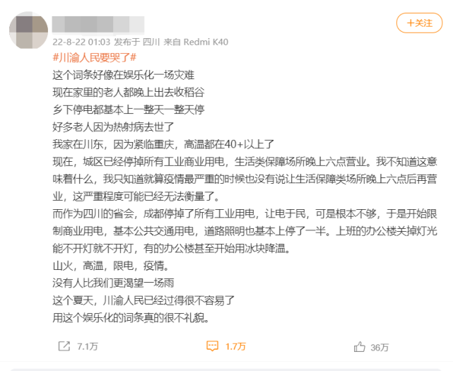 文 / 巴九灵(微信公众号:吴晓波频道) 这几日,险些每天都有与川渝高温干系的热搜。 昨天冲上热搜的,是#川渝人民要哭了##川渝地区好像有高温结界#等词条。 网上冲浪多年,用戏谑化的笔墨来形容社会大事已不是什么奇怪事。 只是这一次,网友们并不买账。 肝火伸张在字里行间——“不要再娱乐化川渝地区了!” 不寻常的肝火事出有因。 01 他们亲历的电荒 迩来,川渝地区遭遇了60年一遇的极度高温天气。自8月12日起,中央景象台已连续10天发布高温预警,而最高气温达40℃以上的,都有川渝地区的身影。 成都当地市民吕洋告诉小巴:“往年这个时间,空调属于开不开都行,但本年不开会死。” 四川日报报道,当前,全省用电需求最高负荷已跃升至6500万千瓦,同比增长25%。 此中全省住民用电需求在7月已经大幅增长,日均用电量达3.44亿千瓦时,同比增长了93.3%。 8月的数据尚不可查,但种种迹象表明,这只会是一个更惊人的数字。 为保障住民根本生存用电,8月14日,四川省公布于8月14日至20日,对部门高载能企业实行停产让电于民的调控,筹划让出用电负荷约700万千瓦。 然而,就在当天晚上,四川省再发告急关照,公布从8月15日0时起至20日24时,在全省(除攀枝花、凉山)的19个市(州)扩大工业企业让电于民实行范围,对四川电网有序用电方案中全部工业电力用户(含白名单重点保障企业)实行生产全停(保安负荷除外),放高温假。 好不容易盼到了20日,干系企业收到的关照却是,限电限期将延伸至25日,限电总时长延伸到11天。 不光云云,全省公共场合的照明灯、景观灯,以及阛阓的空调、电梯等也同样被纳入了限电范围之内。 作为一个风俗了夜生存、又好吃暖锅的成都人,周末出去的吕洋还不能顺应春熙路和太古里的暗中。出门更是困难,她表现现在成都人出门用饭都先要打电话问餐厅,不是问有没有座,而是问“开没开空调”。 成都关闭全部户外广告照明 而重庆已经将商业运营时间浓缩到了晚上。8月21日,一些重庆的阛阓为相应政府保障电力须要,临时将业务时间调解为16:00-21:00,做商业实体交易的更难了。 令人忧心的是,一些限电的办法好像已经陆连续续伸张到住民家里。 家住四川德阳的周雪是在8月21日周日上午发现本身家忽然停电的。 “感觉齐备都停摆了。” 起先连物业也不知道是什么环境,随后业主们收到关照,由于供电公司装备故障,周雪所在小区将停电24小时。 “之前只听说(用电)告急,没挨到身上。现在第一次感受到停电。” 谈及感情,周雪表现“各人都比力冷静,都知道告急”。周雪终极前去2公里之外的父母家,而其他业主则拖家带口去找附近没被停电波及的旅店。 四川达州的住民就没有这么荣幸了。 8月16日下战书,四川达州电力团体有限公司发布的《有序限电预告》称,假如在采取齐备步伐仍无法缓解供电压力的环境下,将对辖区内的住民用户实行有序限电,每条线路筹划连续时间约两个半小时。 而微博上有当地网友反映,停电的频次和时间远高于关照中的筹划时间,部门地区一天内停电3—4次,每次3—5个小时;也有的地方是供三小时停三小时。 农村地区的形势更严肃,达州大竹乡间在四十度高温下已经停电了十来天,一天停靠近十个小时。 2020年,天下都会地区用户匀称停电时间4.82小时/户,农村地区用户匀称停电时间14.51小时/户,四川省结果弱于天下水平,每户匀称停电时间为16.49小时/户,农村地区达19.57小时/户。 图源:《2020年天下电力可靠性年度陈诉》 但这数字放到本年,真的是小巫见大巫。 更令民气痛的是,多位网友在批评区提及家中老人,他们有的由于高温中暑,有的乃至不幸去世。 这也是前述网友们对用轻佻语气批评川渝感到愤怒的重要缘故起因。 02 “发电机、冰块,代价翻倍” 比住民更早感受到限电煎熬的,是工业企业。 与四川省发布的关照时间(8月14日)差异,位于成都新都区的某家居品牌工作职员表现,自8月1日起,工厂便接到关照,要求错峰生产。 为此,工厂只能在晚上12点到第二天早上8点的时间段举行生产。而从8月12日起,陪伴四川连日高温,连晚间生产都不被允许,要求工厂歇工放假至25日。 “我们工厂一线员工已经歇工20天了,现在还没开工。假如想继承生产,只能本身想办法发电,但发电机代价现在也翻了五六倍。” 该工作职员表现,现在工业发电机只能按月租用,且油耗、运输资本均需工厂自行负担。现在,企业大部门订单已克制生产,少量急单使用发电机发电的方式举行生产,每月发电机租用费用便达几十万,预估7月以来直接丧失达上万万。 由于连续歇工,工厂交货期预计将推迟一个月。固然现在并未出现客户因订单无法按时交付而退单的环境,但他们依然担心后续订单大概流失到广深、江浙等其他家居财产基地。 与此同时,该品牌板材、玻璃等原质料供应商大多位于川渝地区,财产链上游原质料的供应同样出现了困难,已有一家板材厂商发来了涨价关照。 这是该品牌创建19年以来第一次履历云云大规模的限电,固然工厂有备用发电机,但其功率乃至无法负担工厂一半的产能。 “太临时了,根原来不及和谐安排生产。”电话那头的工作职员轻轻叹了口气。 另一家由于高温而交易火爆的冰厂也遭遇了限电。 “一天到晚,电话都被打爆了,都是来买冰块的,关键是我们也拿不出货来了。”四川郫县某冰块贩卖点贩卖员王泉有些暴躁地