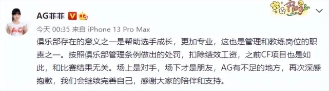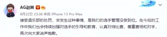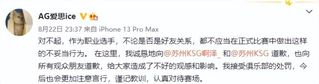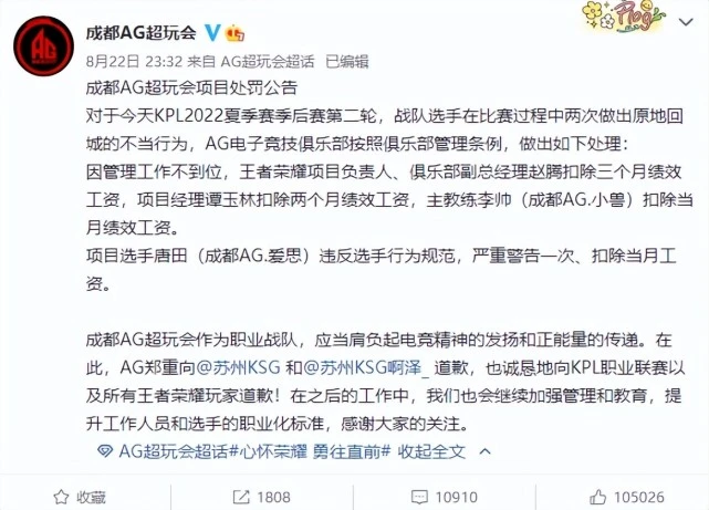 2022KPL夏季赛季后赛败者组第二轮角逐昨晚落下帷幕。成都AG超玩会以3:4的比分不敌苏州KSG遗憾止步,且无缘挑衅者杯。赛后成都AG超玩会对于战队选手成都AG.爱思在角逐过程中两次做出原地回城的不妥举动,按照俱乐部管理条例,做出严厉处罚处理处罚。 成都AG超玩会项目处罚公告: 对于本日KPL2022夏季赛季后赛第二轮,战队选手在角逐过程中两次做出原地回城的不妥举动,AG电子竞技俱乐部按照俱乐部管理条例,做出如下处理处罚: 因管理工作不到位,王者光彩项目负责人、俱乐部副总司理赵腾扣除三个月绩效工资,项目司理谭玉林扣除两个月绩效工资,主锻练李帅(成都AG.小兽)扣除当月绩效工资。 项目选手唐田(成都AG.爱思)违反选手举动规范,严厉告诫一次、扣除当月工资。 成都AG超玩会作为职业战队,应当负担起电竞精神的发扬和正能量的转达。在此,AG审慎向苏州KSG和苏州KSG啊泽致歉,也老实地向KPL职业联赛以及全部王者光彩玩家致歉!在之后的工作中,我们也会继续增强管理和教诲,提升工作职员和选手的职业化尺度,感谢各人的关注。 处罚通稿发出后,成都AG超玩会俱乐部CEO与当事人分别致歉,电子竞技从业者应该具备良好的体育精神,弘扬正能量。渴望成都AG超玩会在以后的角逐中可以或许体现出更高的竞技素养,再创佳绩。 |