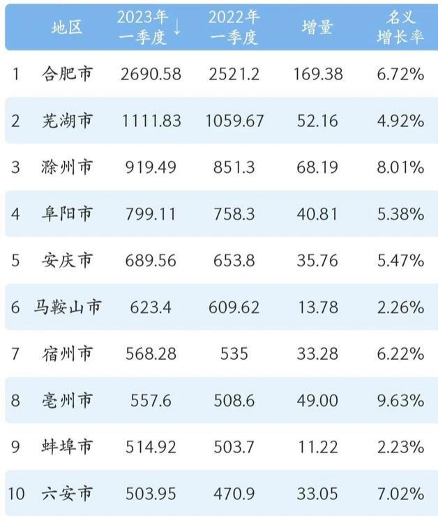 如今,安徽的GDP总量已经稳固在了天下省份十强! 说着实的,安徽这些年的发展真可谓是雷厉风行。在十三五时期,安徽的GDP总量以致还落后于直辖市上海。 如今,安徽的经济规模已经让上海望洋兴叹。固然对于一个省份而言,与直辖市去比各类总量指标,确实也是说不已往。 从安徽省统计局相识到,2023年第一季度,安徽全省的GDP总量为10936.2亿元,按稳固代价盘算,同比增长4.8%。 此中,安徽全省的第三产业增长值6185.5亿元,占到了全省经济总量的56.5%。 2023年第一季度,安徽十强都会最新出炉,依次为合肥市(2690.58亿元)、芜湖市(1111.83亿元)、滁州市(919.49亿元)、阜阳市(799.11亿元)、安庆市(689.56亿元)、马鞍山市(623.4亿元)、宿州市(568.28亿元)、亳州市(557.6亿元)、蚌埠市(514.92亿元)、六安市(503.95亿元)。 与客岁同期的数据相比,安徽十强都会的排名保持了完全划一,这也表现了全省发展的稳固性。 合肥继续保持高速增长,成为安徽全省发展的核心引擎! 别的,省会合肥占到了安徽全省24.6%的经济总量。相对而言,安徽的省会首位度在中西部地区并不算高。 公开资料表现,2023年第一季度,合肥全市的GDP总量为2690.58亿元,名义增速为6.72%。 十二五时期至今,合肥全市的新兴产业不绝发展强盛。从合肥市统计局获悉,客岁整年,合肥全市的战新产业产值占规上工业比重已经高达56%。 另据数据表现,合肥全市的新能源汽车、光伏电池产量占天下比例已经提升至3%、7%。 一季度,滁州不敷千亿! 在已往很长一段时间里,滁州的GDP根本无缘安徽四强。但在第四次经济普查之后,滁州的数据显着上调,经济规模也是强势跻身了安徽全省前三位。 这几年,滁州仍然保持着相对较快的增速。不外在2023年第一季度,滁州的GDP不敷千亿。 根据滁州市统计局的开端核算结果,2023年第一季度,滁州全市的GDP总量为919.5亿元,同比增长7.1%。 具体分产业来看,滁州全市的第一产业增长值为38.1亿元,第二产业增长值为463.4亿元,第三产业增长值为418.0亿元。 阜阳领先安庆,排在了安徽全省第四位! 在各类人均指标方面,阜阳由于巨大的生齿数据,确实不怎么良好。但在GDP总量方面,阜阳的力气还是值得承认的。 在第四次经济普查之后,阜阳的GDP总量同样有着上调,这也表现了阜阳内在的发展潜力与力气。 从阜阳市统计局相识到,2023年第一季度,阜阳全市的GDP总量为799.1亿元,同比增长5.1%。 分产业来看,阜阳全市的第一产业增长值58.6亿元,第二产业增长值292.3亿元,第三产业增长值448.2亿元。 同期,阜阳全市一季度的住民人均收入为7842元,同比增长5.6%。此中,阜阳的城镇住民人均收入为10843元,农村住民人均收入为5806元。 那么对于安徽十强都会的最新排名,各人有什么新的思索呢? |