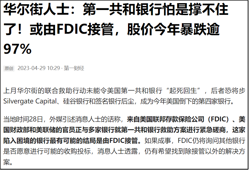 作者:星话明白 泉源:明白话局面 已得到转载授权 不停还试图自救的第一共和银行,终极还是没撑住。 就在5月1日下战书,加州金融掩护和创新部分公布关闭第一共和银行,并指定美国联邦存款保险公司(FDIC)为担当方。 这个就意味着第一共和银行正式倒闭。 同时,美国联邦存款保险公司(FDIC)也第一时间发表声明,已经与摩根大通签署一份购买和负担协议,摩根大通将负担第一共和银行全部存款和险些全部资产。 01 摩根大通浮出水面 梳理一卑鄙程: 第一共和银行先停业,被FDIC担当。 然后FDIC再把第一共和银行转手转卖给摩根大通。 之以是夸大这个流程,紧张是摩根大通如许收购的话,是已担当厥后收购。 如果是担当前收购,摩根大通就须要从第一共和银行的股东手里买下全部股权,再负担第一共和银行的全部资产和债务。 但现在变成担当后收购,就相当于是停业收购,基于债权优先于股权的原则,摩根大通就不须要付出给第一共和银行的股东任何钱。 摩根大通收购提出的报价,紧张就是用于偿付第一共和银行全部存款。 以是这个消息一出,已经差不多天天腰斩的第一共和银行,5月1日盘前再度暴跌一半。 上周五,第一共和银行跌到市值只剩下6.5亿美元了。 但纵然云云,摩根大通也不肯给第一共和银行的股东掏一分钱。 而是品级一共和银行被担当后,再顺理成章来低价收购。 而且,如许一来,FDIC还要与摩根大通共同负担收购第一共和银行所导致的亏损生意业务。 FDIC估计,这次第一共和银行倒闭被收购,存款保险基金要付出的资本约为130亿美元。 如果摩根大通没品级一共和银行倒闭,就直接以购买股份方式来收购,那便是不光要掏付给股东的数亿美元,还要付出130亿美元的额外亏损生意业务。 摩根大通这个算盘打得还是很精的。 着实不管之前硅谷银行停业,还是这次第一共和银行被担当,美国背后的处置惩罚逻辑就是,银行股东的钱可以任意亏。 这根本是把美国大量中小银行的股东,都拿出来开宰。 这也意味着,中小银行的股价广泛大跌,还将连续。 然后等到中小银行出现停业潮了,头部银行又可以用救市的名义,以白菜价来收购。 可谓是求名求利,但这都是创建在中小银行投资者血本无归的根本上。 在资源的天下里,就是这么的暴虐。 在本年2月份,第一共和银行股价另有147美元。 然后3月由于硅谷银行停业,第一共和银行也被连累,一起跌到15美元左右。 在上周一,第一共和银行股价另有16美元。 然后就开启一连腰斩之路。 周二跌50%,周三跌30%,周五跌43%,股价只剩下3.51。 然后5月1日估计又要跌一半,股价估计得“1”开头了。 第一共和银行这种跌法,摆明就是奔着停业去的。 着实在上周五晚上,就有美国媒体报道称,第一共和银行大概在5月1日公布被担当。 外媒这次所谓“消息人士”的报道,还挺准确,5月1日美国联邦存款保险公司就定时担当了第一共和银行。 在周末,美国媒体还报道,FDIC、财政部和美联储正在监视与银行和私募股权公司的讨论,以构造对第一共和银行的接济。 当时是FDIC仍旧还是实验克制第一共和银行被担当,以是找了几个美国大银行洽谈收购变乱。 据报道,FDIC曾约请摩根大通、美国银行、美国合众银行等美国头部银行来加入对第一共和银行的收购,但美国银行和美国合众银行终极决定不加入竞标。 于是,摩根大通就“脱颖而出”。 02 大鱼吃小鱼 摩根大通是美国第一大银行,拥有上百年汗青,是美国超等资源之一。 在1929年大荒凉之前,摩根财团在美国以致可以说是只手遮天,就连美联储都要受摩根财团很大影响。 但厥后1929年大荒凉发作后,罗斯福开始把矛头对准这些已经把持美国金融的超等财团。 于是,1933年,罗斯福推出《格拉斯—斯蒂格尔法案》,克制银行混业谋划,便是是阉割了银行资源。 银行混业谋划,就是指银行可以拿着储户的钱,直接去举行证券投资。 这在1929年之前,是美国银行业的常态,靠银行混业谋划,美国银行业可以用极高的杠杆获取惊人的利润。 但也因此给1929年金融危急埋下了祸根。 以是,罗斯福为了办理大荒凉,起首就是竣事银行混业谋划模式,规定一家银行要么从事存贷款的贸易银行业务,要么只从事证券生意业务的投资银行业务。 也就是把银行和投行分开,只能二选一。 摩根财团作为当时美国最大的银行,也被拆分: 摩根财团原来的贸易银行业务,就变成摩根大通,厥后被称为小摩。 而其他投行相干的业务,就变成摩根士丹利,厥后被称为大摩。 这次加入收购第一共和银行的就是被称为小摩的摩根大通。 摩根大通之以是对于收购第一共和银行这么积极,紧张也是由于摩根大通已经在第一共和银行身上越陷越深。 在本年3月,摩根大通就已经领头11家银行,向第一共和银行存入300亿美元,来试图资助第一共和银行渡过难关。 但这并没有什么用。 在挤兑危急发生后,投资者对第一共和银行的信心已经跌至冰点。 在3月份,第一共和银行流失存款千亿美元,存款少了一半。 克制4月13日,第一共和银行另有存款1039亿美元,总资产2291亿美元。 也就是第一共和银行现在另有的1039亿美元存款,此中有300亿美元是3月份摩根大通领头存的。 要是摩根大通不去收购第一共和银行,那这300亿美元大概就得打水漂了。 大多数人看到这里,大概以为摩根大通是必不得已来收购第一共和银行。 但这里,大概另有一个更深条理的逻辑。 摩