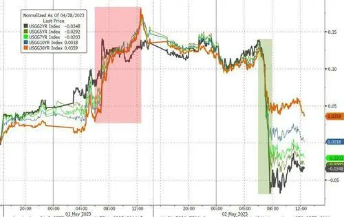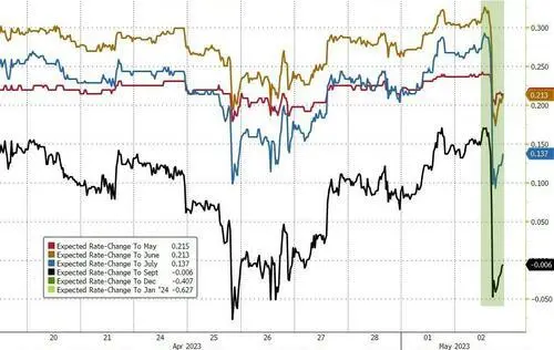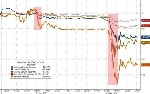 5月2日周二,美联储FOMC议息集会召开,市场押注周三公布继续加息25个基点的概率一度高达97%,投资者密切关注美联储会否开释6月起停息加息、以致是年底前启动降息的信号。 美国经济数据连续降温。3月JOLTS职位空缺959万人,降幅超预期且创近两年最低,体现就业市场进一步降温,大概有助于减轻通胀压力。3月耐用品订单环比终值3.2%持平初值,但与工厂订单一样均靠运输类产物提振,扣除飞机的非国防资源耐用品订单环比终值-0.6%,弱于预期的-0.4%。焦点工厂订单自2020年12月来初次出现年度萎缩,名义订单环比增0.9%不如预期。 美国财长耶伦告诫称,税收收入不佳,美国财政部或在6月1日之后无法推行偿债任务,早于政府机构和华尔街此前的预期。 对冲美债违约的保险代价走高,美国一年期光荣违约互换(CDS)以后前的169个基点扩大至171个基点,五年期光荣违约互换升破70个基点。6月到期的短期美债收益率升破5%。 美国一年期光荣违约互换再创新高 由于经济降暖和债务上限恐慌逼近,生意业务员放弃了对美联储将一连两次加息的预期,不再预期6月加息,一天前还以为6月加息25个基点的概率靠近30%,对年底前降息押注也重新升温。 生意业务员放弃了对美联储将一连两次加息的预期,不再预期6月加息 欧元区4月团体通胀加快上行至同比增7%,但焦点通胀率不测放缓至同比初值5.6%,是客岁6月以来初次降落,欧元区和最大经济体德国、法国、意大利的4月制造业PMI均深陷萎缩,对欧洲央行周四加息步调放缓至25个基点的市场预期升温。 澳洲联储不测加息25个基点,称通胀率“仍旧过高”,不扫除进一步加息大概,市场原来预计5月集会暂不加息。澳元兑美元涨超1%至一周半最高,10年期澳债收益率从日低反弹16个基点。 美股团体收跌超1%,小盘股跌超2%,科技和AI概念股齐跌,美国地区银行股重挫美联储加息预期当前、经济数据降温、债务上限恐慌,以及银行业危急的幽灵仍存,均压低市场风险偏好。周二美股低开后大幅低走,开盘一小时便全线跌超1%,罗素小盘股跌超2%领跌。 道指最深跌超610点或跌1.8%,失守3.4万点整数位,标普500指数最深跌1.9%,一度失守4100点,能源和金融板块体现最差,纳指最深跌近200点或跌1.6%,纳指100跌1.4%。 尾盘时美股跌幅小幅收窄,仍团体收跌超1%且均连跌两日,标普、道指、纳指和纳指100均抹去上周四以来全部涨幅,罗素小盘股跌至3月23日以来的近六周低位: 标普500指数收跌48.29点,跌幅1.16%,报4119.58点。道指收跌367.17点,跌幅1.08%,报33684.53点。纳指收跌132.09点,跌幅1.08%,报12080.51点。纳指100跌0.9%,罗素2000指数跌2.1%。 道指盘中跌超610点,标普大盘最深跌1.9%,小盘股跌超2% 美股行业ETF近乎全线收跌,银行干系基金重挫,仅可选斲丧ETF微涨0.10%。地区银行ETF重挫6.32%再度体现垫底,银行业ETF跌5.19%,能源业ETF跌4.30%,金融业ETF跌2.30%,网络股指数ETF跌1.97%,生物科技指数跌1.32%,公用古迹ETF跌1.22%。 明星科技股普跌,仅亚马逊涨1.6%离开近三周最低。“元宇宙”Meta跌1.6%,止步四日连涨、失守客岁1月末以来最高。苹果跌0.6%,仍离逾八个月新高不远。微软尾盘转跌,仍离13个月高位不远。奈飞跌2%至近六周最低,谷歌A跌近2%,特斯拉跌近1%。 芯片股多数下跌。费城半导体指数跌0.7%,失守3000点,止步四日连涨并失守一周半新高。英伟达跌超2%,止步四日连涨、失守客岁1月来最高,英特尔跌近2%,但AMD跌1.8%后转涨,连涨五日至一周半高位,财报利好的恩智浦半导体涨超3%至近两周最高。 AI概念股齐跌。C3.ai跌超7%,革新三个月低位,已往一个月跌超49%。SoundHound.ai跌超7%至近一周新低。BigBear.ai跌近12%,失守近两周高位。 消息面上,特斯拉在美国、中国、加拿大和日本上调包罗Model 3和Y在内的车型代价,美国根本款“布衣神车”Model 3起售价重上4万美元。韩国三星临时克制员工使用类似ChatGPT的天生式人工智能谈天工具。“人工智能教父”Geoffrey Hinton离职谷歌,告诫人工智能风险。 热门中概追跌美股大盘。中概ETF KWEB跌3.5%,CQQQ跌2.8%,纳斯达克金龙中国指数(HXC)跌3.6%,下逼五个月低位。纳斯达克100四只成份股中,京东跌3.6%,网易转涨,拼多多跌超6%,百度跌3%。其他个股中,阿里巴巴跌超3%,B站跌超7%,腾讯ADR跌近2%,“造车三傻”齐跌且蔚来汽车跌4.6%领跌,小鹏汽车跌1.6%跌幅最小,4月共交付7079辆智能电动车。 银行股重挫。行业基准费城证交所KBW银行指数(BKX)跌4.5%,创2020年10月来最低;KBW纳斯达克地区银行指数(KRX)跌5.5%,SPDR标普地区银行ETF(KRE)跌超6%,均创2020年11月以来最低。 多只地区银行股暴跌,盘中多次熔断,其债券代价也大跌 大型银行中,摩根大通跌1.6%,美国银行跌3%,富国银行跌近4%,将裁人3000人的摩根士丹利跌近2%。多只地区银行股暴跌熔断,西平静洋合众银行(PacWest Bancorp)一度跌42%至汗青新低,收跌近28%,连跌四日至2009年3月来最低;阿莱恩斯西部银行(Western Alliance Bancorp)最深跌超27%创3月13日以来最大跌幅,收跌超15%至三周最低。消息面上,纽约证交所将启动第一共和银行退市步伐。 其他变动较大的个股包罗: 共享出行龙头优步涨超11%,连涨五日至三个月最高,一季度营收同比增29%超预期,亏损大幅收窄,称已经在应用AI技能改善用户体验、推测到达时间和简化雇佣司机的登记文件流程。 提供家庭作业辅导的美国在线教诲公司Chegg跌超48%,创2021年11月来最大跌幅和六年新低,一季度财报超预期,但告诫ChatGPT将陵犯新用