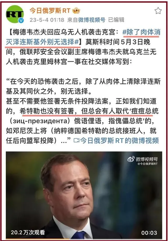 克宫遇袭之后,人们想到的第一个题目是:谁干的? 如今,莫斯科叱责谴责乌克兰,乌克兰否认与此有关。大概两方的说法都不可信。 起首,打击克里姆林宫的无人机残骸已经落在俄罗斯人手里,只要观察无人机使用的电子零部件及储存信息,就能大抵判定无人机来自那里、是否与乌克兰有关。 也就是说,使用无人机打击克里姆林宫,如果是乌克兰人干的,就有证据落在俄罗斯人手里的风险,就有因此遭到俄罗斯人大规模反攻的风险,这在如今阶段是得不偿失的。 进一步推演可知,如果莫斯科没有公布无人机残骸的观察细节,那就是俄罗斯本身人干的。 如果让我如今判定,我更倾向于信赖乌克兰总统泽连斯基的话,即否认与此事有关:没有攻击莫斯科,也没有本领攻击莫斯科。 别的,莫斯科对这件事反应,着实太离谱。尤其是普京的铁杆副手。 仅凭这一条--梅德韦杰夫回应克宫遇袭称#除了肉体清除泽连斯基外别无选择#,就给了国际媒体口实:如今,真正的纳粹、真正的战犯,就在莫斯科,就在克里姆林宫。 梅大嘴还在回应中提到了希特勒,将乌克兰总统比作希特勒,但,岂非克宫遇袭不是二战期间“希特勒遭本身人暗杀”变乱的开始和重演吗? 当年,连续战役中的德国人终于明确了一件事:没有希特勒,就没有战役;没有希特勒,就没有纳粹! 如今俄罗斯人也知道了。 克宫遇袭这件事,只与一件事有关,即连续的战役已经让俄罗斯和乌克兰两国人民遭遇巨大的痛楚、付出巨大的代价,没有人渴望这场战役继承下去,而要制止战役,如今环境下,只有一个办法--让普京消散。 这就是答案。 |