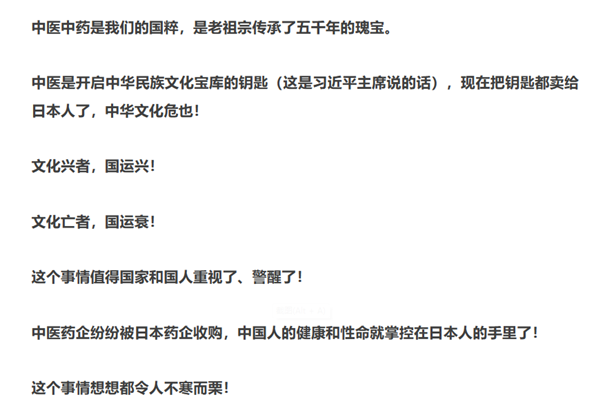 作者 | 鱼丸君 4月24日,日本汉方药企业津村公布,通过团体旗下中国企业把策划中药等的陕西紫光辰济药业纳为全资子公司,收购额为49亿日元,约合2.5亿元人民币,预计在4月尾之前走完收购流程。 消息一出,很多支持中医的网民立马就炸了锅,痛心疾首的就似乎天都要塌了似的,直呼悲剧,哀叹老祖宗留下的“文化瑰宝”又被日本人给啃走了一块,祖坟都被人家刨了,而国人本身却不懂得爱惜! 乃至另有人在文章中如是疾呼——中医中药是我们的国粹,是老祖宗传承了五千年的瑰宝,现在把钥匙都卖给日本人了,中华文化危也!中医药企纷纷被日本药企收购,中国人的康健和性命就掌控在日本人的手里了! (截图源自网络) 瞧瞧,这都直接上升到中华文化危亡、国运兴衰的高度了…… 可题目是,作为日本最大的汉方药企,作为日本汉方药行业的代表,津村药业真的有那么可骇么?它不外就是收购了一家中国的药企而已,真的就能影响到中华文化的危亡、威胁到中华国运的兴衰么? 大概,还可以如许问:以上的题目,是不是本身就太浮夸了? 照旧用数据语言吧! 根据国家统计局于2023年2月28日发布的公报,开端核算,2022年国内生产总值是1210207亿元。 (截图源自网络) 津村药业收购紫光辰济总额也就约莫2.5亿人民币,大概仅仅相称于2022年国内生产总值的0.0000020658%——看清楚,小数点背面五个零呢! 就这? 就这能影响中华文化的危亡? 就这能威胁中华的国运兴衰? 这是太瞧得起津村药业了,照旧太看不起中华的力气? 大概仅仅只是某些因此高声疾呼的人想太多了? 然后,再看看中国的中药市场到底有多大。 根据“前瞻产业研究院”网站于2021年12月7日发布的《行业深度!一文带你相识2021年中药行业市场规模、竞争格局及发展远景》一文,可以相识到到如下信息: 根据中国医药企业管理协会的数据表现,比年来中国中药业主业务务收入出现颠簸趋势。从2013年的6324亿元颠簸上升至6520亿元。2020年上半年,我国中药行业主业务务收入为2751亿元。 前瞻根据比年来中国中药行业主业务务收入情况,开端估计2020年中国中药行业主业务务收入约为5600亿元左右。 这个数据不肯定准确,“前瞻产业研究院”网站本身在文中如许备注:中药市场规模=中成药生产行业贩卖收入+中药饮片加工行业主业务务收入。别的,2020年纪据为前瞻根据行业当年及往年情况举行的测算值,以后续官方数据为准。 那看看津村药业本身是怎样对待、分析、及推测中国告急市场的吧! 在津村药业发布的《津村企业陈诉书2021》中,他们根据中国国家统计局以及工业和信息化部发布的数据,估算中国中药的市场规模为6520亿元(2019年),他们渴望能于2027年在中国市场告竣100亿元的贩卖收入。津村制药社长加藤照和曾野心勃勃地喊出一系列标语,“力图在中国市场上成为最闻名的中药品牌”、“2027年在中国的业务收入到达人民币100亿元”。 (截图来自《津村企业陈诉书2021》) 100亿元! 加藤照真是好大个野心勃勃! 假设中国告急市场规模从2020年开始就不再增长,不绝保持2019年总量6520亿的程度。 再假设津村想要实现的100亿元的贩卖收入预期可以或许美满告竣。 那么题目就来了——在以上两条假设都建立的条件下,津村药业可以或许在中国中药市场占据多大的市场份额呢? 实在就是小门生都会算的,最简单的算术题而已:100÷6520≈0.01534 再四舍五入算下来,加上个百分号,结果便是惊人的:1.5% 这就是津村药业想要告竣的目的! 这真的是日本人的——妥妥的——想要夺走国粹中医药,想要夺走老祖宗传承了五千年的瑰宝的——狼!子!野!心!呐! 但这野心……是不是似乎……确实太小了点儿呢? 再看津村药业现在已经完成了多少在华贩卖目的吧。 在《津村企业陈诉书2021》中,津村公布了他们2020年的在华贩卖收入,一共63亿日元——看清楚,是日元,而不是人民币。 (截图来自《津村企业陈诉书2021》) 按照现在的汇率,63亿日元大概也就相称于3.202亿人民币…… 再做一道小门生都会算的,最简单的算术题:3.202÷100=0.0302 再四舍五入算下来,加上个百分号,结果便是很拉胯的:3.202% 这就是津村药业已经完成的使命,间隔他们本身想要实现的目的还差了96.798% 现在间隔2027年还只有不到4年的时间了,严峻猜疑津村药业是否能完得成他们本身订立的目的? 呵呵哒,津村君!还早得很呐!任重道远哦! 以是津村药业到底凭什么能影响到中华文化的危亡,乃至是威胁到中华国运的兴衰呢? 凭某些家伙们杞人忧天的心态和胡吹乱侃嘴?照旧凭他们不须要动头脑任意敲击的键盘? 只想对那些家伙们说一句:醒醒吧,大概干脆洗洗睡了算了…… 不知道能不能真的劝醒大概劝睡那些杞人忧天的家伙们。 接下来实在另有一个题目须要理清楚——近几年,总是有各种人,各种报道在说什么“日本汉方药占据环球90%的市场,中国仅占2%”,隔段时间就冷饭重炒,接着便是各种扼腕叹息痛心疾首无地自容,说什么中医瑰宝都被日本给夺走了,中国人本身不懂爱惜,传承要断绝了什么的。 那么,毕竟原形到底怎样呢? 津村药业是日本汉方药的代表,日本市场占据率高达80%以上,那么日本汉方药市场到底有多大呢?津村药业的力气又到底有多强呢? 照旧直接拿数据语言吧! 全部数据都是很轻易就能查找到的: 1,日本每年从中国入口中药材约2.5亿美元,提取物约2.5亿美元,合计5亿美元,日本80%的中