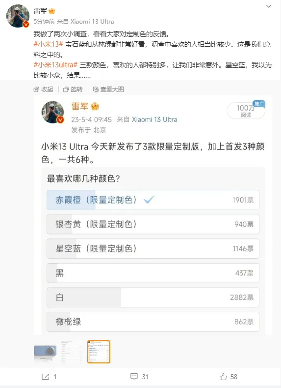 快科技5月5日消息,日前,小米13 Ultra推出三款全新限量定制配色,分别为星空蓝、赤下拗垄银杏黄,限量定制配色版本为16GB+512GB,售价6499元,与平凡版代价同等,将于5月6日发售。 本日,小米CEO雷军发布小米13 Ultra配色观察,雷军体现,“三款颜色,喜好的人都特殊多,让我们非常不测。星空蓝,我以为比力小众,效果……”。 从投票来看,三款配色中,赤霞橙得到了1901票,星空蓝1146票、银杏黄940票,不外,假如按全部投票,白色小米13 Ultra是最受各人喜好的,票数为2882票。 作为小米迄今最强的影像旗舰,小米13 Ultra不光是史上焦段最全的小米手机,照旧首款一英寸可变光圈的小米手机。 实现了12mm-240mm的六焦段覆盖,此中,23mm主摄尺度广角接纳一英寸的IMX989 传感器,别的三枚镜头均接纳1/2.5英寸的IMX858,物理光圈布局带来了f/1.9和f/4.0两档光圈切换。 团体规格上,小米13 Ultra搭载高通第二代骁龙8,正面是华星光电2K OLED屏,最新C7发光质料,内置5000mAh电池,支持90W快充和50W无线充电。 |