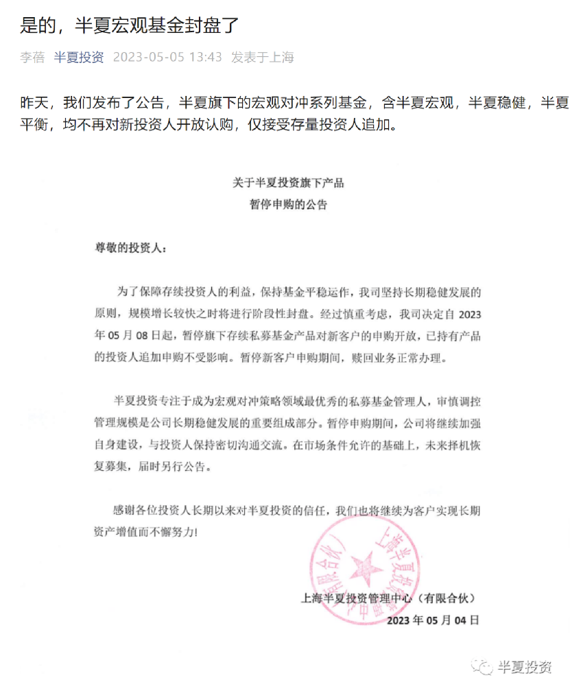 中国基金报记者 吴君 由李蓓掌舵的百亿私募半夏投资,5月公布“封盘”的消息,引发业内关注。 昨天半夏投资在官网发公告,决定从5月8日起,停息旗下存续私募产物对新客户的申购开放,已持有产物的投资人追加申购不受影响。半夏投资表现,公司对峙恒久妥当发展的原则,规模增长较快之时将举行阶段性封盘。将来将在市场条件答应的根本上,择机规复召募。 本日下战书半夏投资掌门人李蓓在官微发文讲到了“封盘”的缘故起因,她表现,如今半夏宏观对冲系列的规模已高出100亿,假如规模再扩大较多,多少他们经常使用的工具,就谋面对买卖业务所的持仓限定,对战略的实现和恒久收益率水平会产生肯定影响。“我们盼望维持不绝以来的风险收益特性,维持与股市的低相干性,积极实现恒久较高的绝对收益。跟第一梯队的规模和滑落到二流的业绩相比,我们宁愿选择维持第二梯队的规模并夺取维持一流的业绩。” 对于市场,前不久李蓓在一次访谈中提到,从长周期看,更倾向于震荡慢牛。如今市场进入小平台,恒久牛市还在,但不是“V型大反转”,而是震荡重心上移。同时李蓓比力看好地产股,她以为这是十年一遇级别的机遇,将来有一批公司相对当前的股价存在3-10倍的上涨空间。 半夏投资公布“封盘” 李蓓:克制投资工具的持仓限定 5月4日,百亿私募半夏投资在官方网站发布了《关于半夏投资旗下产物停息申购的公告》。 半夏投资表现,为保障存续投资人的长处,保持基金安稳运作,公司对峙恒久妥当发展的原则,规模增长较快之时将举行阶段性封盘。“颠末慎重思量,我司决定自2023年5月8日起,停息旗下存续私募基金产物对新客户的申购开放,已持有产物的投资人追加申购不受影响。停息新客户申购期间,赎回业务正常办理。” 同时,半夏投资还称,公司专注于成为宏观对冲战略范畴最精良的私募基金管理人,审慎调控管理规模是公司恒久妥当发展的紧张构成部门。停息申购期间,公司将继续增强自身创建,与投资人保持密切沟通交换。“将在市场条件答应的根本上,将来择机规复召募,届时另行公告。” 基金君就“封盘”的情况和缘故起因接洽了半夏投资,公司表现“请以公告内容为准”。 5月5日下战书,半夏投资掌门人李蓓也在官方微信发文表明确“封盘”的缘故起因。 李蓓表现,此次“封盘”的产物包罗半夏旗下的宏观对冲系列基金,含半夏宏观,半夏妥当,半夏均衡,均不再对新投资人开放认购,仅继承存量投资人追加。 关于“封盘”的缘故起因,李蓓表明,作为以绝对收益为目的的宏观对冲基金,不绝都盼望实现与股市不相干的恒久绝对回报。以是,一方面必要经常使用一些权益类衍生工具,比准期权等,对于个股持仓举行掩护,规避大盘下跌的风险。另一方面必要在其他的资产种别,好比国债和商品上,探求机遇创造收益。“如今半夏宏观对冲系列的规模已经高出了100亿,假如规模再扩大较多,多少我们经常使用的工具,就谋面对买卖业务所的持仓限定,对战略的实现和恒久收益率水平就会产生肯定的影响。” “我们盼望维持不绝以来的风险收益特性,维持与股市的低相干性,积极实现恒久较高的绝对收益。跟第一梯队的规模和滑落到二流的业绩相比,我们宁愿选择维持第二梯队的规模并夺取维持一流的业绩。”李蓓说。 五年时间提升百亿私募 公开资料表现,上海半夏投资管理中心(有限合资)创建于2015年8月,并在2017年11月在基金业协会登记成私募证券投资基金管理人,公司的紧张股东、现实控制人是李蓓,现在公司拥有19名全职员工。 2017年12月半夏投资发行并存案了首批宏观对冲战略的私募基金产物,到2022年年中,不到五年时间公司管理规模突破百亿元,提升百亿私募阵营,李蓓也成为业内首位百亿私募女掌门。现在半夏投资旗下存案的私募基金高出60只,紧张是宏观对冲战略的产物。由于这几年在市场震荡情况下业绩表现不错,半夏投资受到渠道和投资者的关注。 据公司官网先容,李蓓本科结业于北京大学元培学院,研究生结业于北京大学光华管理学院,拥有10年基金管理行业工作履历。曾于交银施罗德基金管理有限公司继承专户投资司理,上海泓湖投资管理有限公司继承投资总监及基金司理。 关于半夏投资的宏观对冲战略,官网也先容,半夏投资基于内部自上而下对宏观经济和资产代价驱动因子的分析,判断各个大类资产代价在将来一段时期的趋势。从而引导基金在各个种别资产上的设置和买卖业务。对于单一资产内部的投资,依赖于研究团队对行业和品种根本面的分析。本基金投资过程中使用期货期权等各种衍生金融工具,使用对冲、套利等投资本领,投资方向上可以做多,可以做空,也可以套利。目的是实现不依赖于市场情况的绝对收益。 李蓓看好市场震荡“慢牛” 部门地产股存在3-10倍上涨空间 本年3月,半夏投资首创人李蓓在雪球出品的对话访谈栏目《方略》中谈到了她对市场的见解。 李蓓表现,客岁11月的文章里,她说(市场)是“龙战于野”,然后将来半年会进入“见龙在田”,如今就是小平台到了。“我当时以为将来有半年时间都是小平台,但是市场在两个月时间就到了,我就告诉各人,恒久牛市还是在的,但是不是‘V型大反转’,而是震荡重心上移。” “我的观点着实没有变,只是各人本身眼睛里看到的东西不一样了,各人在非常灰心的时