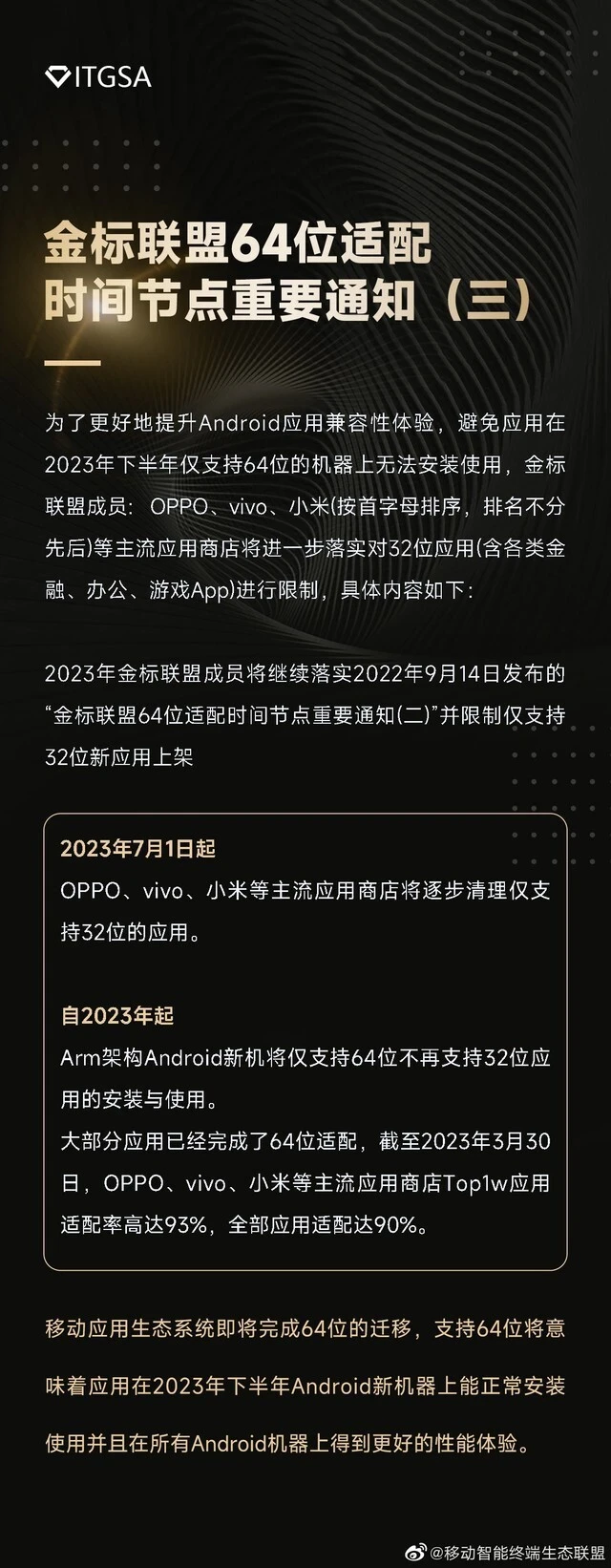 4月初,小米发布了《关于小米应用市肆上架应用完全适配64位的关照》,要求开发者自2023年5月8日起,不再答应仅32位的应用在小米应用市肆上架以及更新。 同时,在小米官方发布的《金标同盟64位适配时间节点告急关照(三)》中也有明确体现,2023年7月1日起,在OPPO、vivo、小米等主流应用市肆中,将渐渐整理仅支持32位的应用。 那么为啥不停在设置、代价、营销等方面打口水仗的手机厂商,在这件事上云云团结?本日我们就用一篇短文帮你搞懂用户为什么不再须要32位APP? 1 第三代骁龙8移动平台新机不支持32位应用 起首从《金标同盟64位适配时间节点告急关照(三)》另一段笔墨来看: 自2023年起,Arm架构Android新机将仅支持64位不再支持32位应用的安装与使用 联合此前爆料的信息体现,高通将在本年下半年发布的第三代骁龙8移动平台上,接纳2+2+3+1架构,核心设置分别为: 2个代号为“Hayes”(A5xx)的Arm“silver”核心; 2个代号为“Hunter”(A7xx)的Arm“titanium”核心; 3个代号为“Hunter”(A7xx)的Arm“gold”核心; 1个代号为“Hunter ELP”(Xn)的Arm“gold+”核心。 该芯片组由于缺少干系的CPU核心,将不支持32位的应用和游戏。 联合以上的爆料信息来看,本年年底发布的第三代骁龙8移动平台的新机,将取消之前支持32位应用的核心,这也就意味着32位应用将无法在搭载第三代骁龙8移动平台的新机上安装使用。 2 32位应用不停是甩不掉的标题 由于Android体系对于应用开发者的限定没那么严酷,以是尚有一部门软件仍在以32位应用提供服务,而为了照顾这一小部门的应用可以正常在手机上运行,手机芯片便须要有几颗专门处理处罚32位应用的核心。 以最新的旗舰处理处罚器骁龙8Gen2为例,此中的两颗A710大核、三颗A510小核就是用来支持32位应用的核心,这也就导致用户在使用32位应用时,会存在一些发热的标题。也正因此为了照顾32位应用的正常运行,导致我们岂论是使用64位应用还是32位应用,都无法发挥骁龙8Gen2的全部气力。 相较于32位来说,64位通常拥有着更快的运行速率、更低延时的数据吞吐以及更迅捷的用户相应,因此64位应用将是移动应用发展的肯定选择,同时符合了开发者与用户的切身长处。 实际上早在2015年,苹果便公布了iOS应用必须支持64位的消息,随后更是在iOS 11上正式砍掉了32位应用。得益于此,苹果后续的A系列芯片在计划之初便不消顾及32位应用,用户在使用过程中可以完全榨干芯片的全部性能,这在很大水平上也是iPhone的使用体验要好过Android手机的缘故因由之一。 写在末了 和App Store下架近20万款应用一样,扬弃32位应用势必将给用户和开发者带来短暂的阵痛期,尤其是Android端许多体量较小的开发者制作的小而美的软件,将无法在新手机上使用。但从久远来看,更流通稳固的体验、更低的功耗,遍及64位应用对开发者和用户都百利而无一害的功德。同时我们也有来由信赖,在年末的第三代骁龙8移动平台上,我们大概可以体验到此前Android手机没有过的畅爽。 (8172089) |