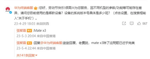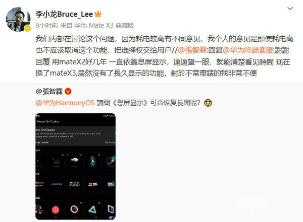 【手机中国消息】依附着精彩的使用体验,不少明星私下都在用华为旗下的数码产物,包罗手机、手表等。张智霖就是此中之一。以致,日前张智霖还发微博@华为HarmonyOS 官微,扣问华为Mate X3的“息屏表现”功能能否规复长开。可见私下张智霖真的是在将华为Mate X3当做主力机使用。 华为Mate X3 @华为HarmonyOS 官微很快注意到了张智霖这一哀求。官方复兴称,因差异机型的参数/功能等大概存在差异。感谢您的支持,歉仄我们临时没有核实到精确信息,请您连续关注华为官方消息。您的使用体验我们已如实记载,华为会不停积极,听取消耗者心声,不停优化产物筹划,做让消耗者喜好的品牌。 华为官方复兴 张智霖表现,自己的华为Mate X2用了好几年,不停很依赖“息屏表现”功能,远远看一眼就能看清晰时间,现在换了Mate X3,居然没有了长期表现的功能,对于不带表的我非常未便。同时,张智霖也表现,“Mate X3除了这题目已近乎美满”。 对于华为Mate X3息屏表现没有长开这一功能,华为终端BG CTO李小龙表现,“我们内部在讨论这个题目,由于耗电较高有差异意见,我个人的意见是纵然耗电高也不应该取消这个功能,把选择权交给用户。”根据李小龙的复兴我们不丢脸出,华为Mate X3取消息屏表现长开这一功能是由于耗电太高。 李小龙复兴 华为Mate X3于本年3月尾发布,,轻至239g,折叠机遇身厚度仅为11.08mm,睁开态薄至5.3mm,相比Mate X2厚度减薄一半以上,比一些旗舰直板机更浮滑。配备了一块6.4英寸的3D OLED外屏,以及一块7.85英寸的可折叠OLED柔性内屏,两款屏幕均支持120Hz高刷,同时手机支持IPX8级防水,售价12999元起,发布之后受到了不少消耗者追捧。 |