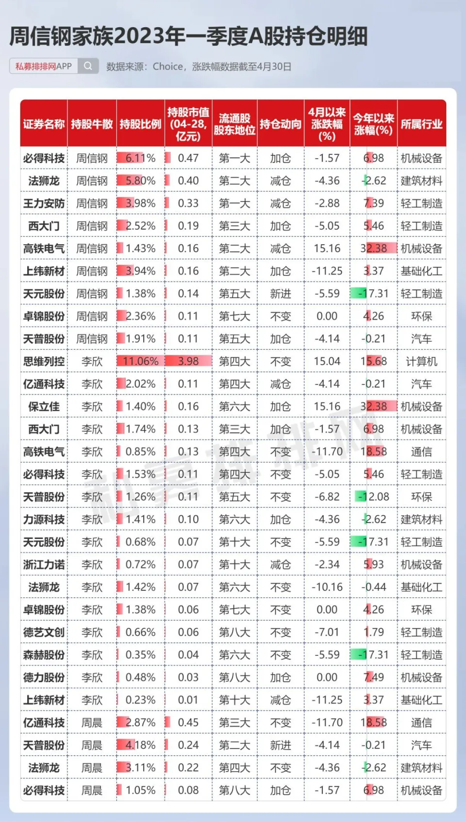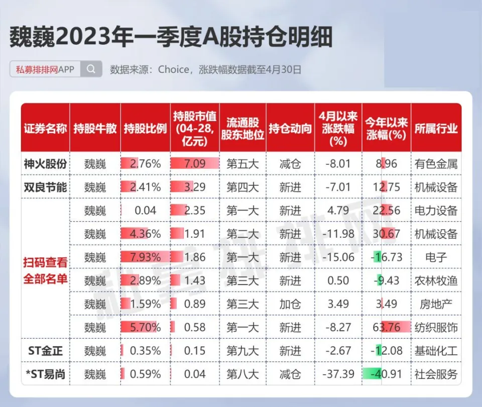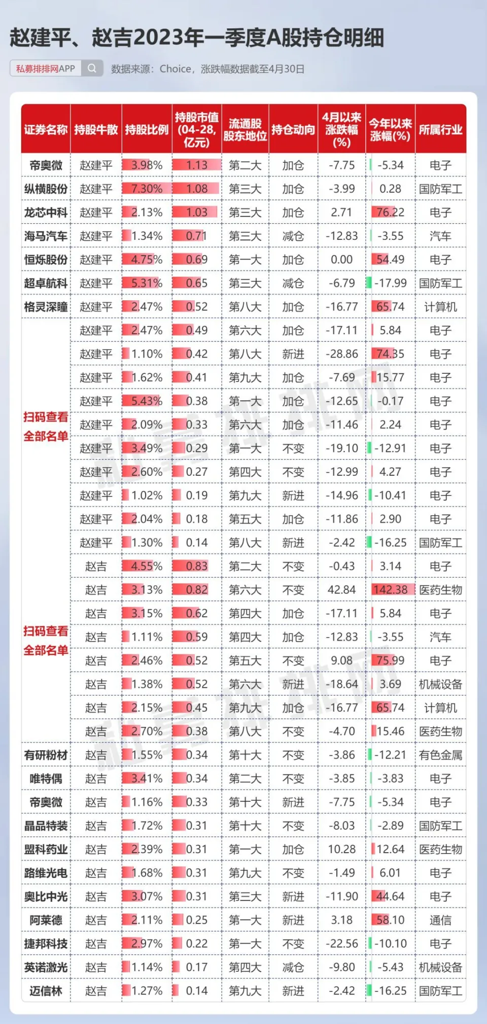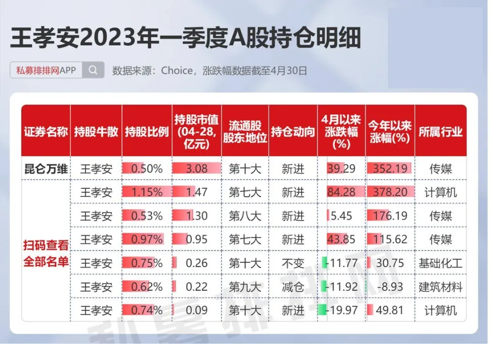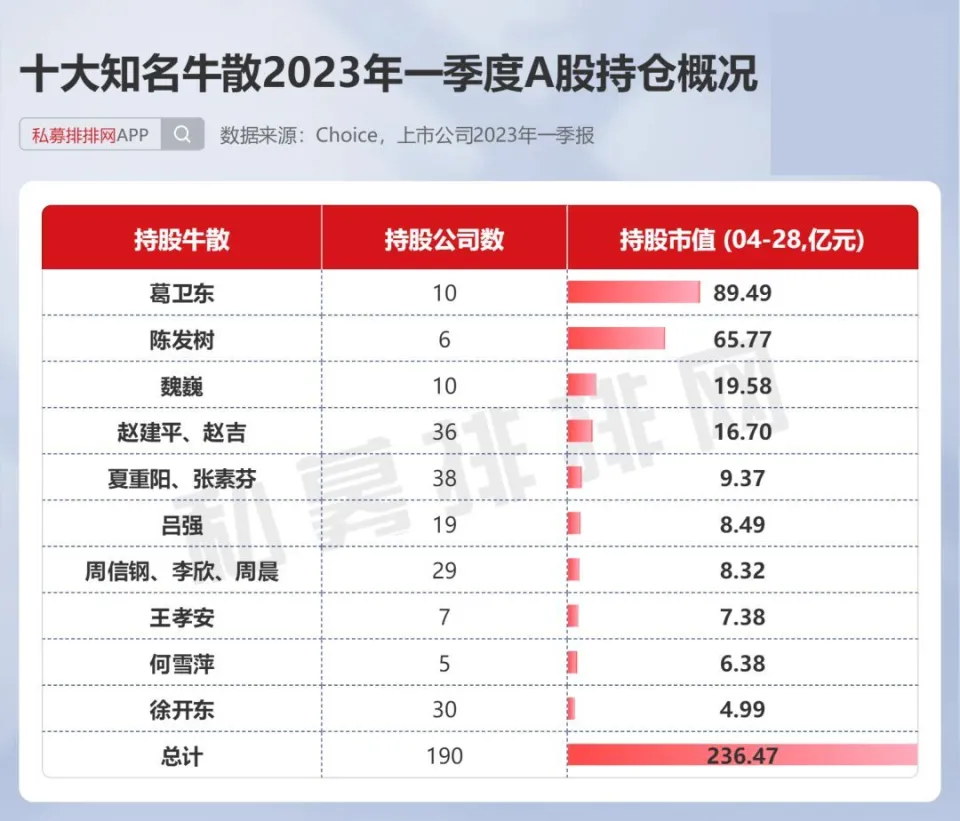“牛散”是个人投资者中的“佼佼者”,其通常持股市值较高,持股限期较长,不少是代价投资的范例,如在至暗时候抄底隆基绿能的陈发树,服从科大讯飞近6年的葛卫东,均是百亿级的“牛散”。在以个人投资者为主体的A股市场,“牛散”们的励志故事鼓励着无数投资者,不少“牛散”已活成了投资者的“偶像”。 “牛散”的投资风格各异,如百亿牛散葛卫东、王孝安、陈发树等喜欢重仓出击。魏巍偏幸传统行业。赵建平、赵吉父女偏幸电子行业。吕强,徐开东,夏重阳、张素芬夫妇等偏幸低价股和广撒网式布局。 十大“牛散”合计持股市值超230亿 制止4月尾,A股上市公司2023年一季报已落下帷幕。笔者根据A股上市公司2023年一季报,给各人梳理出了葛卫东、王孝安、陈发树、魏巍等中国十大着名“牛散”的最新持股信息,供各人参考。 此中,根据网络资料,夏重阳、张素芬为“夫妻档”,赵建平、赵吉为“父女档”,周晨、李欣、周信钢为一家人。(须要阐明的是牛散数据均根据股东名称梳理,或存在同名的情况,笔者无法佐证,仅根据牛散名字统计) 统计表现,十大“牛散”合计持有190家A股公司,位列此中15家公司的第一大流畅股东。新进53家公司,加仓40家公司,减仓30家公司,67家公司持股稳固。十大“牛散”持仓在4月28日的市值合计超230亿元。 此中,葛卫东、陈发树、魏巍、赵建平父女等4位牛散在一季度的A股持仓当前市值均超10亿元。葛卫东及其公司持有10家A股公司,持股市值超89亿元;陈发树持股6家,持仓市值超65亿元,两位“百亿级”的牛散均属于重仓押注型投资者。而赵建平、赵吉父女,夏重阳、张素芬夫妇,徐开东等牛散持股均超30只,属于分散式投资。 王孝安新进4只AI“翻倍”牛股,成AI板块大赢家 据网络资料,王孝安于1966年出生于温州。结业后其曾是一名士民西席,后辞职创业,2002年在杭州创建东海潮实业团体,重要从事证券期货投资、资源运营与公司股权投资。 证券方面,他曾乐成偷袭包钢稀土、运作广晟有色等股,使其名噪一时。期货方面,在2010年棉花上涨行情,大赚数亿元,坊间流传现在身家上百亿。 笔者根据一季报梳剃头现,王孝安在一季度持股7家公司,此中新买入5家公司,减仓1家公司,合计持股市值超7亿元。 值得注意的是,王孝安本年一季度新进买入的5只个股,均为AI概念股。此中,2家公司在本年以来股价涨幅超3倍,4家公司股价本年来翻倍。3股在4月28日当天喜提”20CM”,且4月份均有大涨的表现。王孝安无疑是牛散当中的“激进”派,也是AI板块的大赢家。 葛卫东重仓AI概念超70亿,浮盈近30亿 与王孝安一样,葛卫东也是期货界的传怪杰物,同时也是股票市场的投资大佬。葛卫东在《2023胡润环球富豪榜》,以180亿人民币财产位列榜单第1226位。 葛卫东,结业于四川大学经济系,现任上海混沌投资有限公司董事长。上海混沌投资是一家多元化的投资机构。投资范畴涵盖股票、商品期货、金融期货、股权投资、大宗商品贸易等。 笔者根据一季报梳剃头现,葛卫东及其公司在一季度持股10家公司,此中新买入1家公司,减仓2家公司,合计持股市值超89亿元。此中前3大重仓股均为AI概念股,合计持仓市值超70亿元。持有的AI个股本年来合计浮盈近30亿元。 葛卫东持股的特点总结来看,就是“偏幸”科技行业,喜欢重仓出击。葛卫东持有的6家公司均是当下最热门的TMT行业个股。与王孝安“追高”AI概念股差别的是,葛卫东对科技股的投资是早有布局! 好比,其第一大重仓股为一家芯片巨头公司,是在IPO之前就出场了,现在处于“限售”状态,葛卫东的混沌投资位列该股总股本的第九大股东职位,该股是A股稀缺的AI芯片龙头公司,本年以来已经大涨超130%。以该股本年来涨幅盘算,葛卫东在该股已经浮盈24亿元。 葛卫东也是长期价投的“范例”人物,其在2017年四序度,初次出现在AI龙头科大讯飞的十大流畅股东之列,服从5年后,股价在本年4月初再创汗青新高,本年股价最大涨幅也有110%以上。以该股本年来涨幅盘算,葛卫东在该股已经浮盈超5亿元。 陈发树服从光伏龙头,作别免税龙头 陈发树也是一位百亿级的“牛散”,其曾精准重仓布局隆基绿能、中国中免,劳绩了“超等牛散”、“中国的巴菲特”等多个称呼。在《2023胡润环球富豪榜》中,陈发树以420亿元财产位列榜单第460位。 陈发树最乐成的利用,莫过于在2018年3季度,正值光伏行业遭遇2018年“5.31”新政的打击后,抄底隆基买入近5000万股,其时股价在5元附近。之后光伏行业大发展,隆基股价最高也到达73.60元。 根据一季报梳剃头现,陈发树在一季度持股6家公司,此中加仓1家公司,合计持股市值超65亿元。第一大重仓股仍为其服从了5年的光伏龙头隆基绿能。而此前的第二大重仓股免税龙头中国中免,在2022年四序度就有所减仓,预计2023年一季度继续减仓了,因此跌出前10大流畅股东之列。 魏巍偏幸传统行业,持股市值近20亿 根据汗青数据表现,魏巍经常与毛幼聪、魏巍、李东璘、魏娟意等牛散“共同作战”,因此媒体称他们四人为“牛散F4”。 根据一季报梳剃头现,魏巍在一季度持股10家公司,此中新进7家公司,减仓2家公司,加仓1家公司,合计持股市值近20亿元。 魏巍的持股以传统行业为主,前4大重仓股在本年以来均有不错表现。比力不测的是,魏巍居然相中了3只ST股,此中2只本年来表现较差。 赵建平、赵吉父女重仓科创